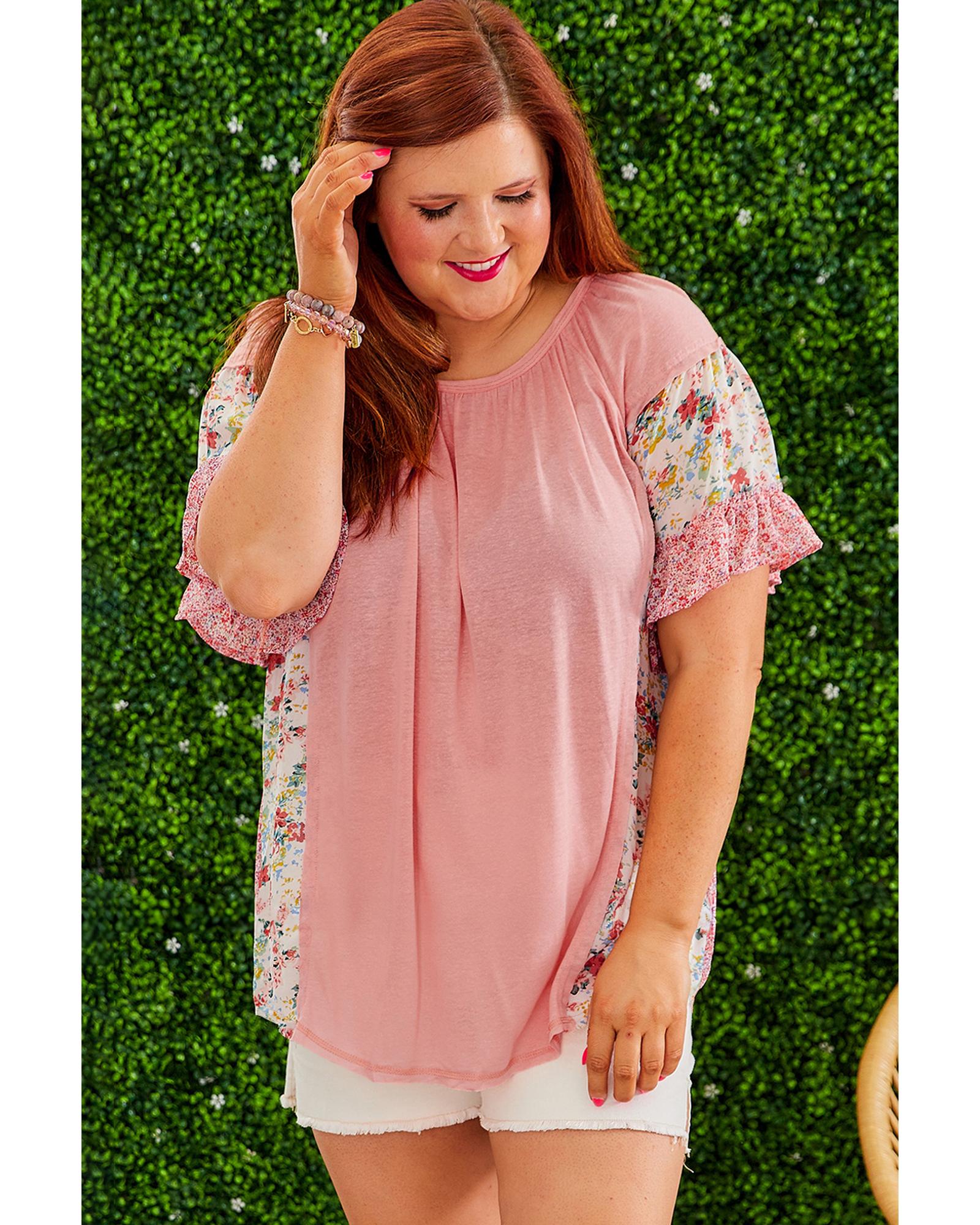 Pink Plus Size Floral Patchwork Ruffled Short Sleeve Blouse – 3X