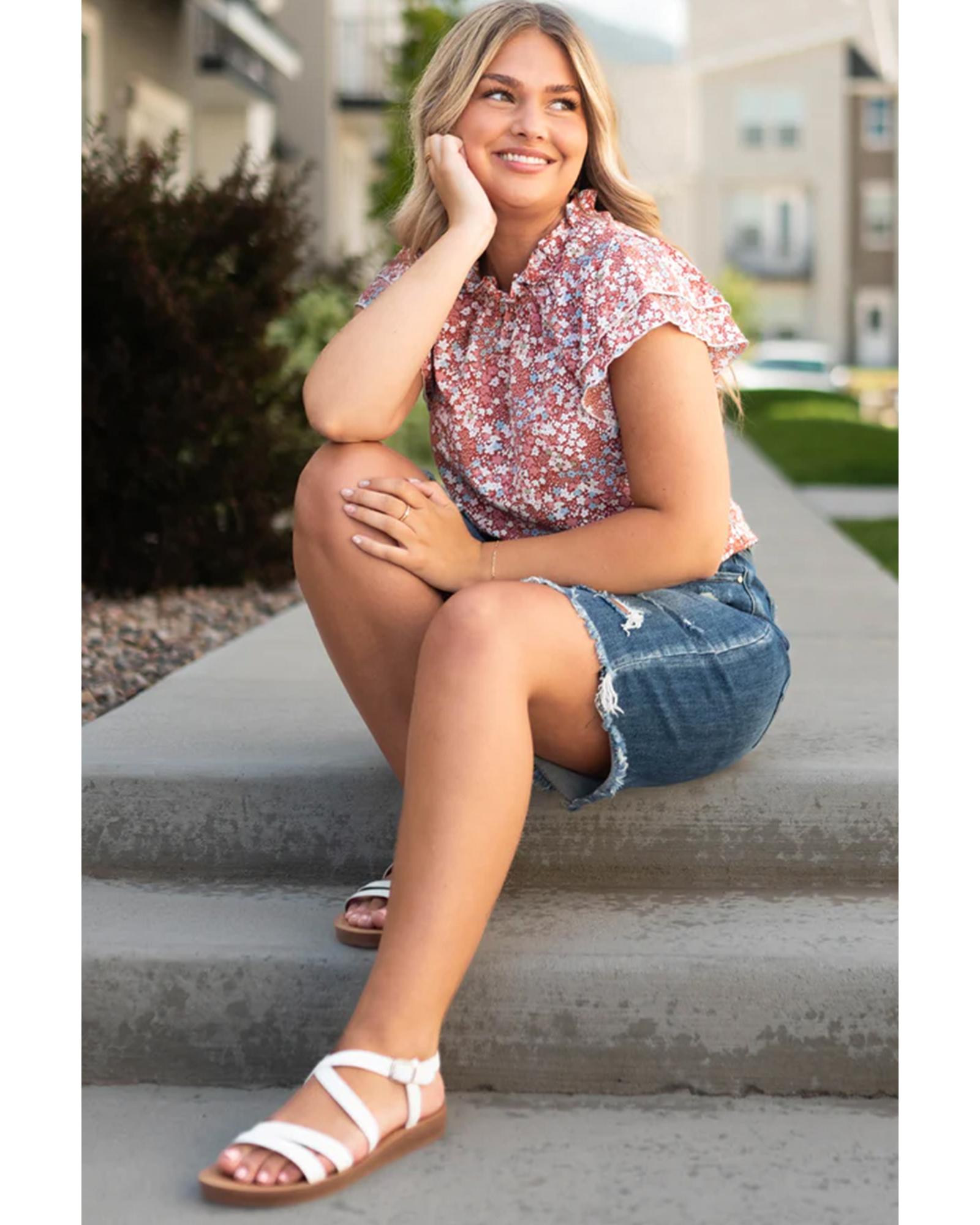Pink Plus Size Floral Print Ruffled Sleeve Frilled Neck Blouse – 1X