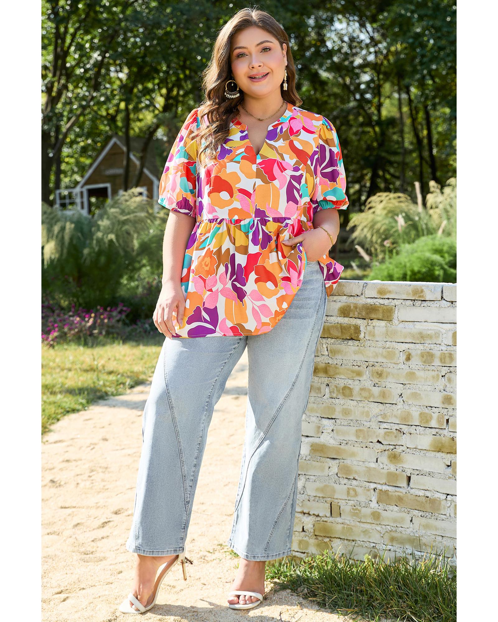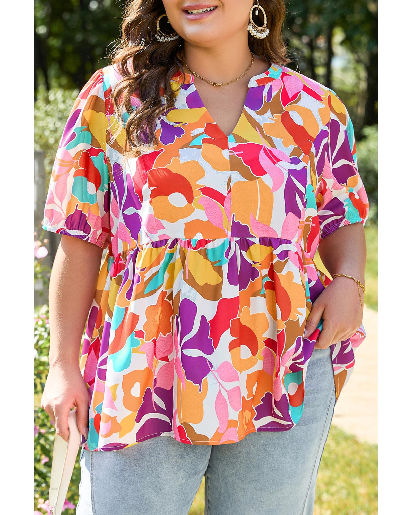 Pink Plus Size Floral Print V Neck Fit and Flare Blouse – 4X