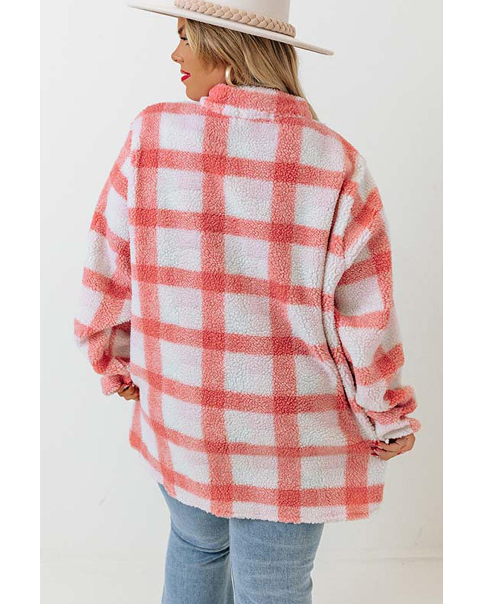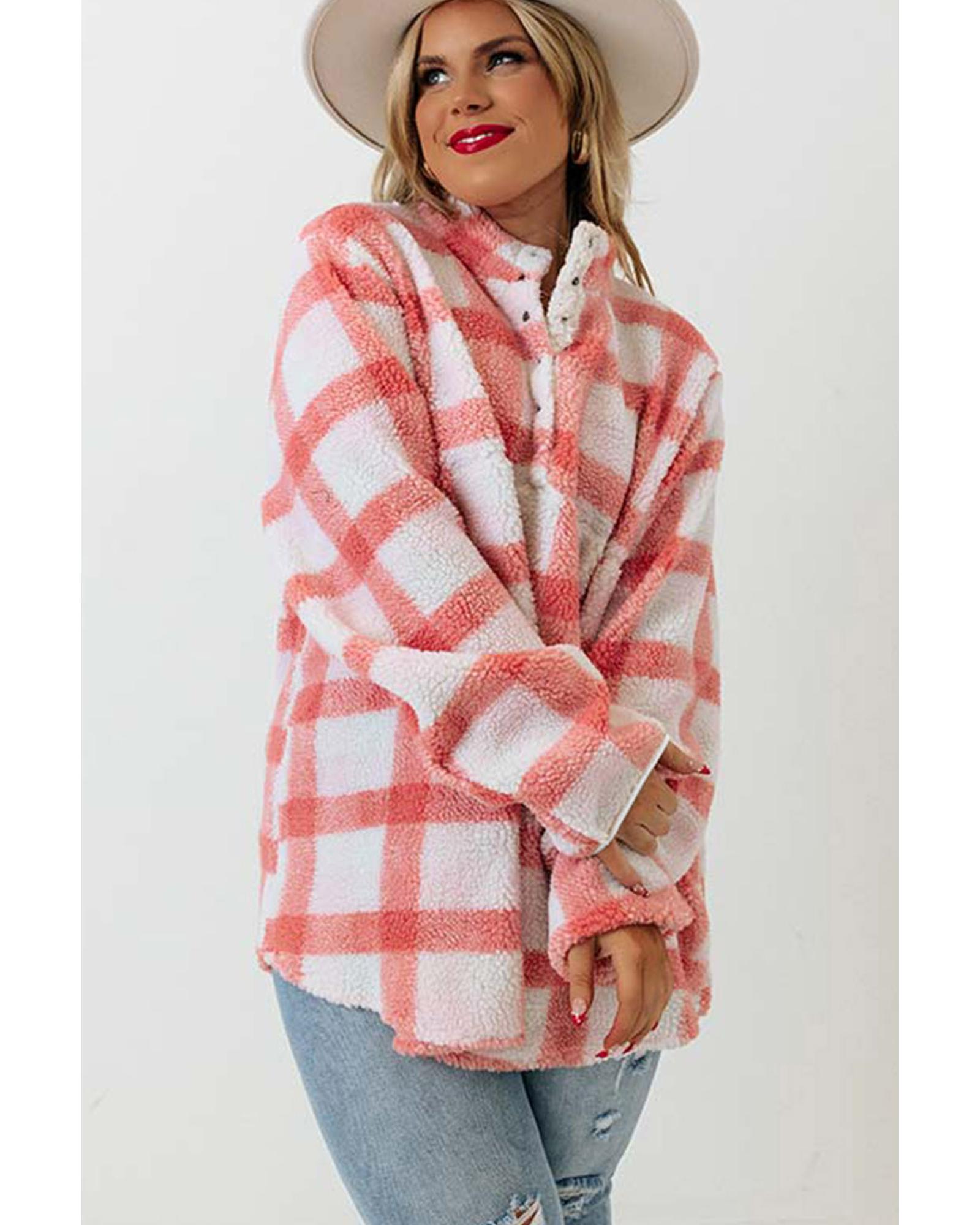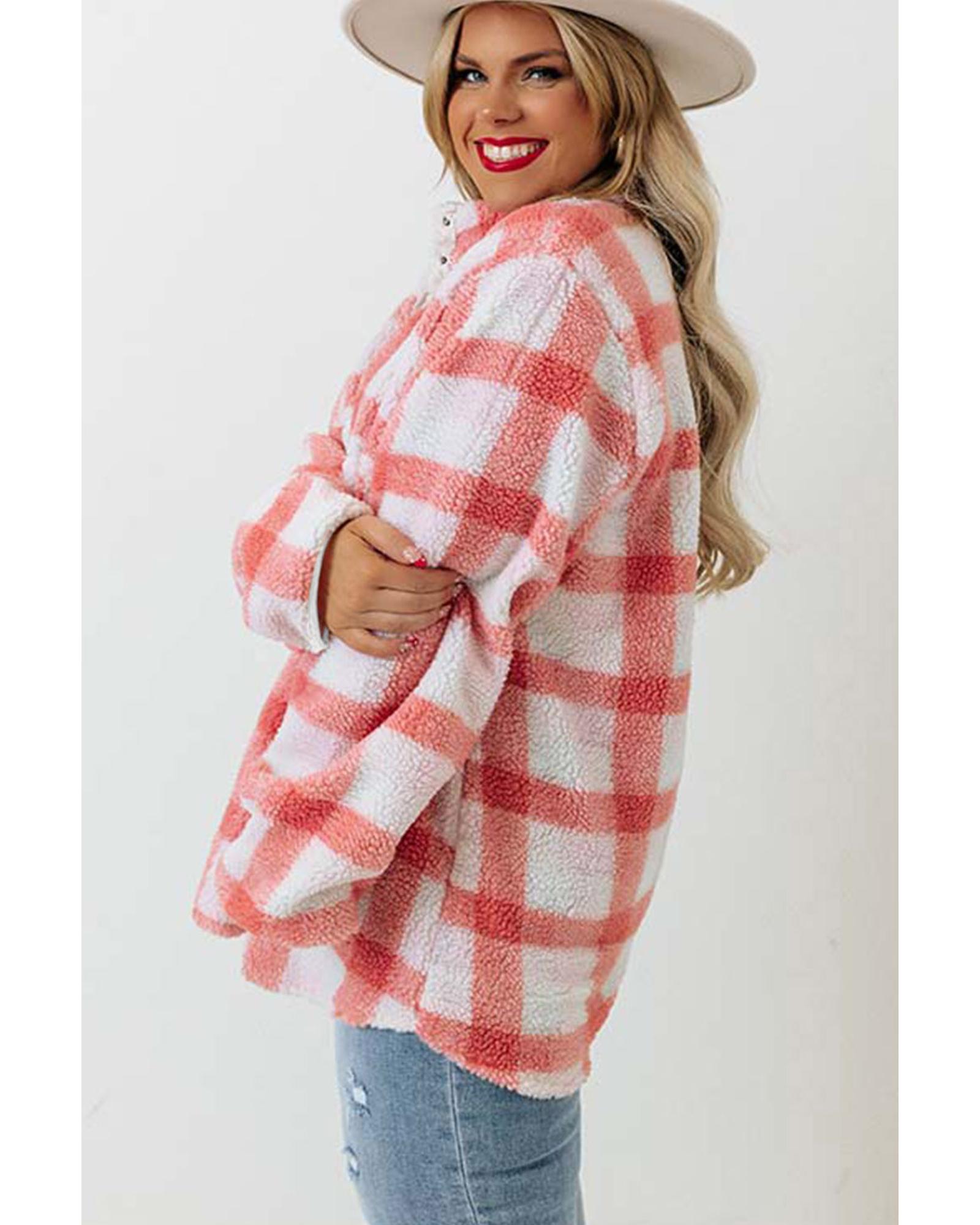 Pink Plus Size Tunic Plaid Sherpa Henley Sweatshirt – 1X