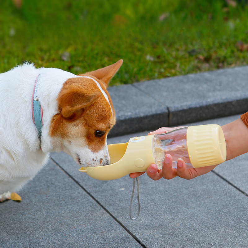 Portable Dog Water Bottle with Bowl Dispenser ? This travel-friendly pet water bottle holds 250ml of water and 180ml of food, perfect for keeping your dog hydrated and fed on the go. Its leak-proof design ensures no spills in your bag, and the integrated bowl makes it easy to serve your pet with just one hand. Ideal for walks, hikes, and outdoor adventures. Made from BPA-free plastic, safe for your pet.
