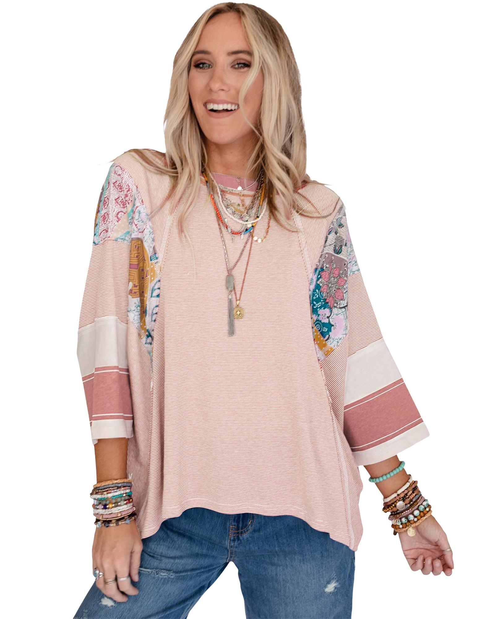 Pink Printed Pinstriped Color Block Patchwork Oversized Top – M