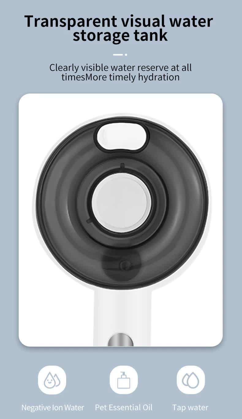• Gentle Mist Spray Function: Features a refillable water tank (approx. 30ml) and two spray modes (light & heavy). The mist helps to slightly dampen fur, reducing static, making brushing smoother, and potentially helping with light cleaning or deodorizing.