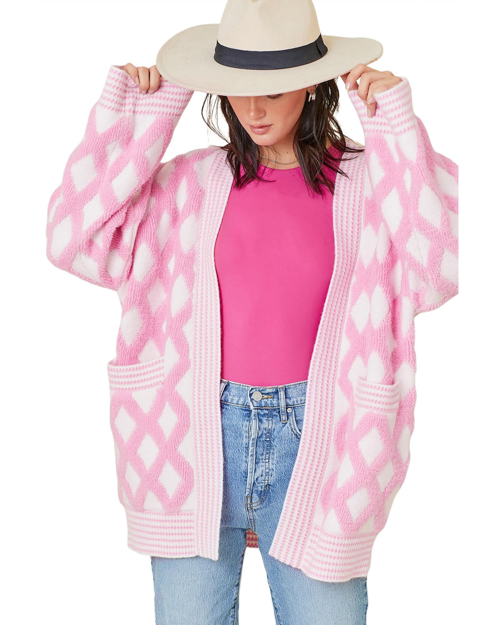 • Pink Rhombus Pattern Knit Open Front Pocketed Cardigans