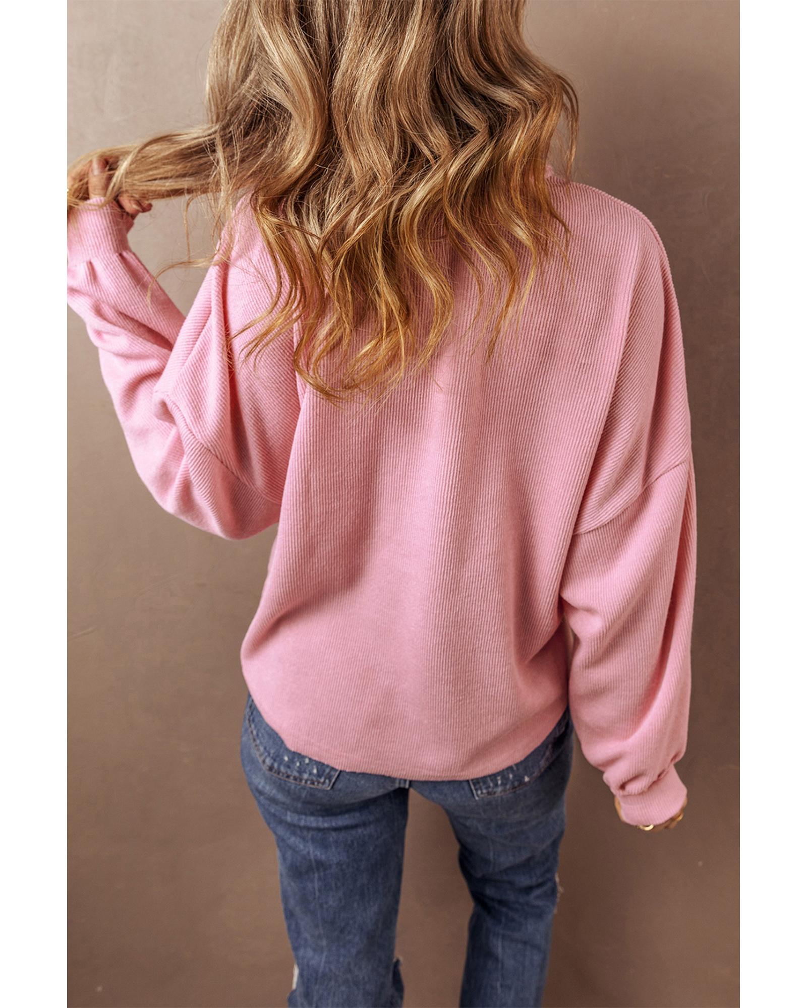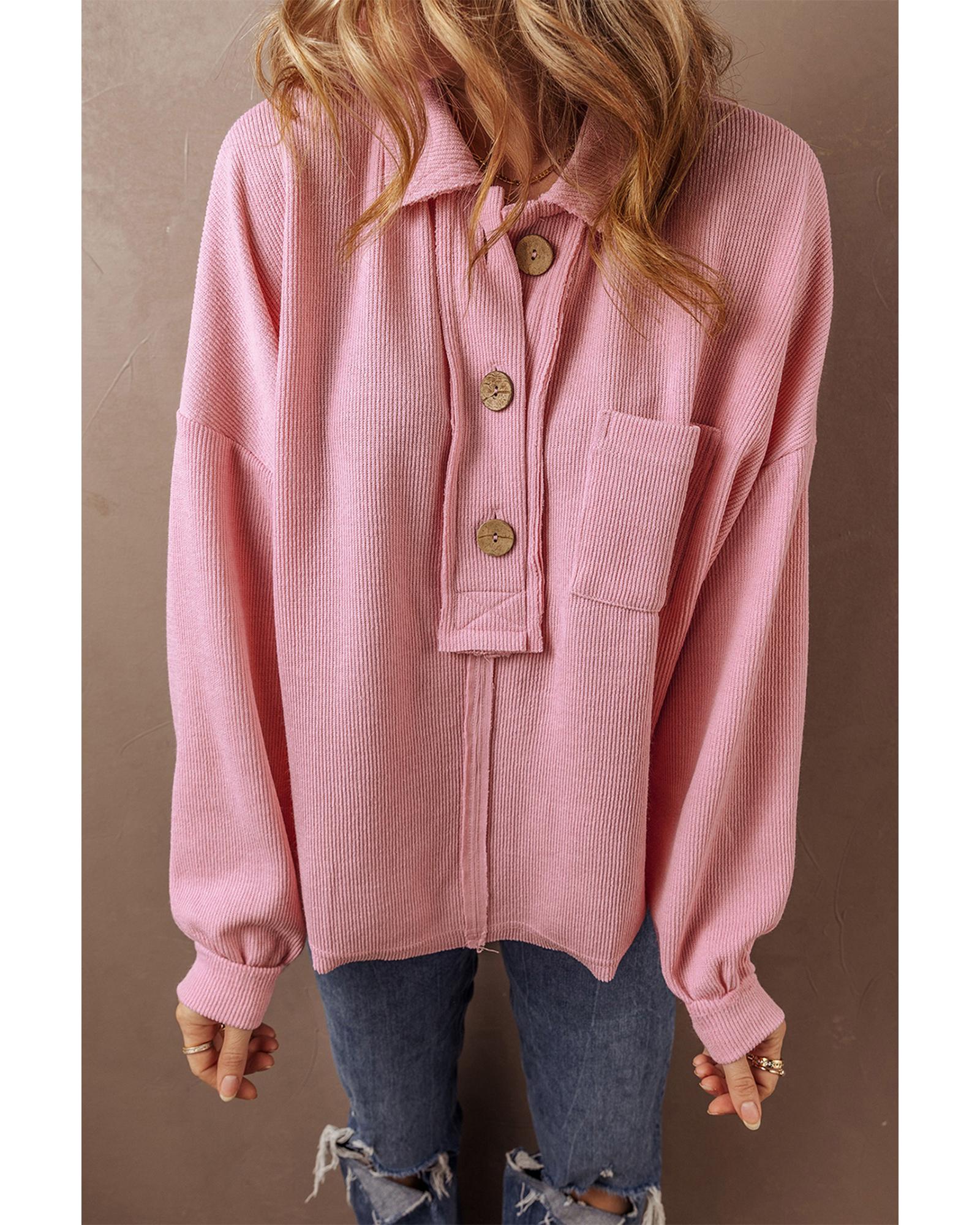 Pink Ribbed Knit Collared Henley Top with Chest Pocket – M