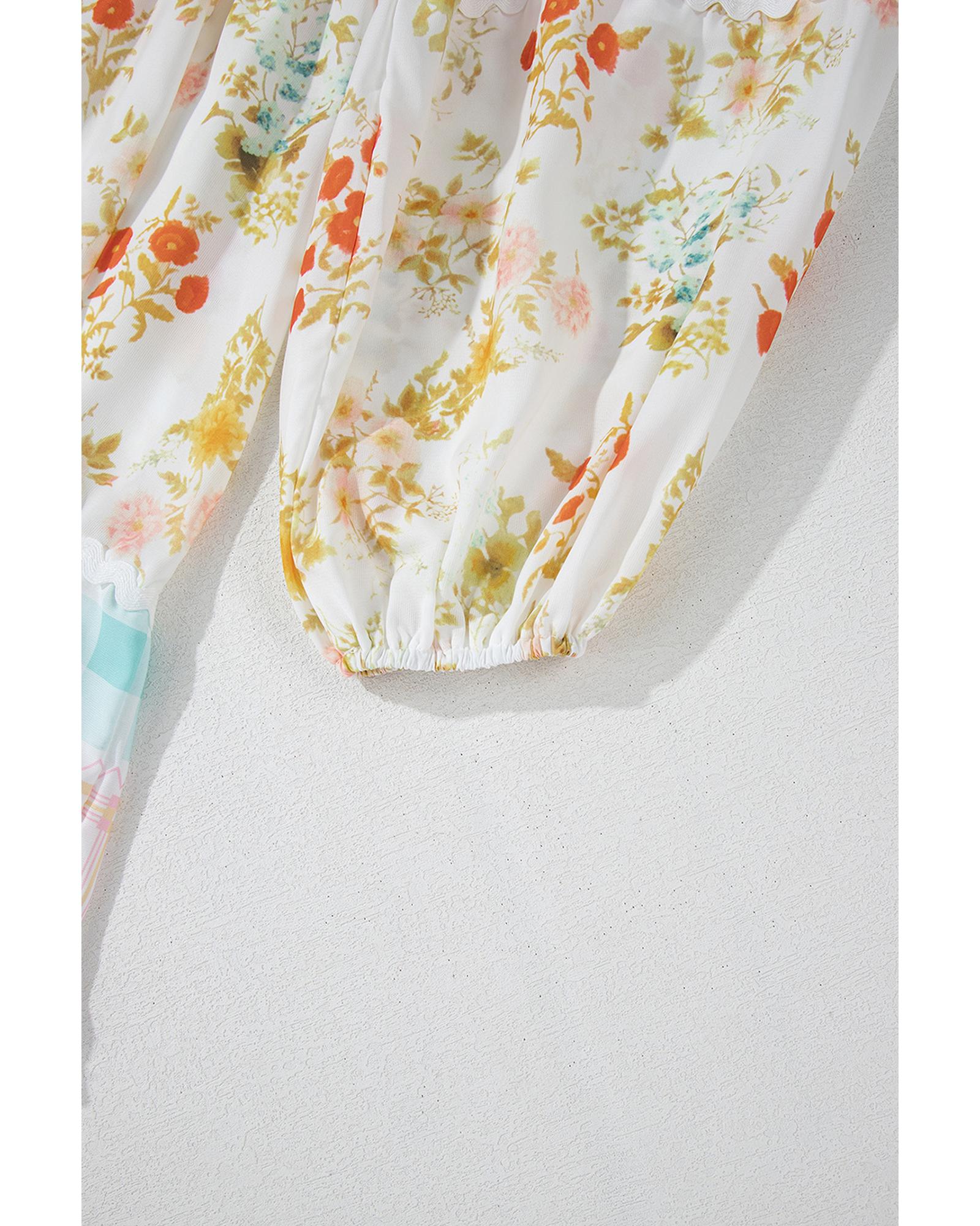 Pink Ric Rac Plaid Floral Print Patchwork Bubble Sleeve Dress – L