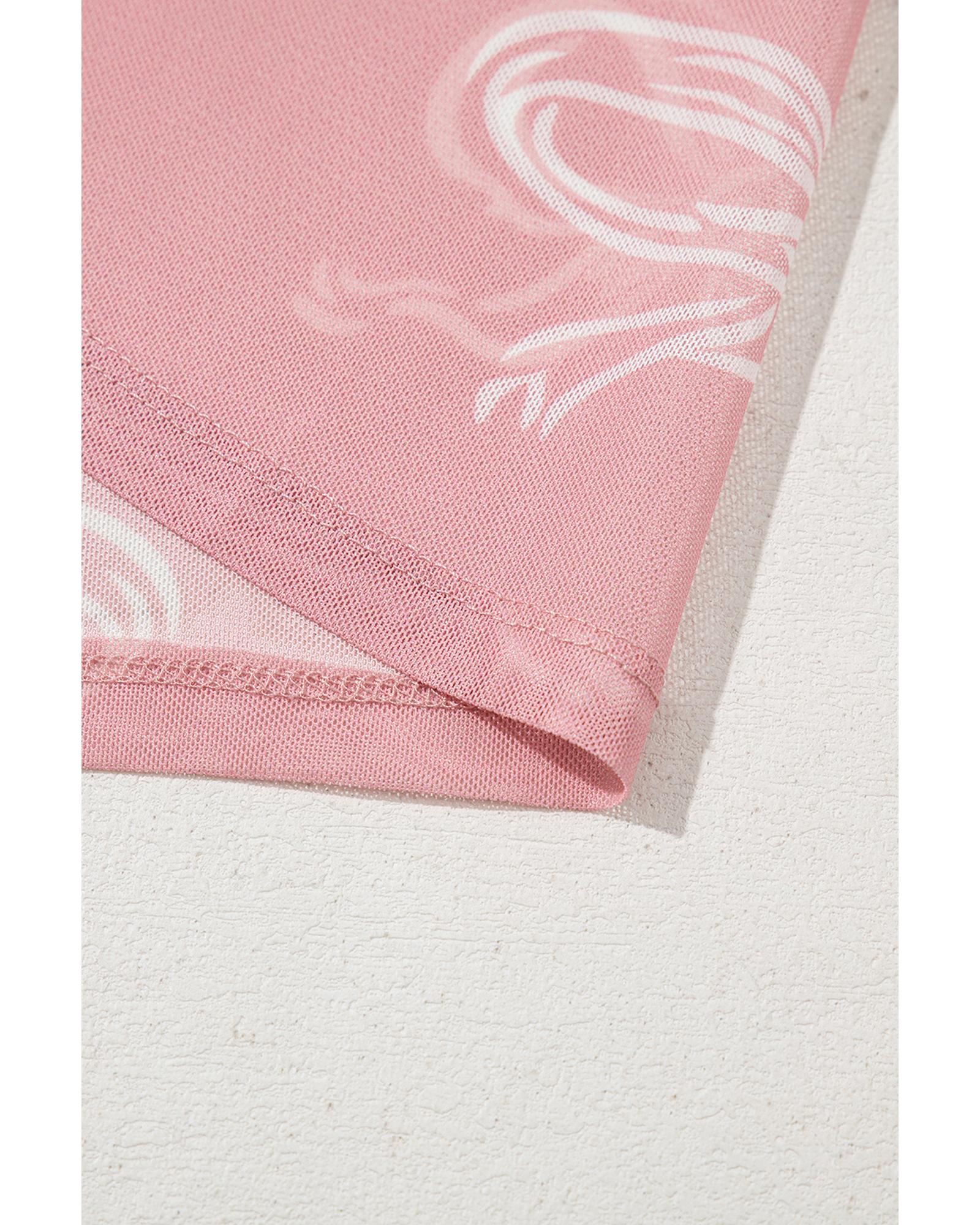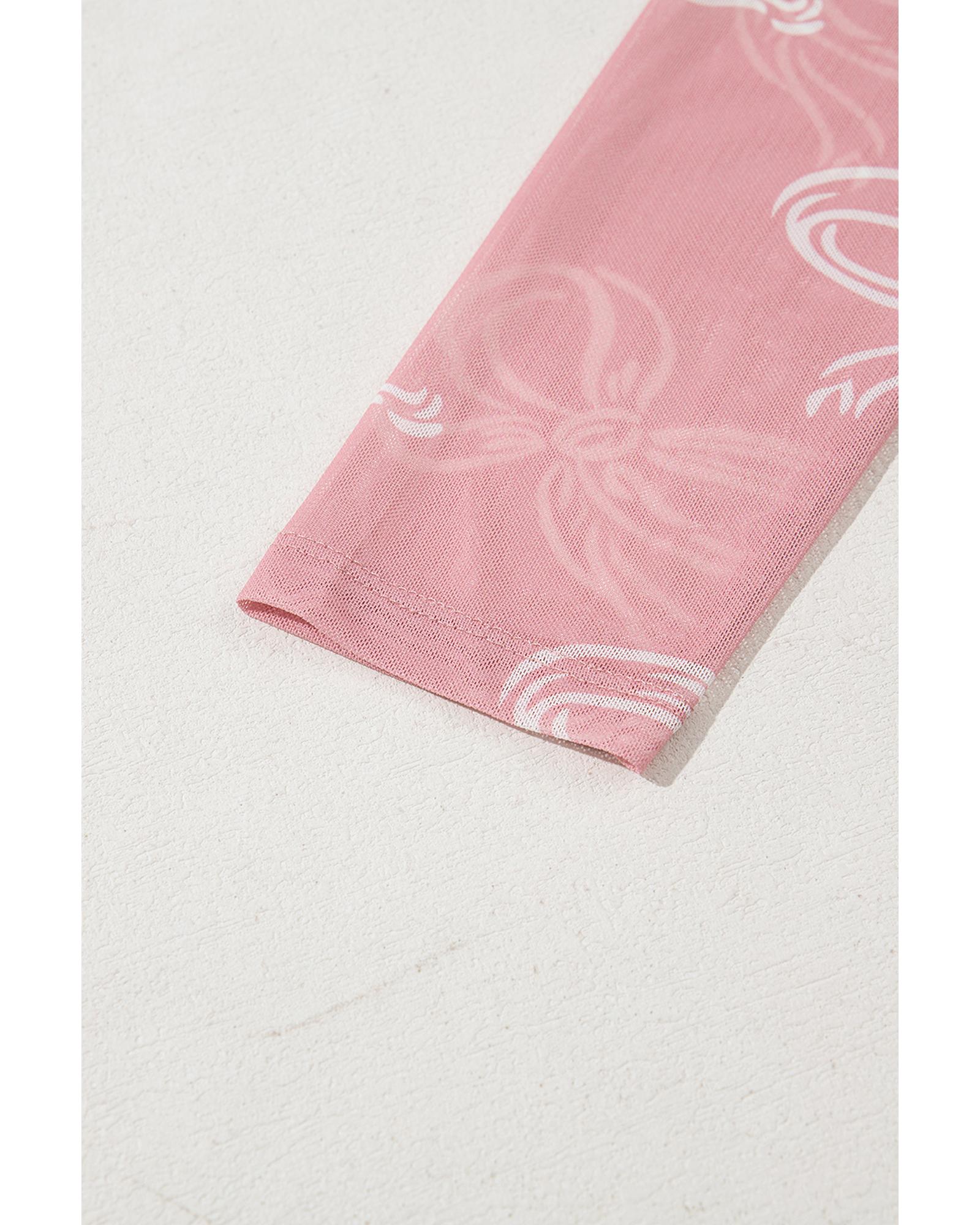 Pink Round Neck Bow Print Long Sleeve Mesh Top – L