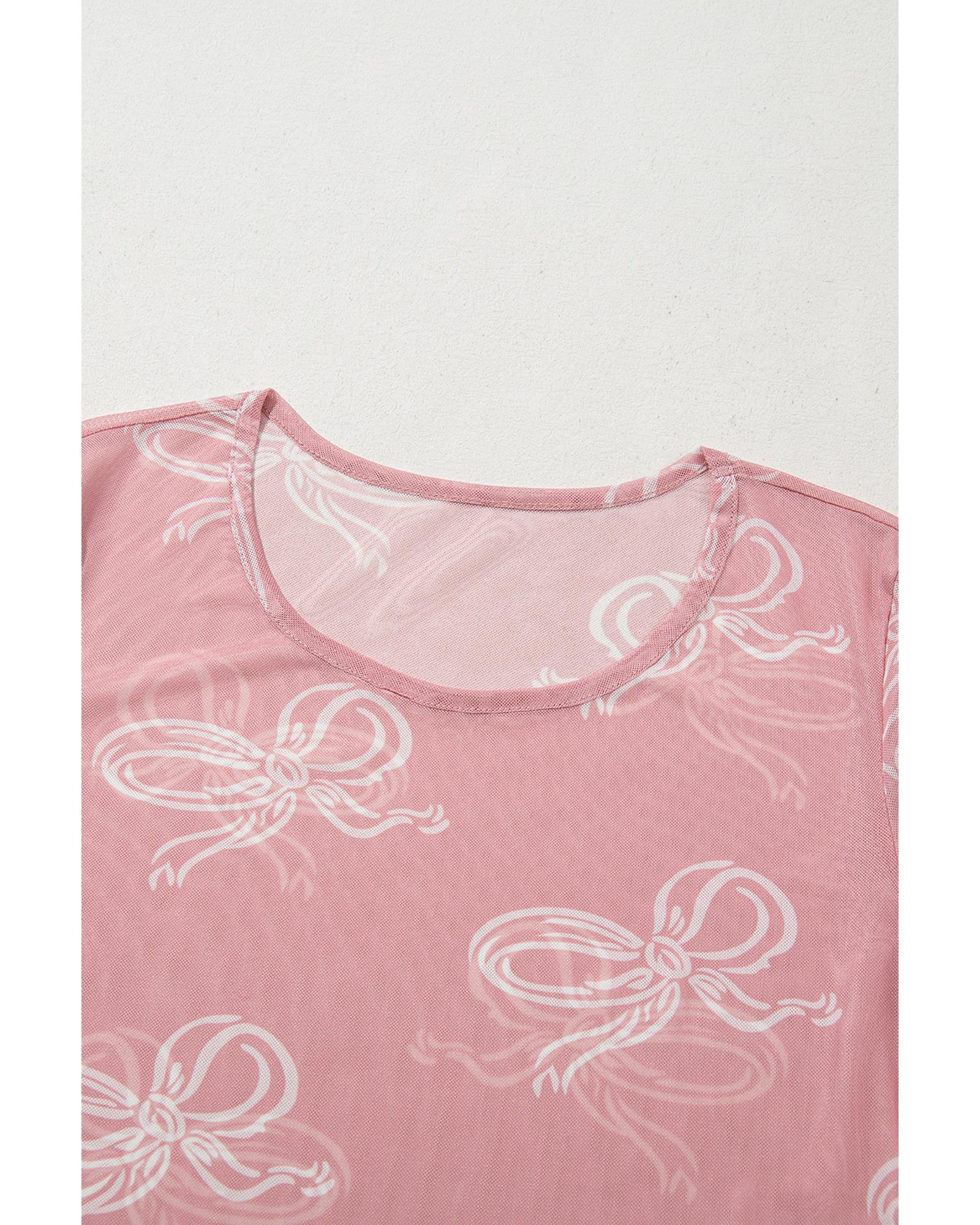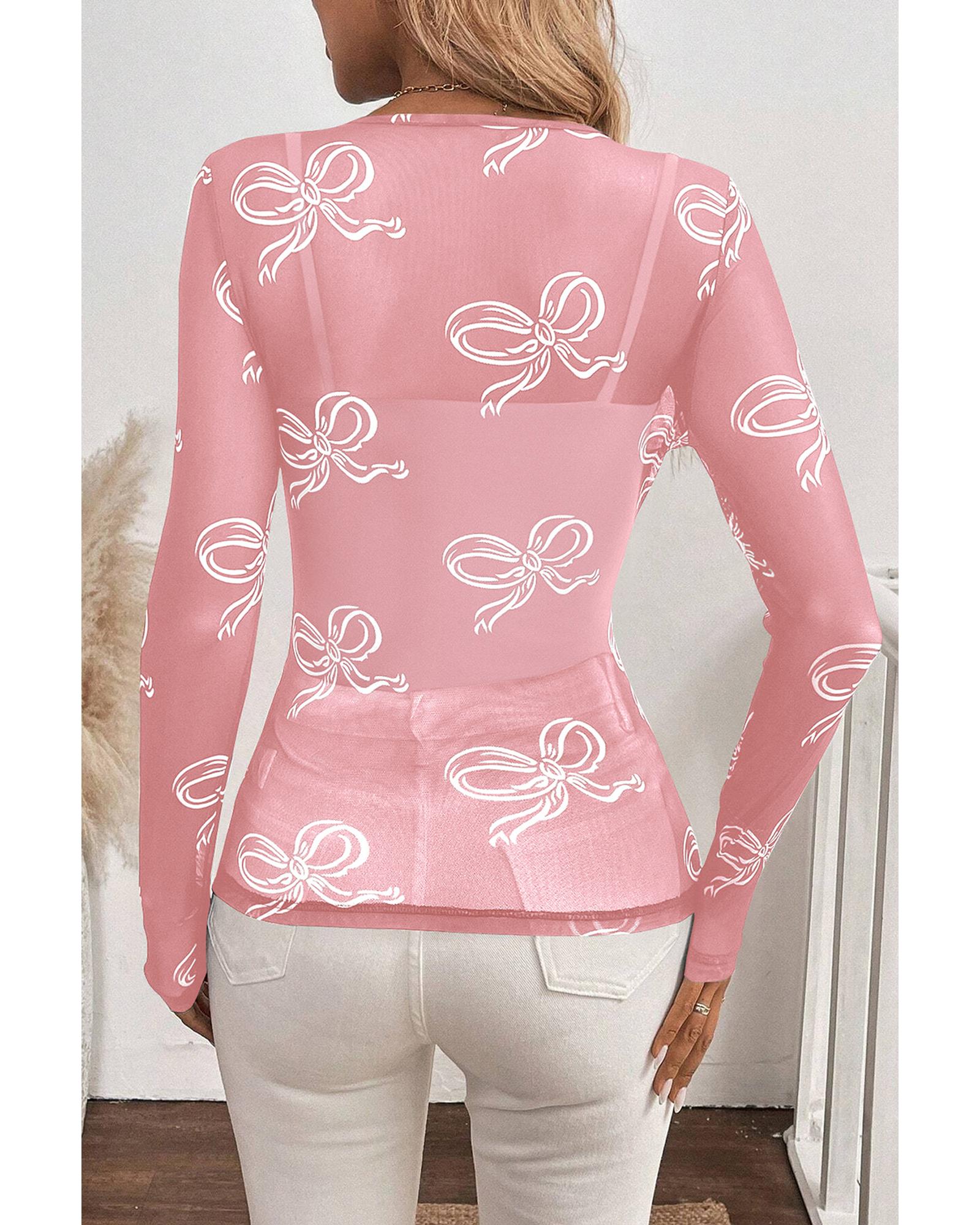 Pink Round Neck Bow Print Long Sleeve Mesh Top – M