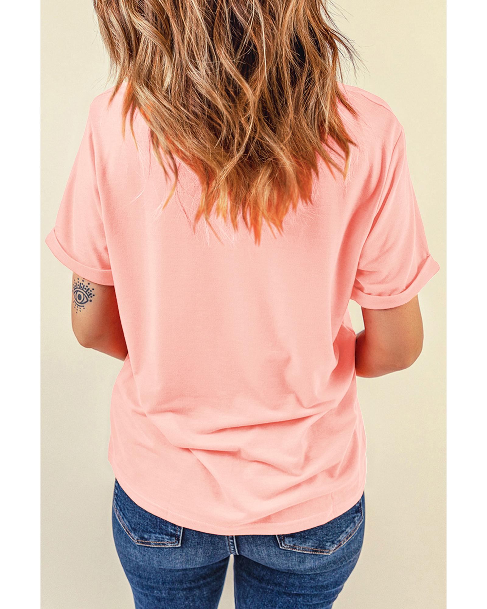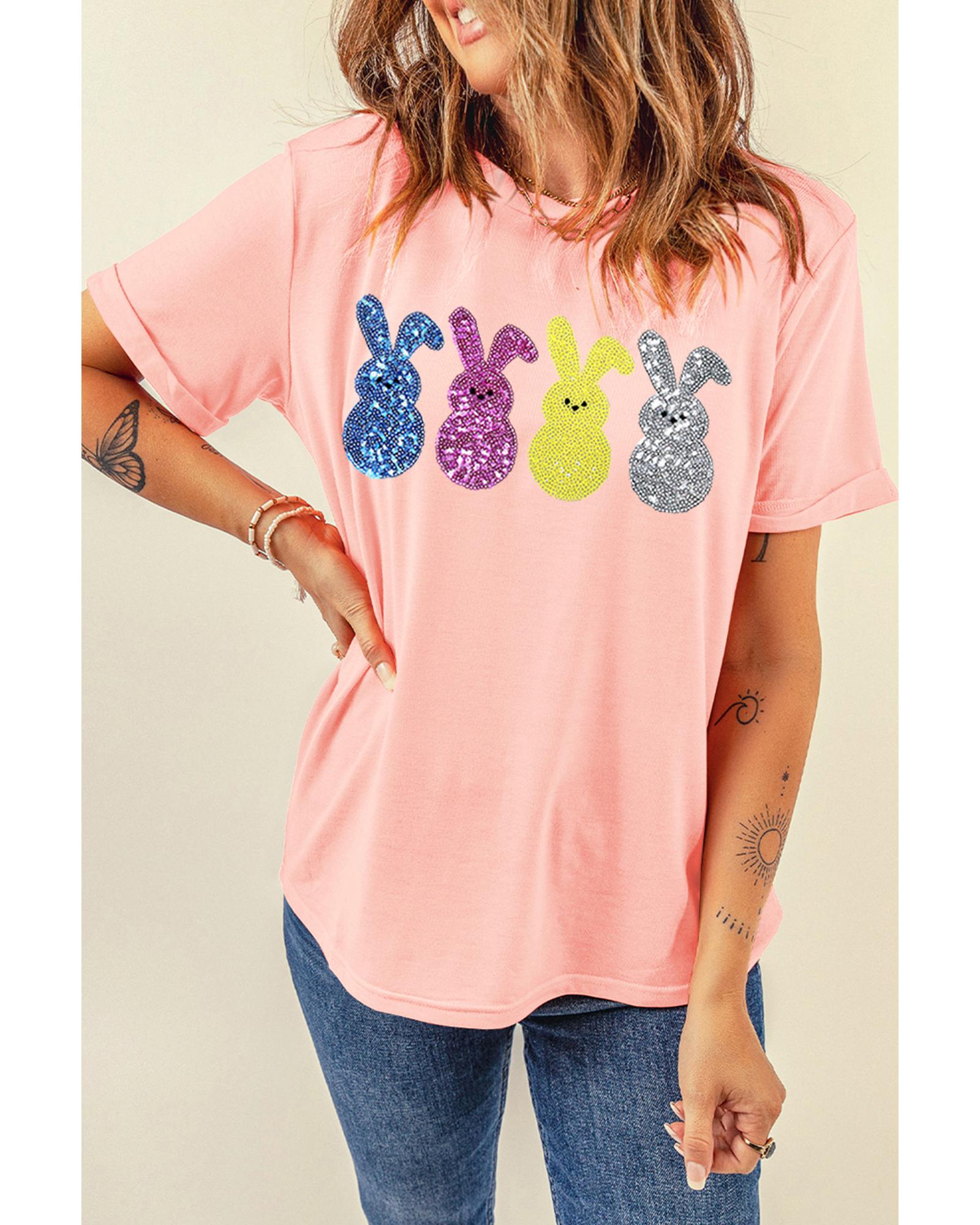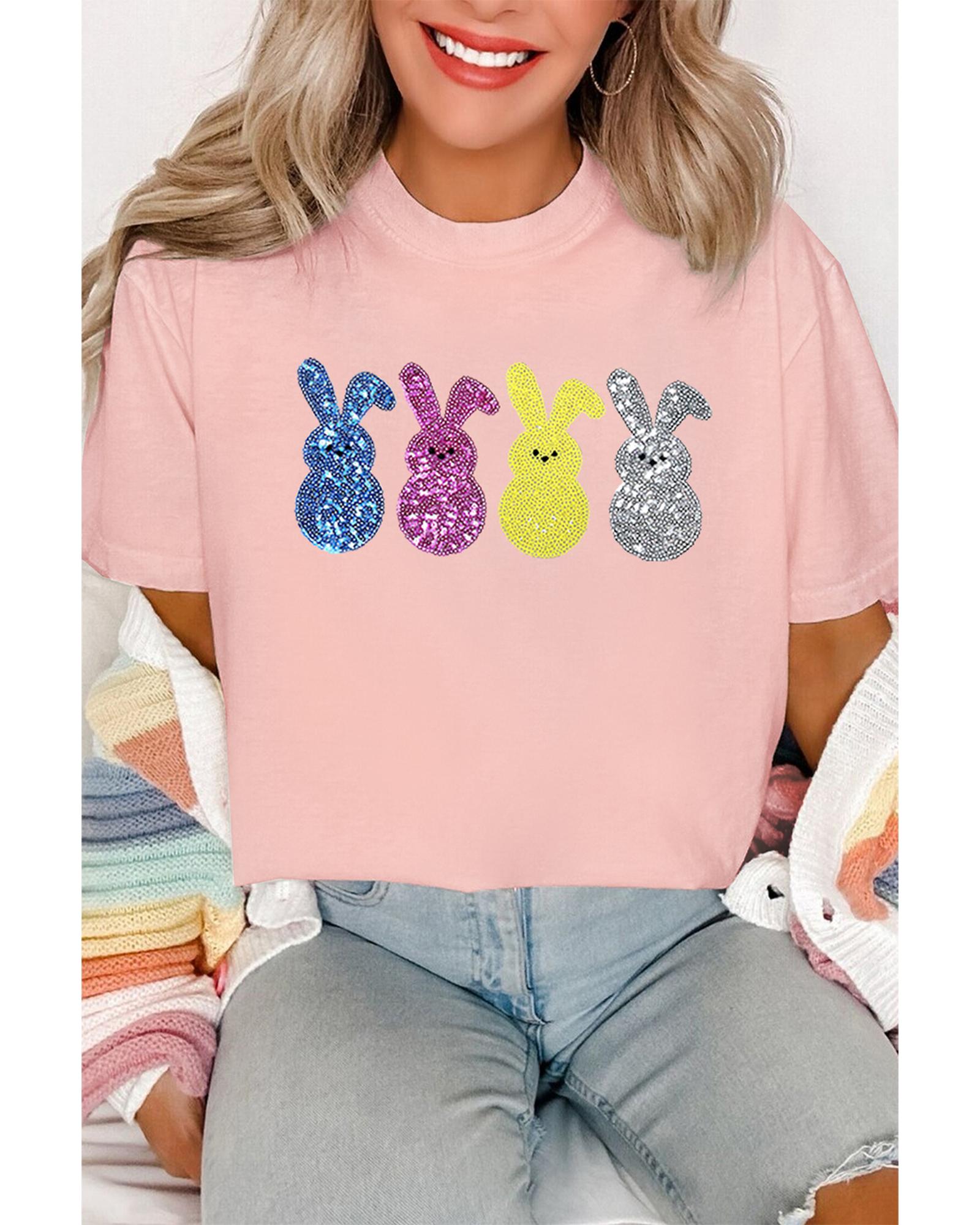 Pink Sequin Cute Bunny Graphic Easter Fashion Tee – L