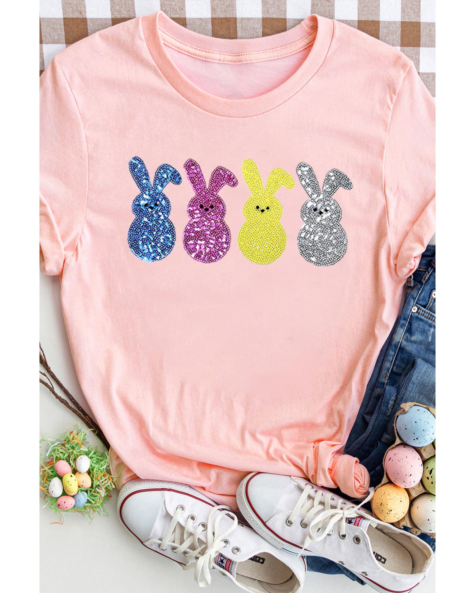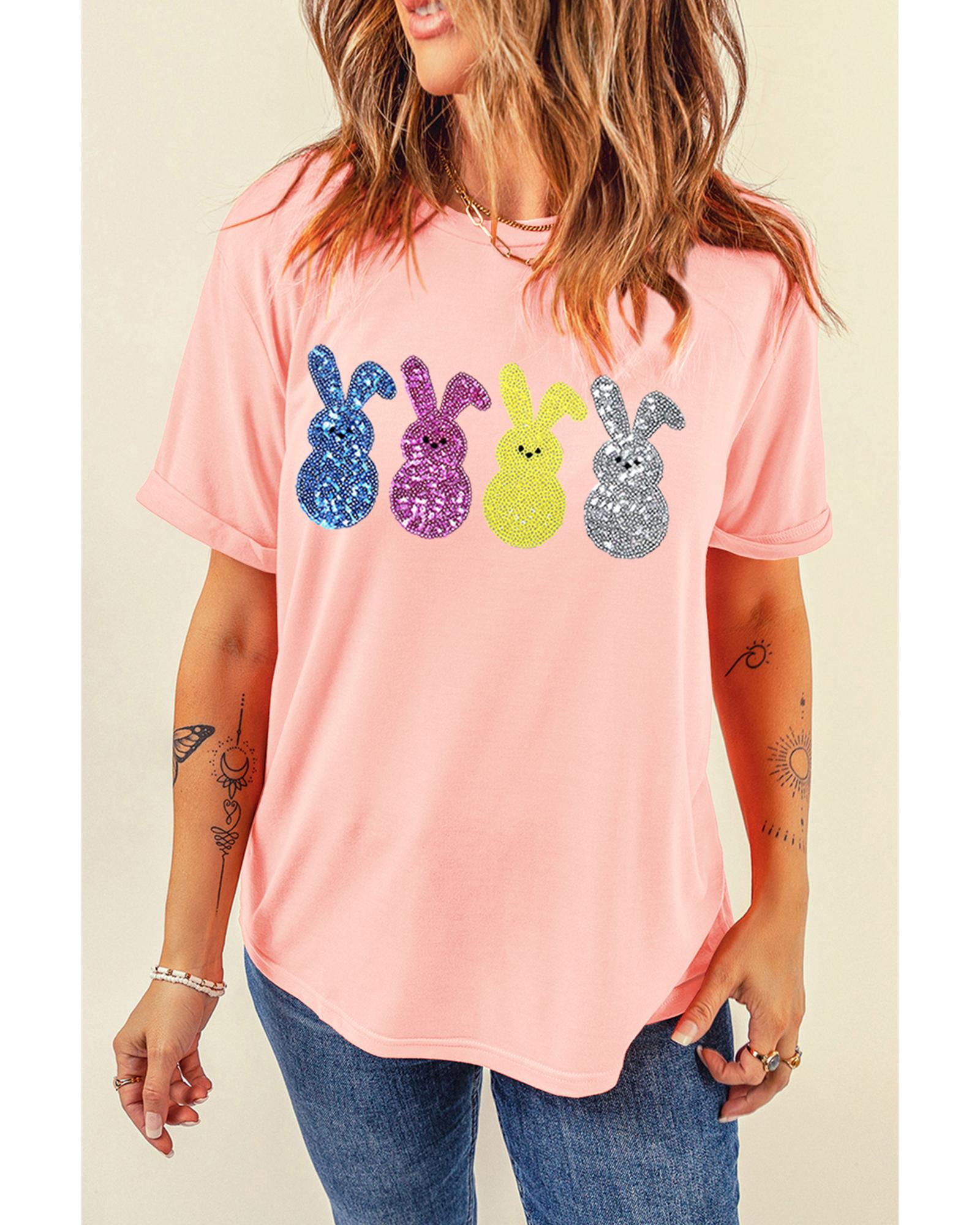 Pink Sequin Cute Bunny Graphic Easter Fashion Tee – M