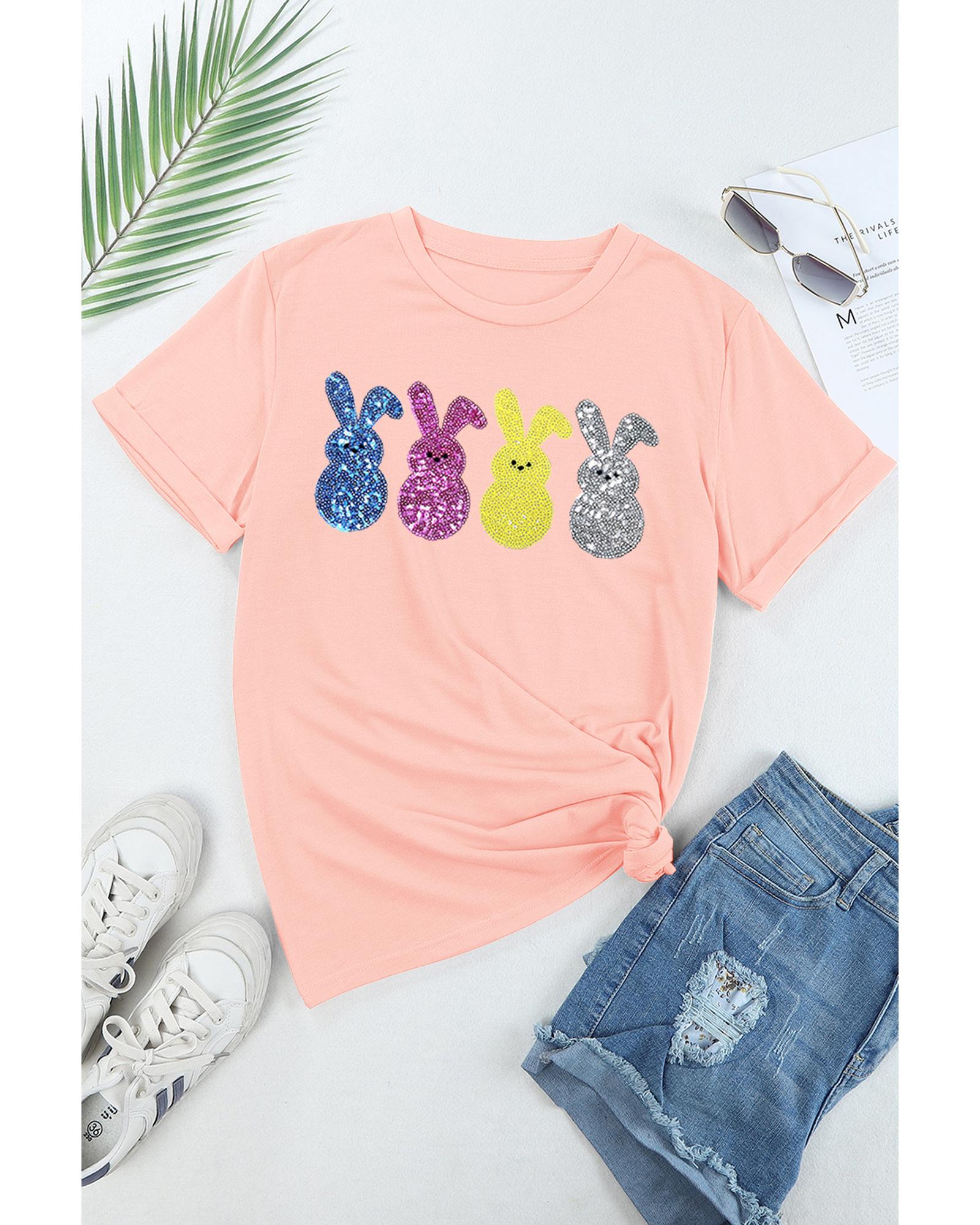 Pink Sequin Cute Bunny Graphic Easter Fashion Tee – S