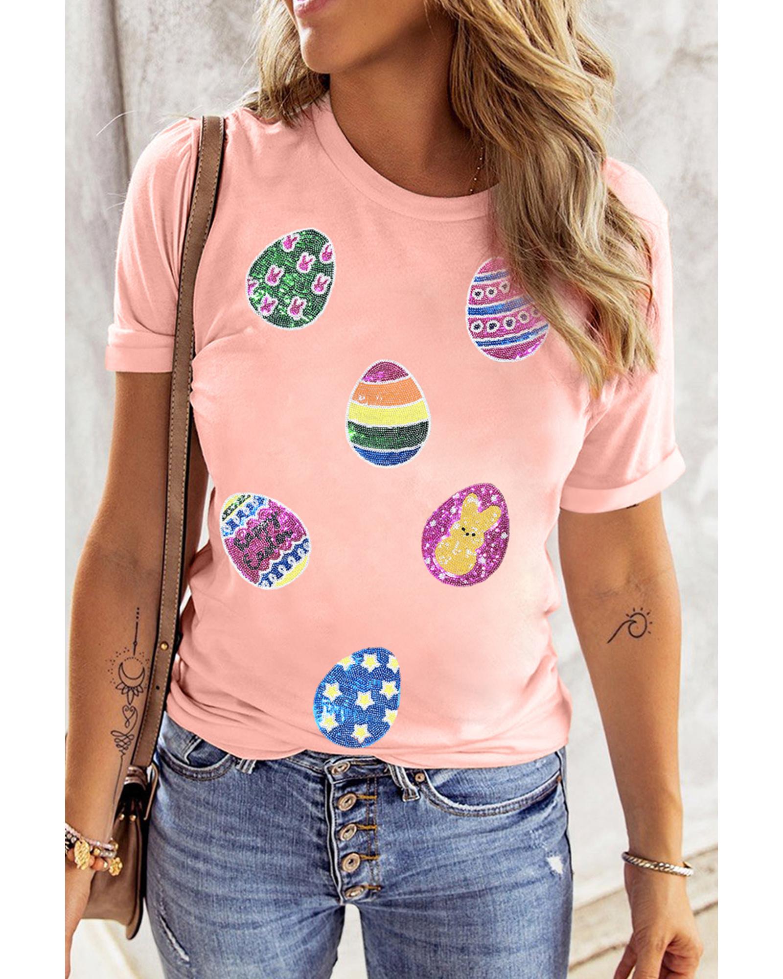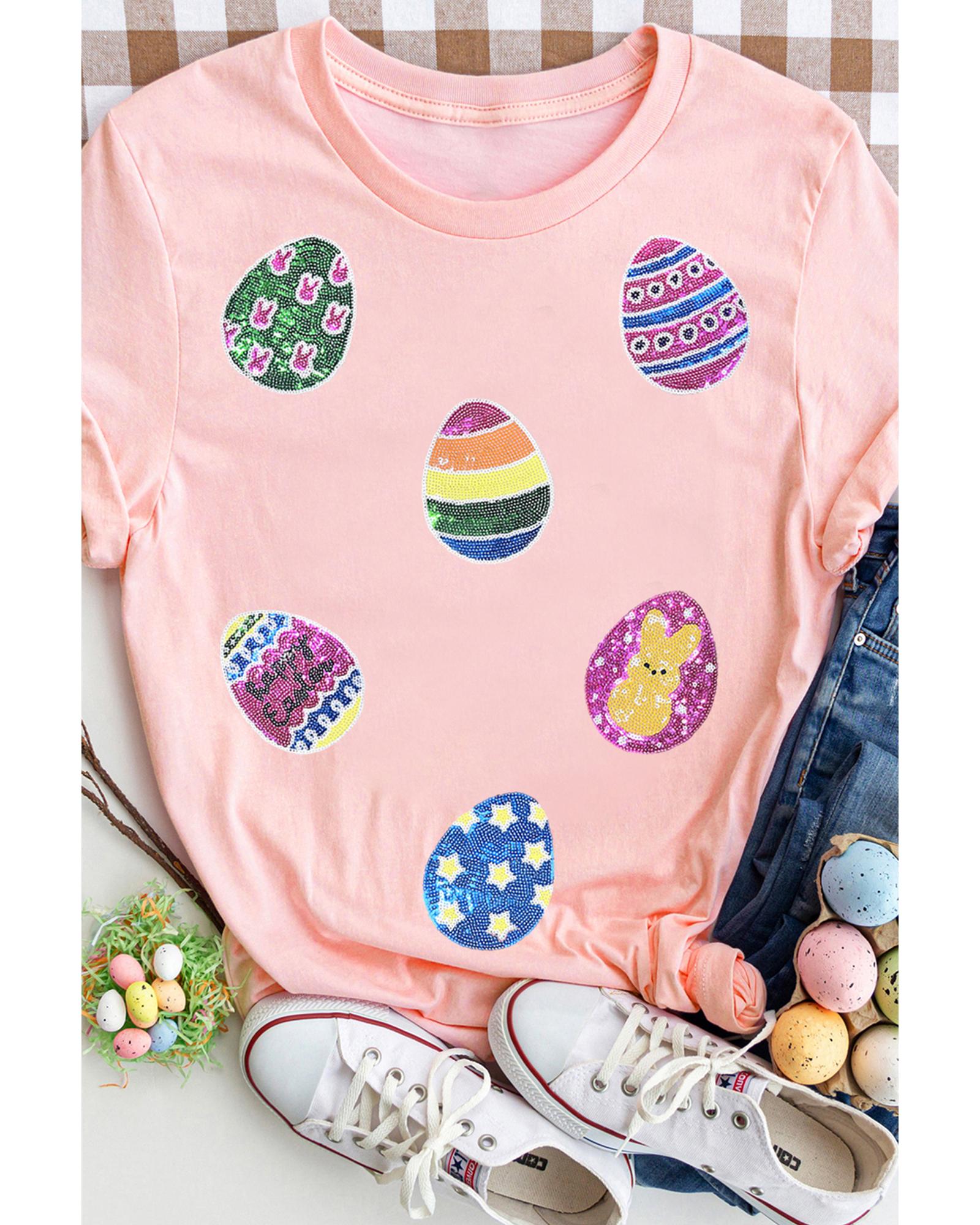 Pink Sequin Easter Eggs Graphic Crewneck T Shirt – S