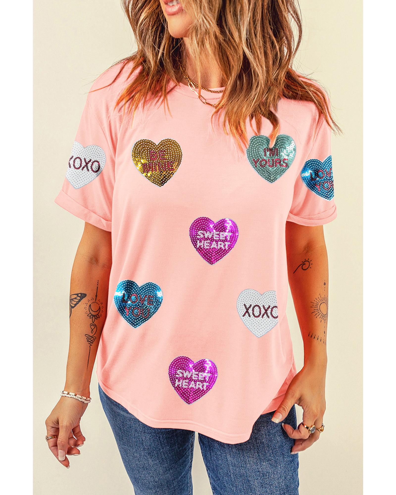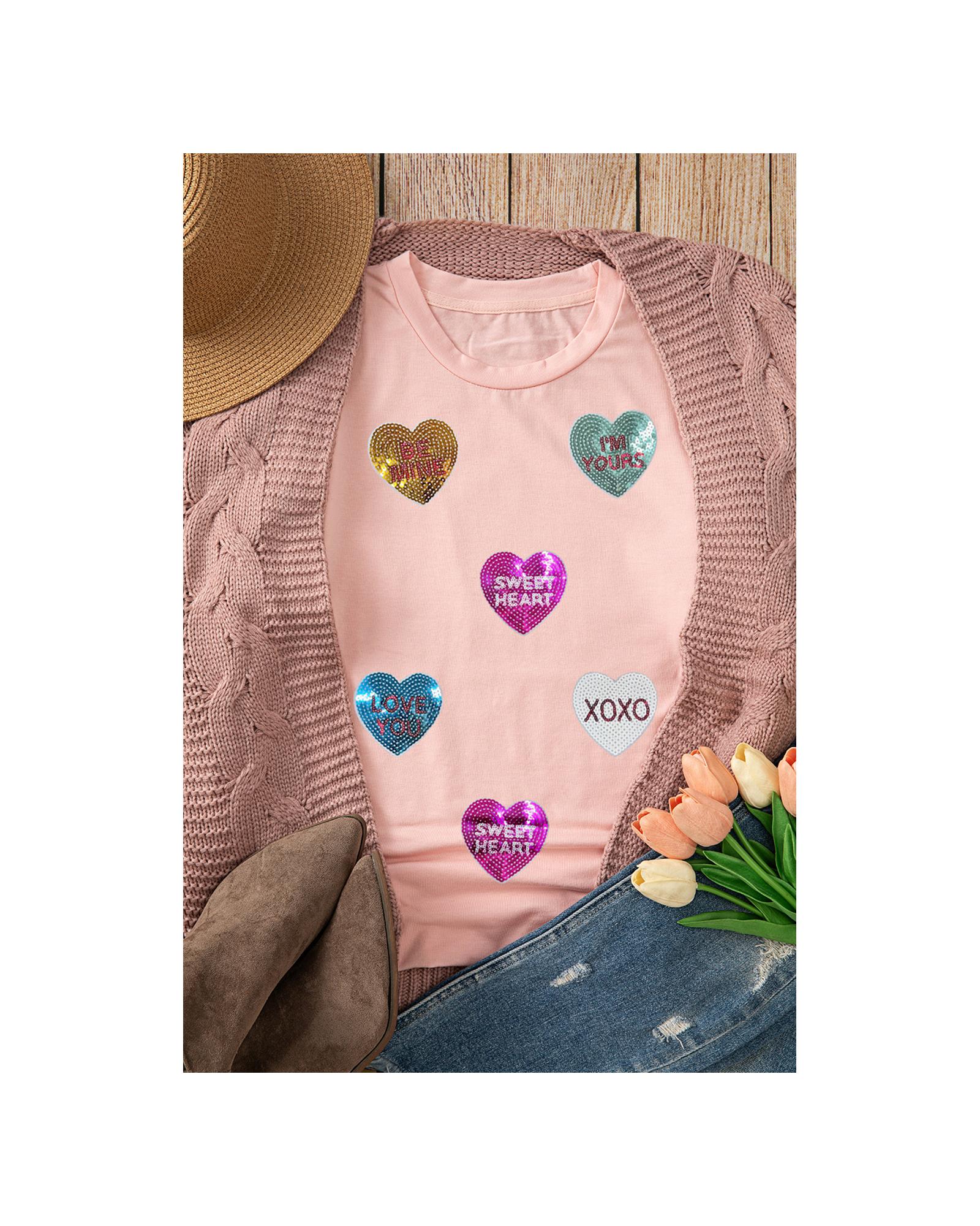 Pink Sequin Valentines Lettering Heart Patched Crewneck T Shirt – L