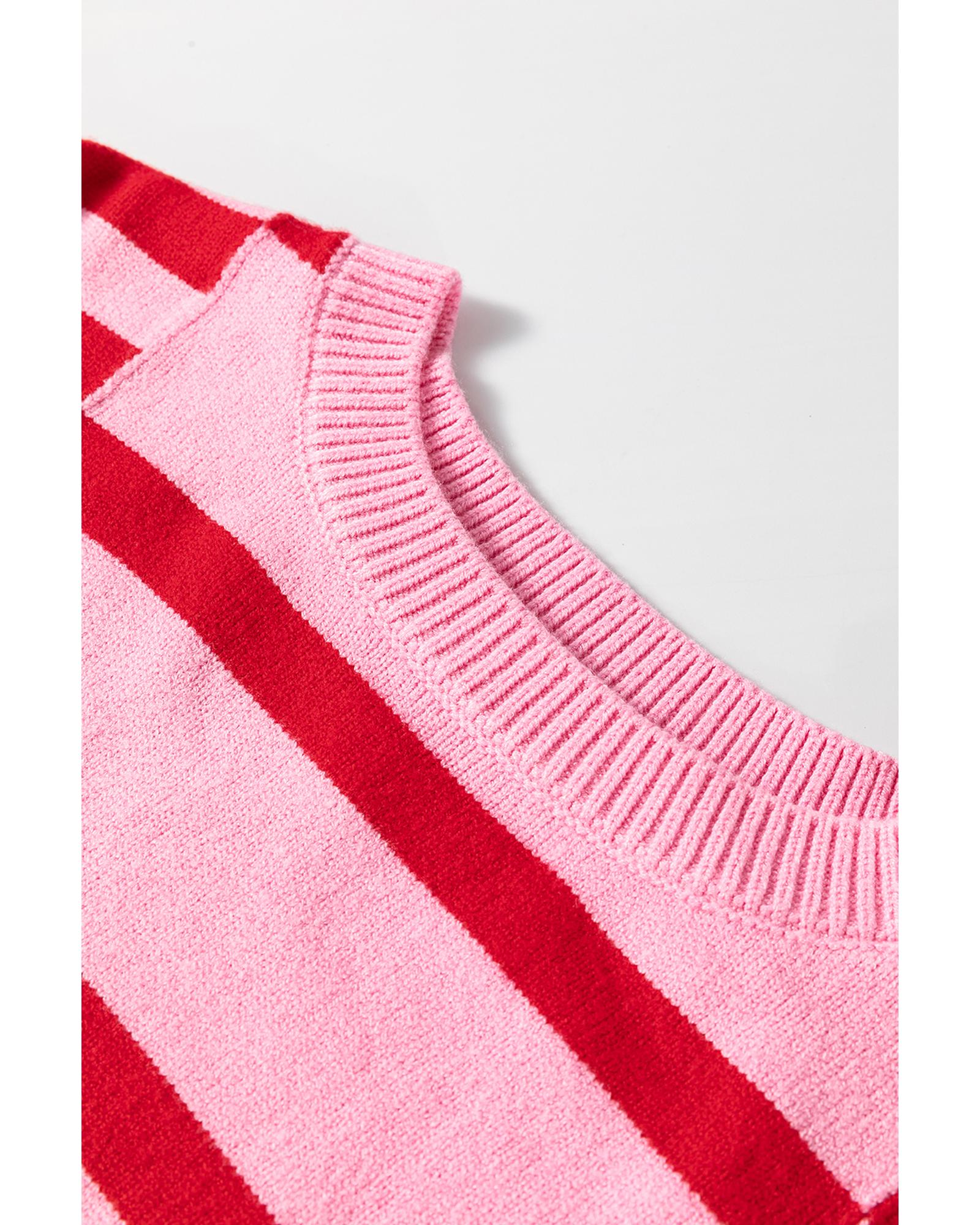 Pink Stripe Bubble Sleeve Drop Shoulder Ribbed Trim Sweater – M