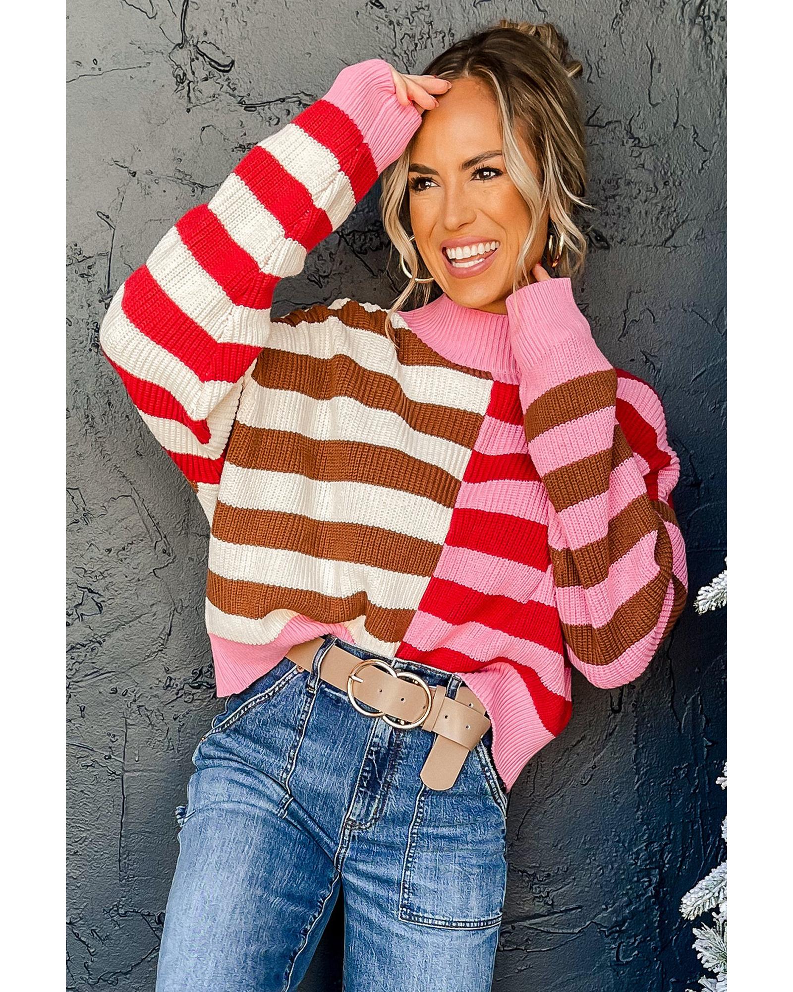 Pink Stripe Color Block High Neck Drop Shoulder Loose Sweater – L