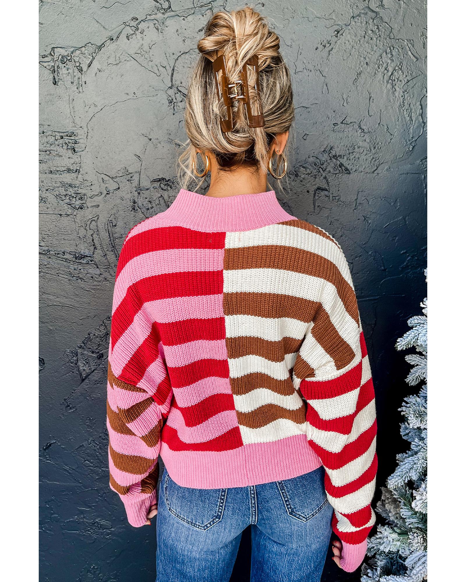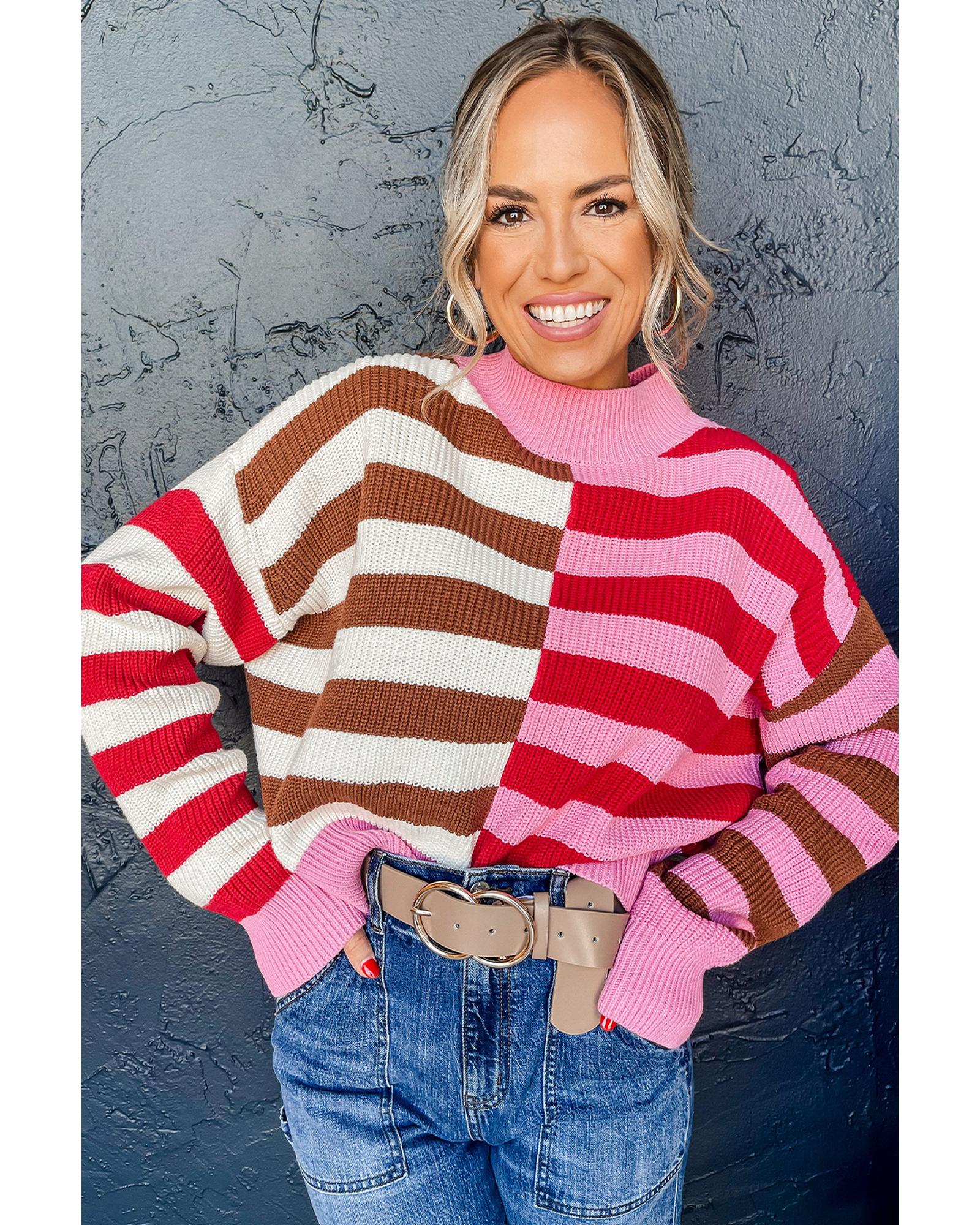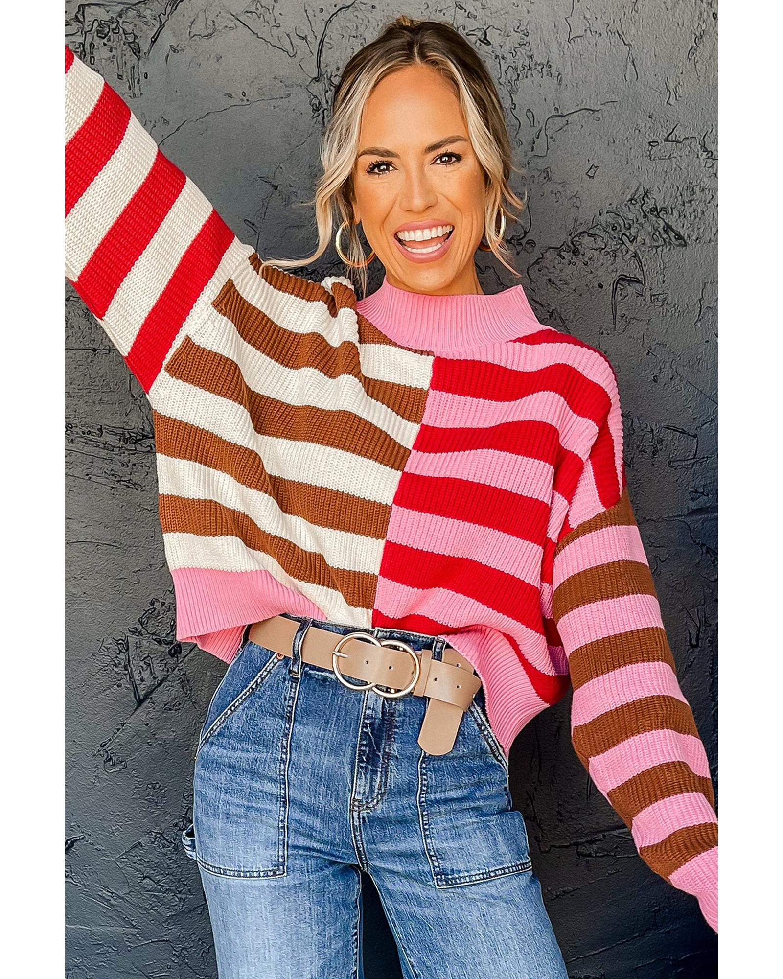 Pink Stripe Color Block High Neck Drop Shoulder Loose Sweater – XL