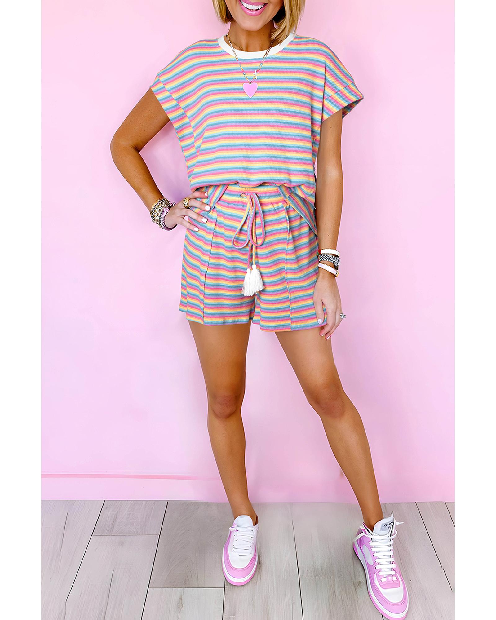 Pink Stripe Crew Neck Tee and Tasseled Drawstring Shorts Set – S