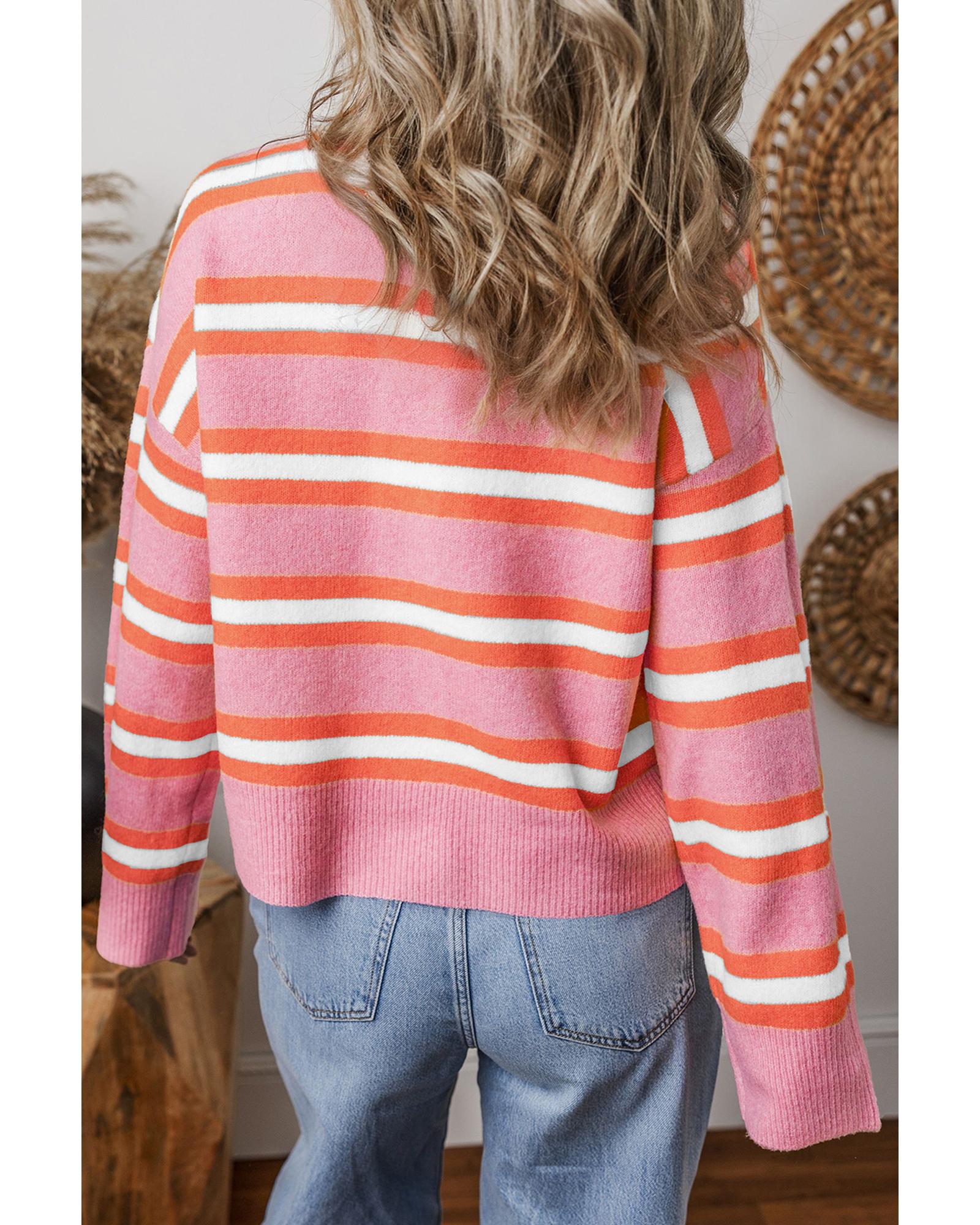 - Pink Stripe Drop Shoulder Buttons Cardigan Sweater