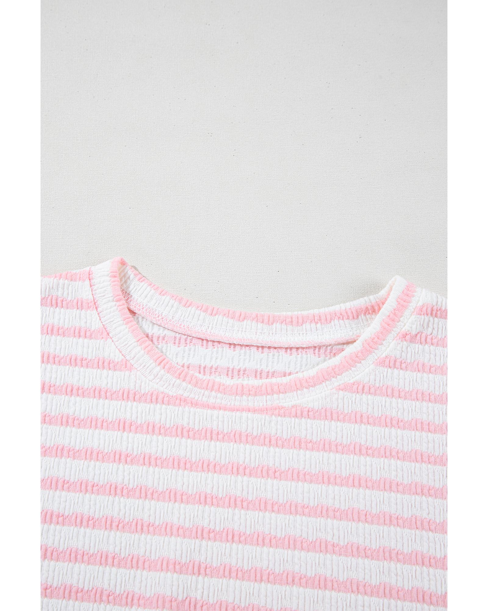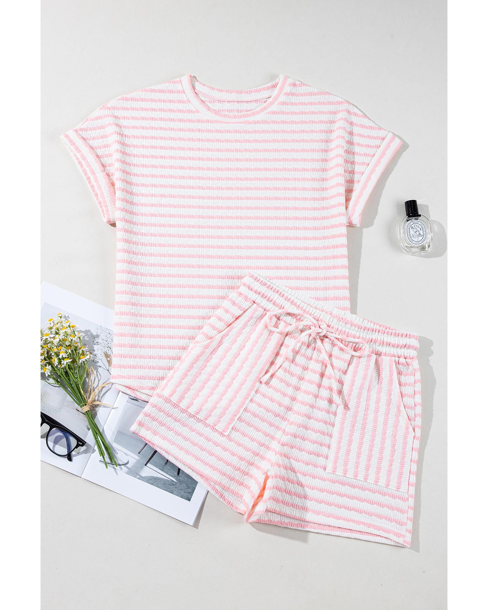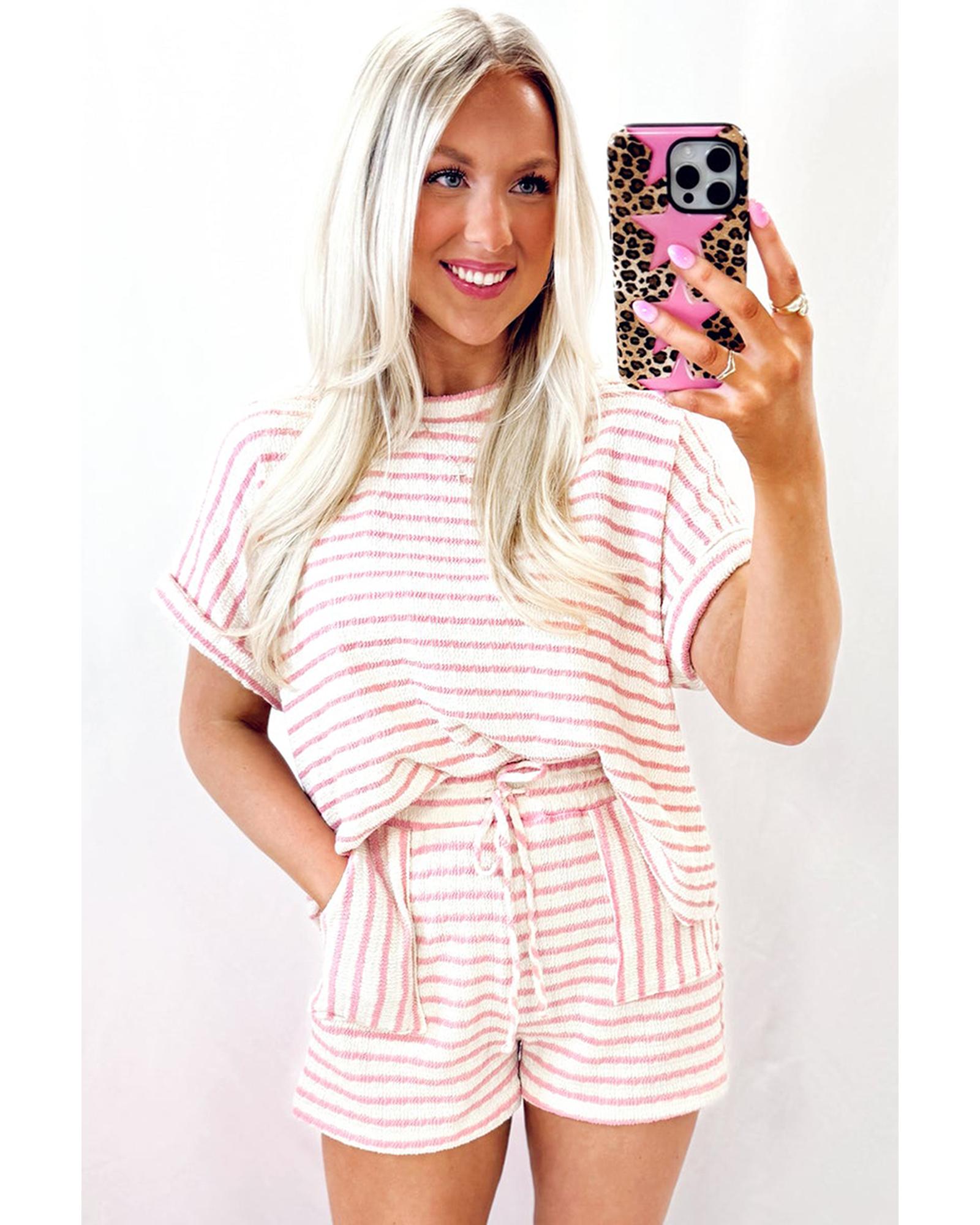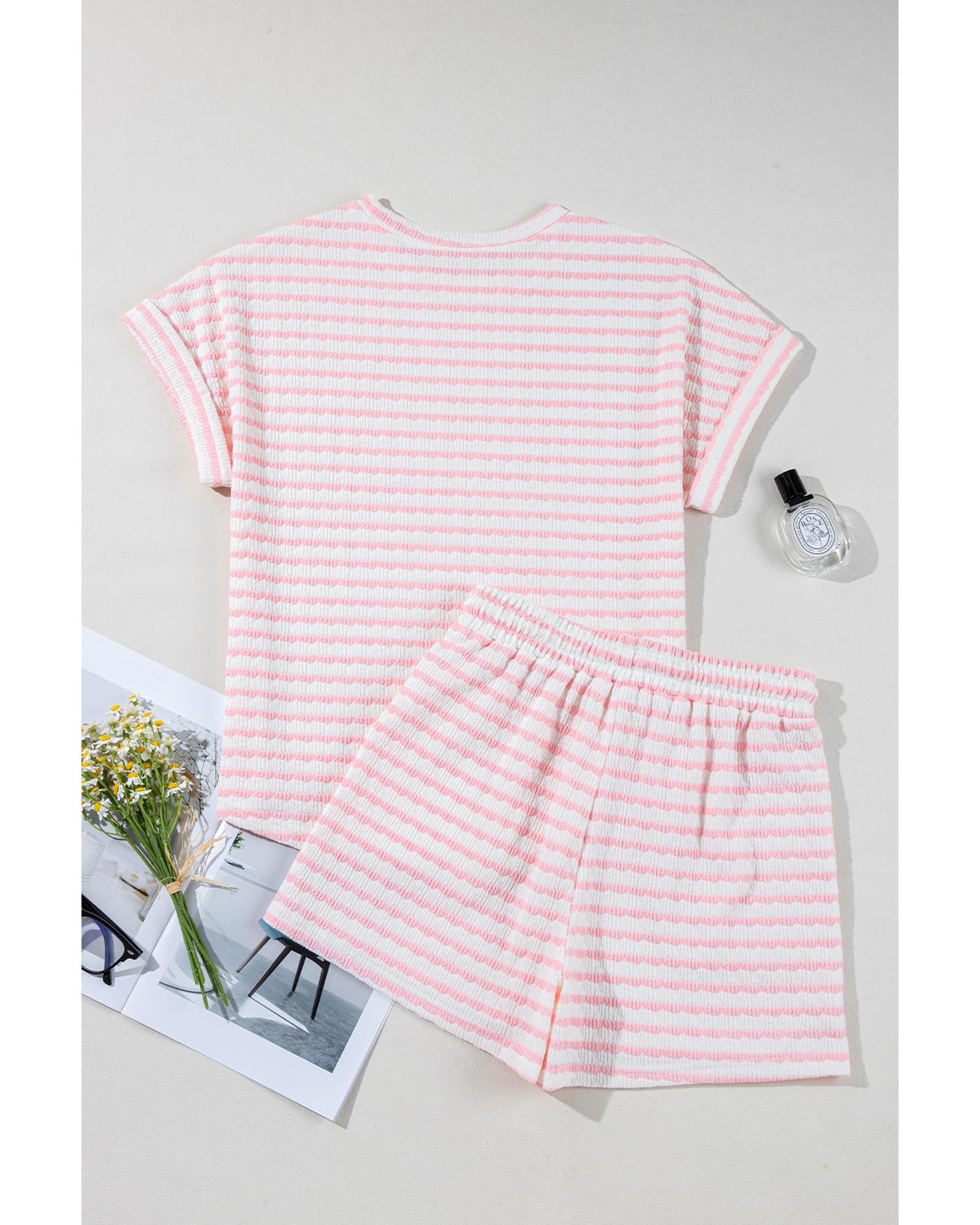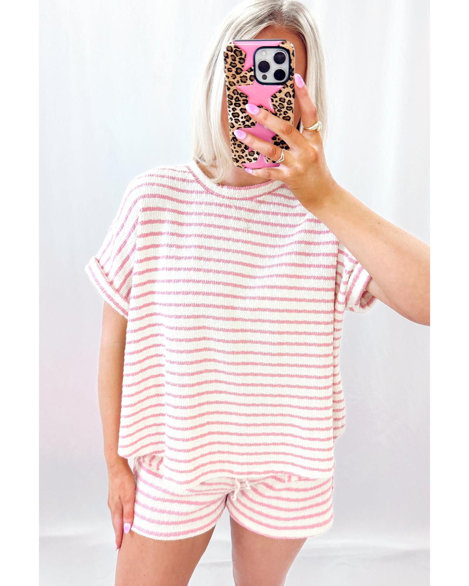 Pink Stripe Knitted Short Sleeve Top and Drawstring Shorts Set – S