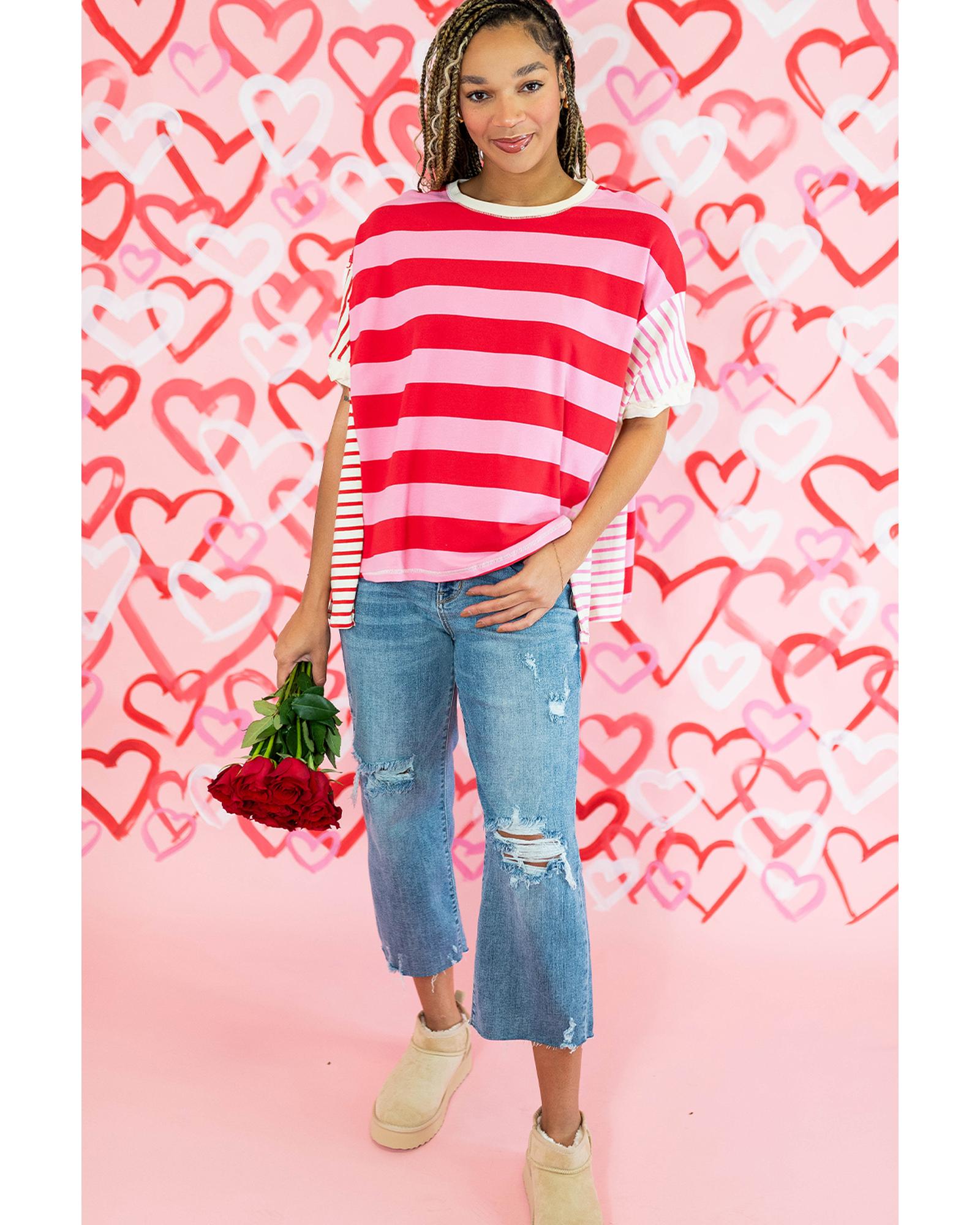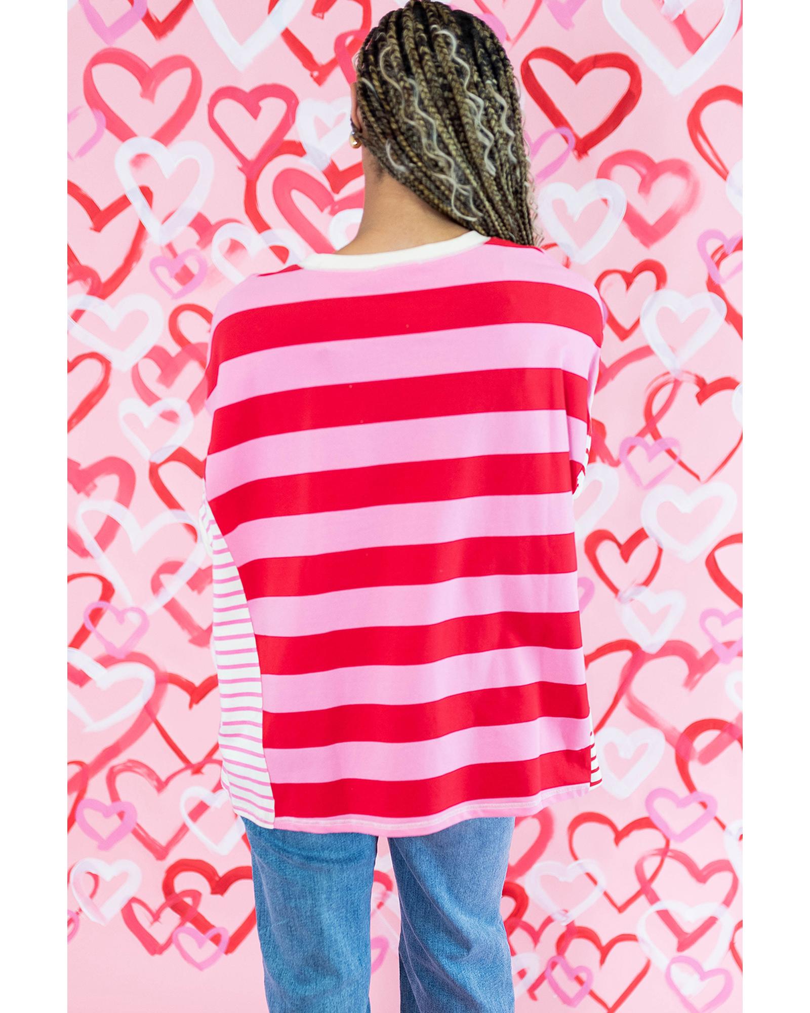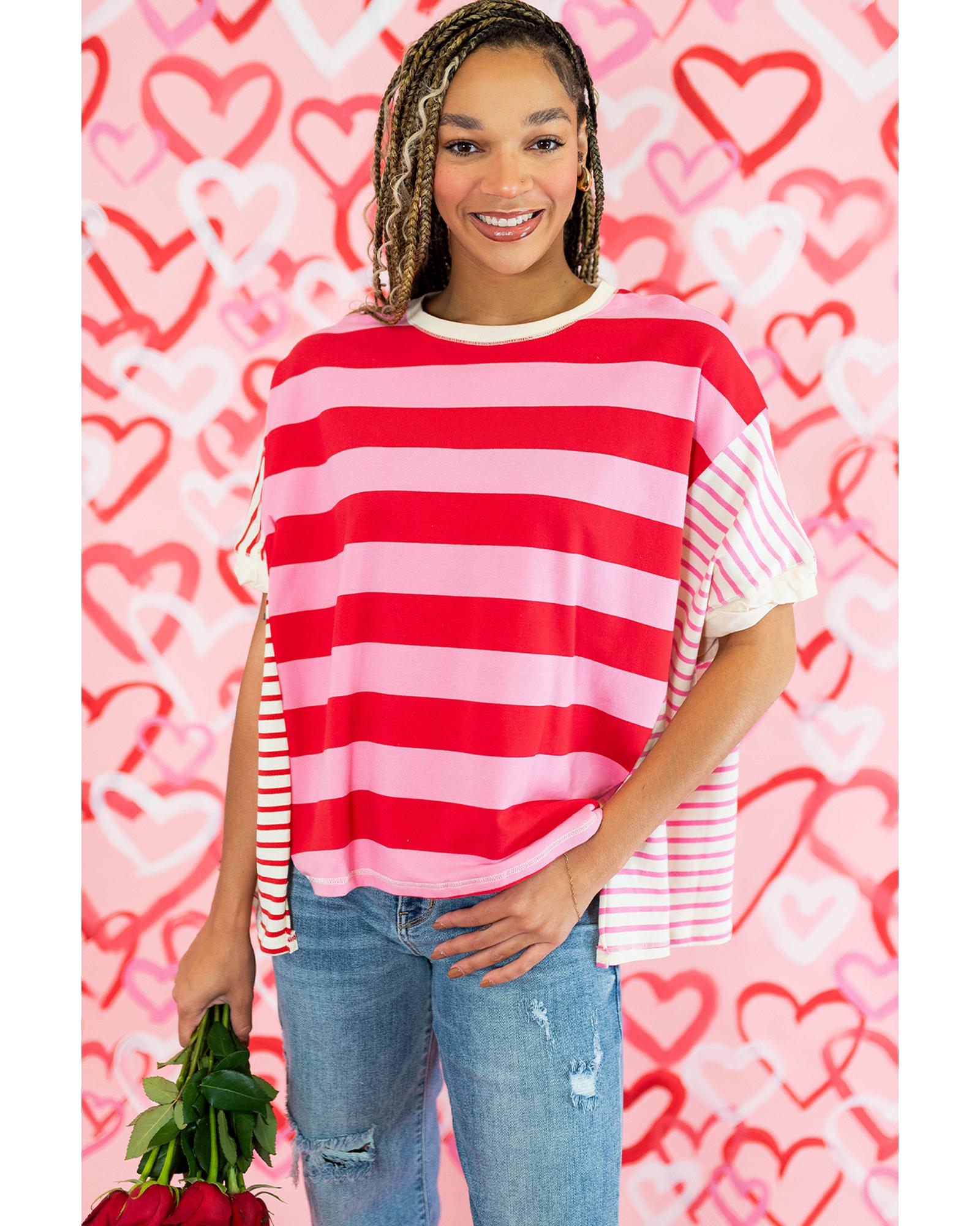 Pink Stripe Patchwork Round Neck Side Split Loose T Shirt – XL
