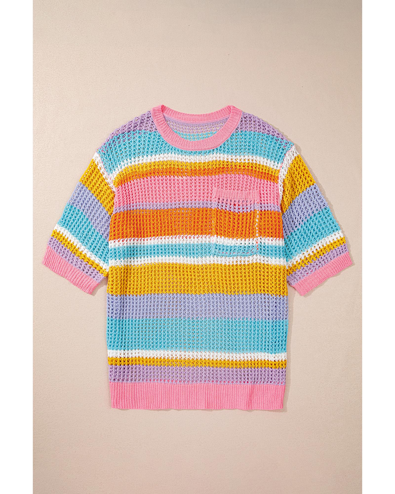Pink Stripe Plus Size Open Knit Patch Pocket Short Sleeve Sweater – 4X