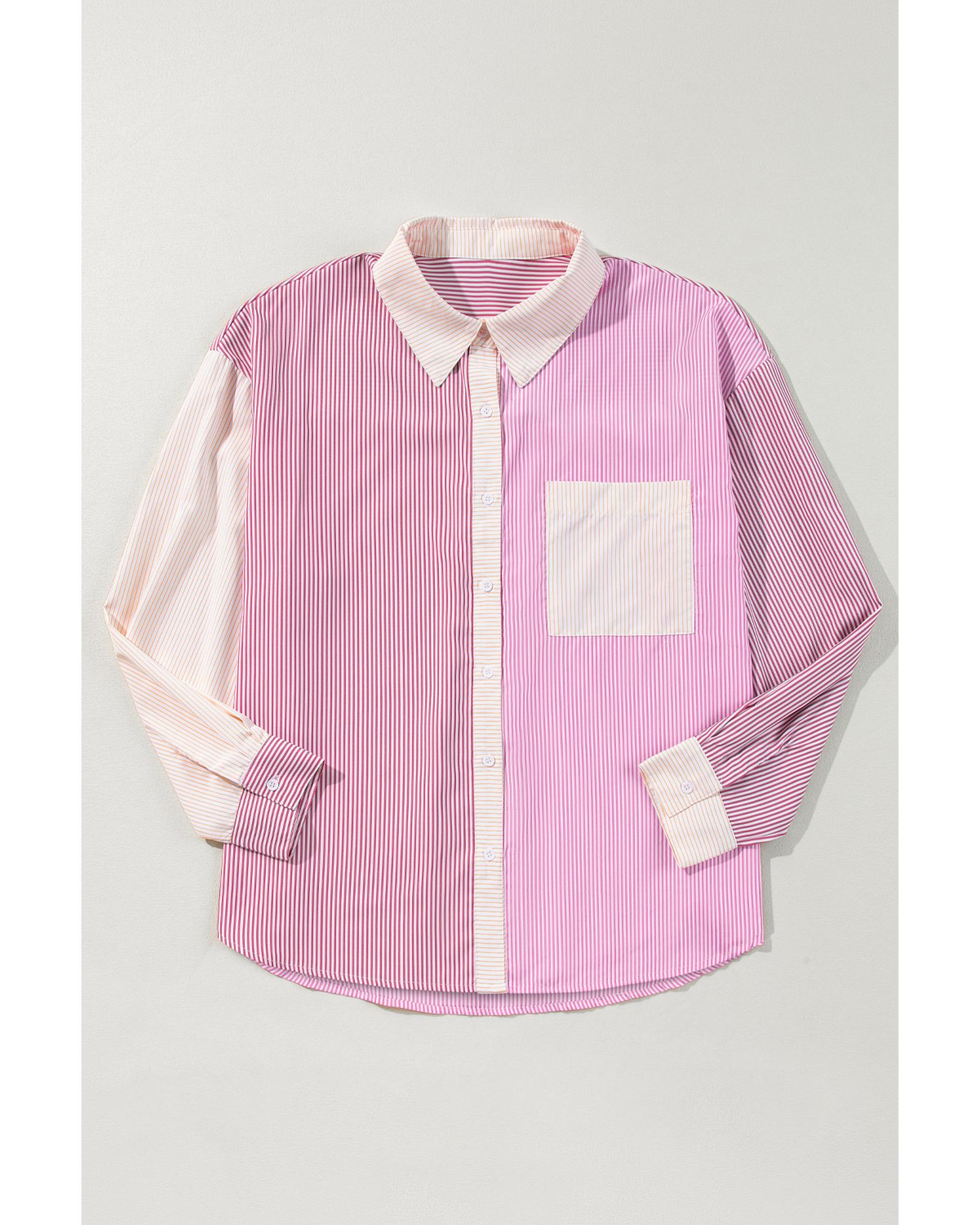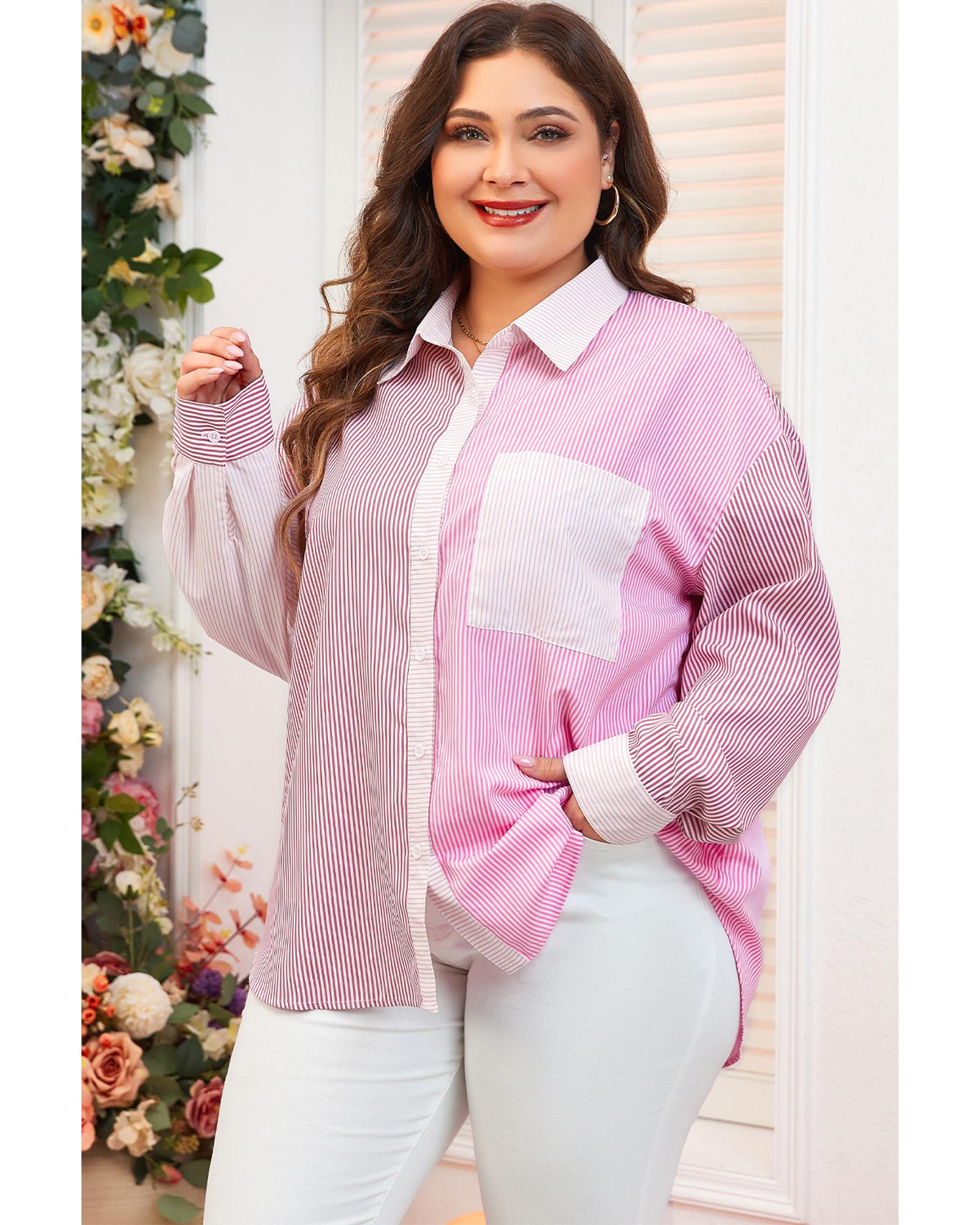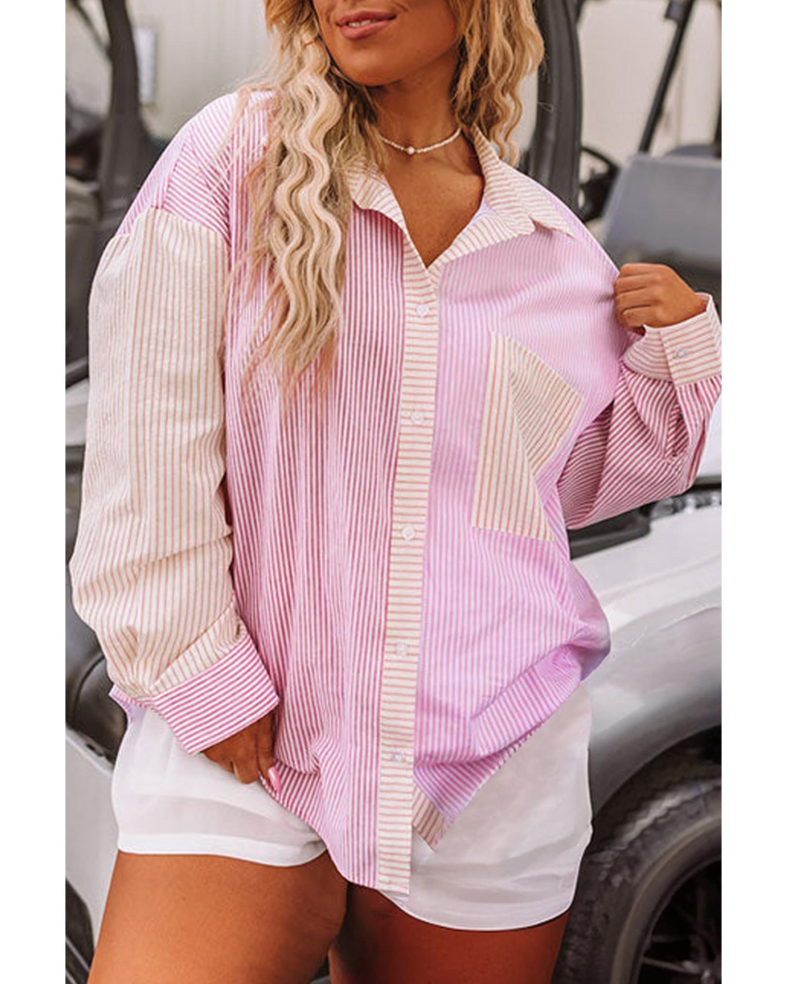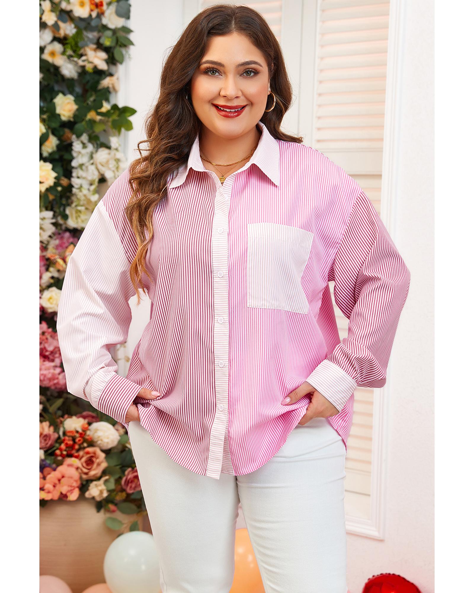 Pink Stripe Print Colorblock Plus Size Shirt – 1X