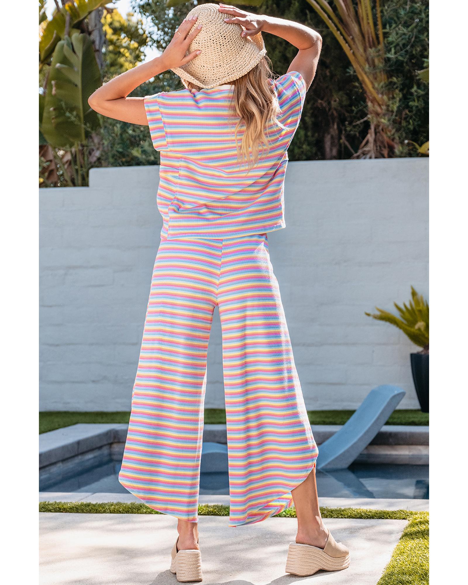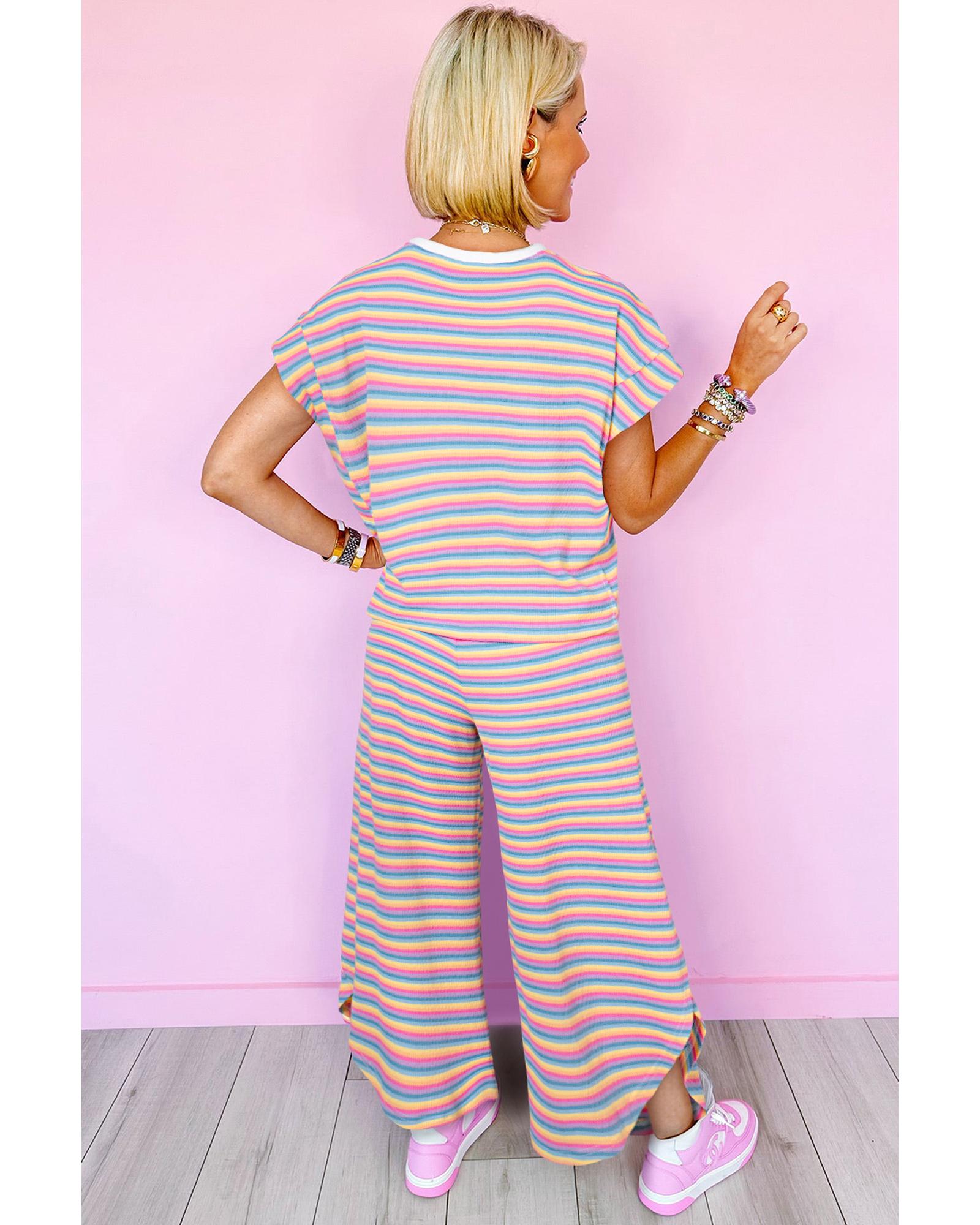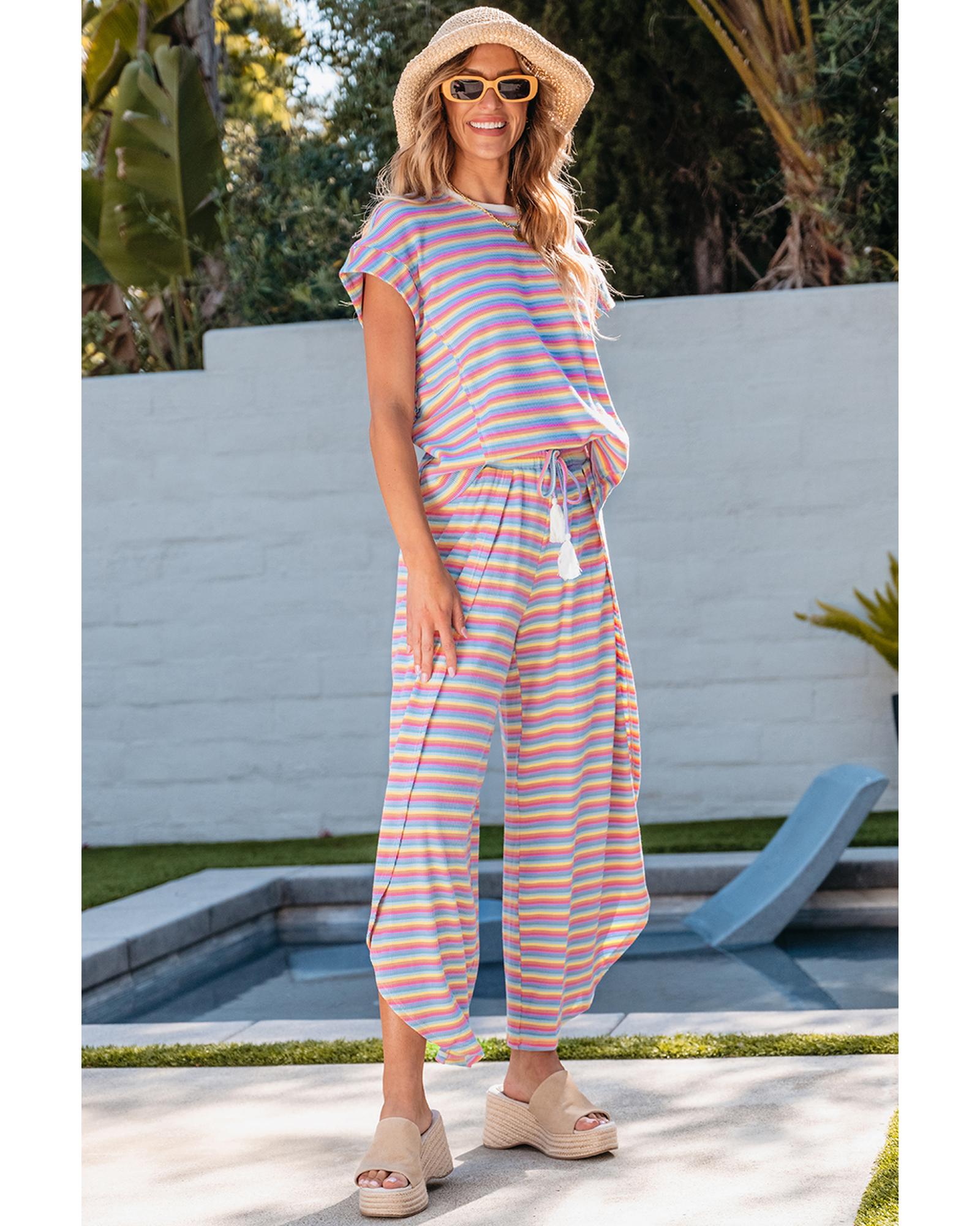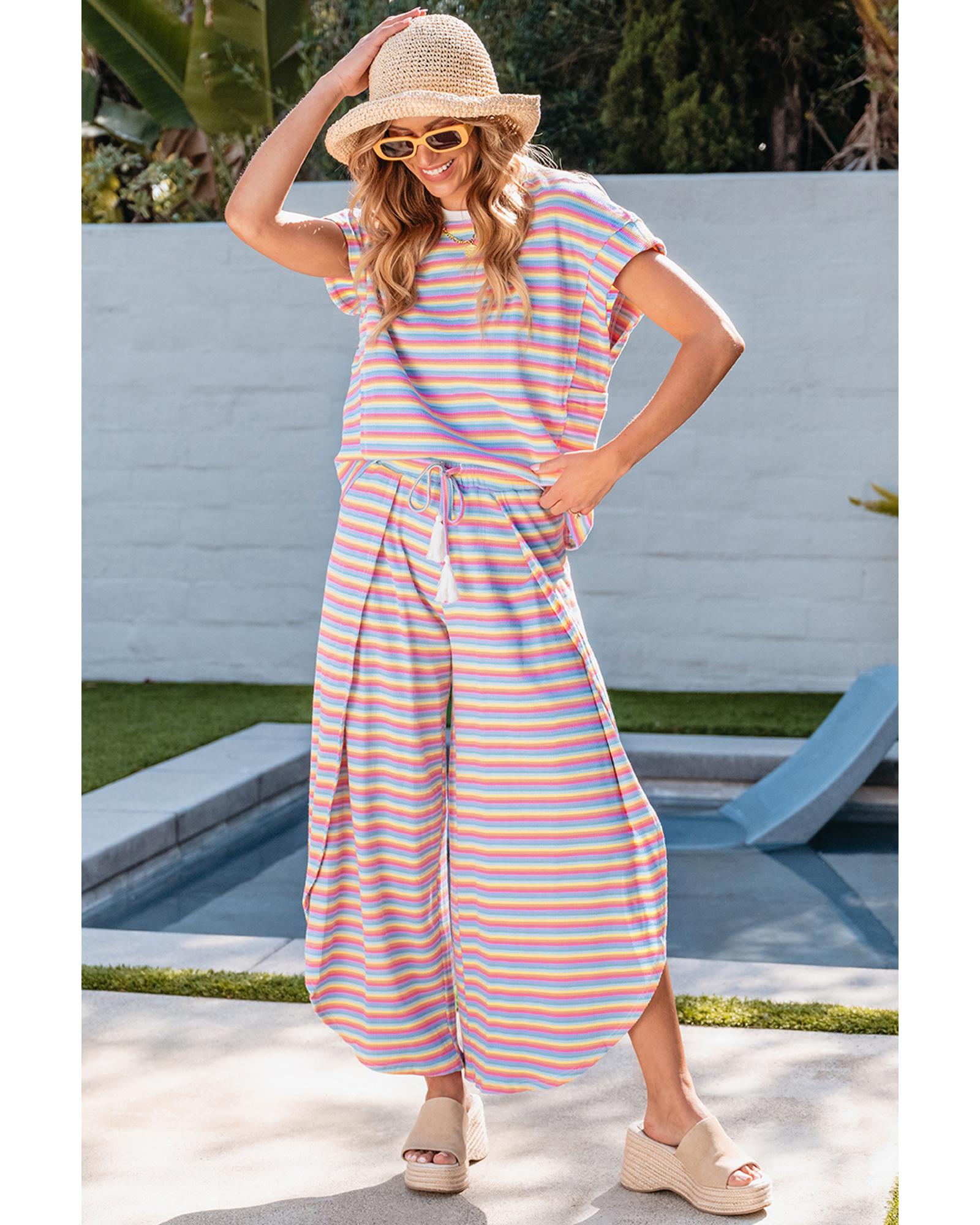 Pink Stripe Rainbow Tee Tasseled String Wide Leg Pants Set – L