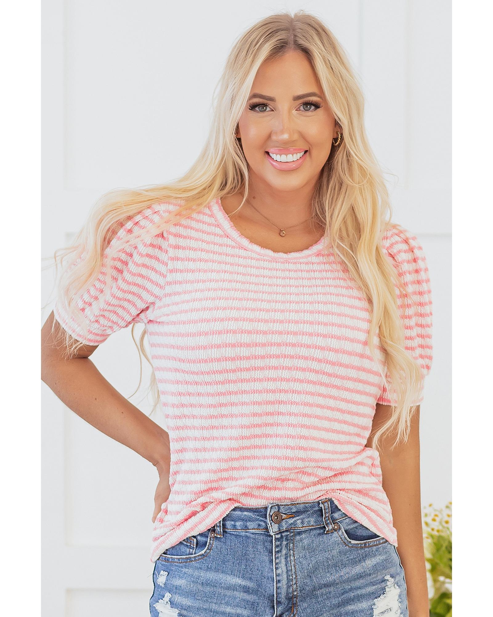 - Pink Stripe Textured Puff Sleeve Crewneck Top