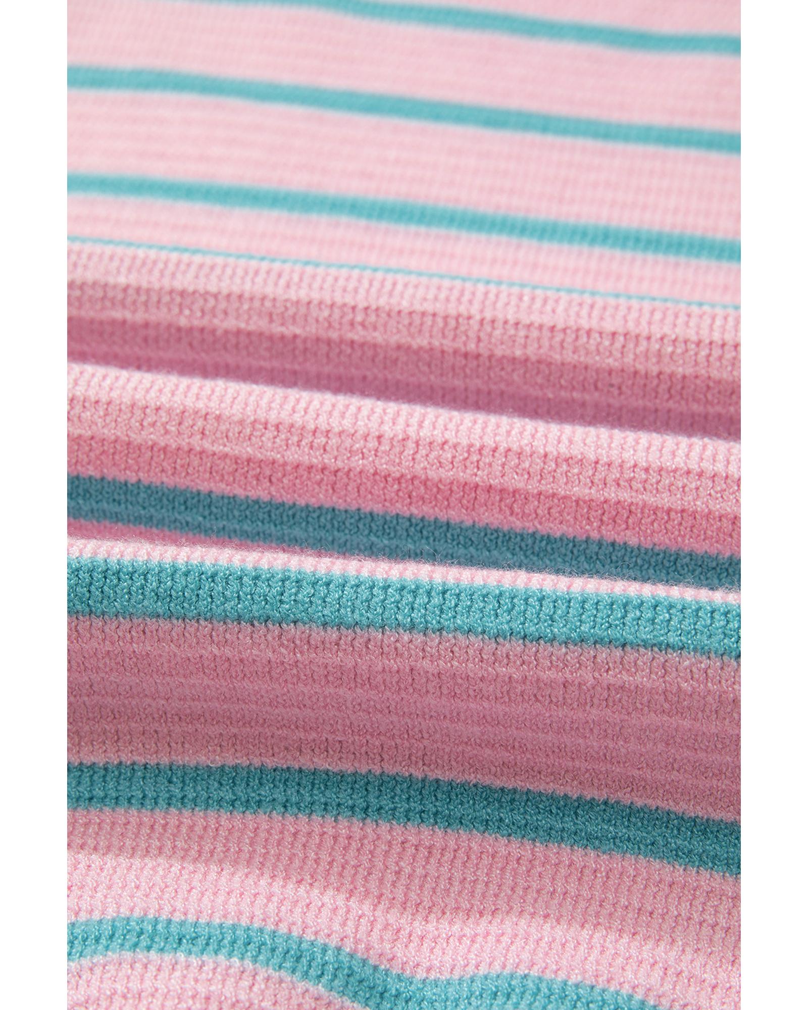 Pink Stripe Trimmed Round Neck Drop Shoulder Loose Sweater – S