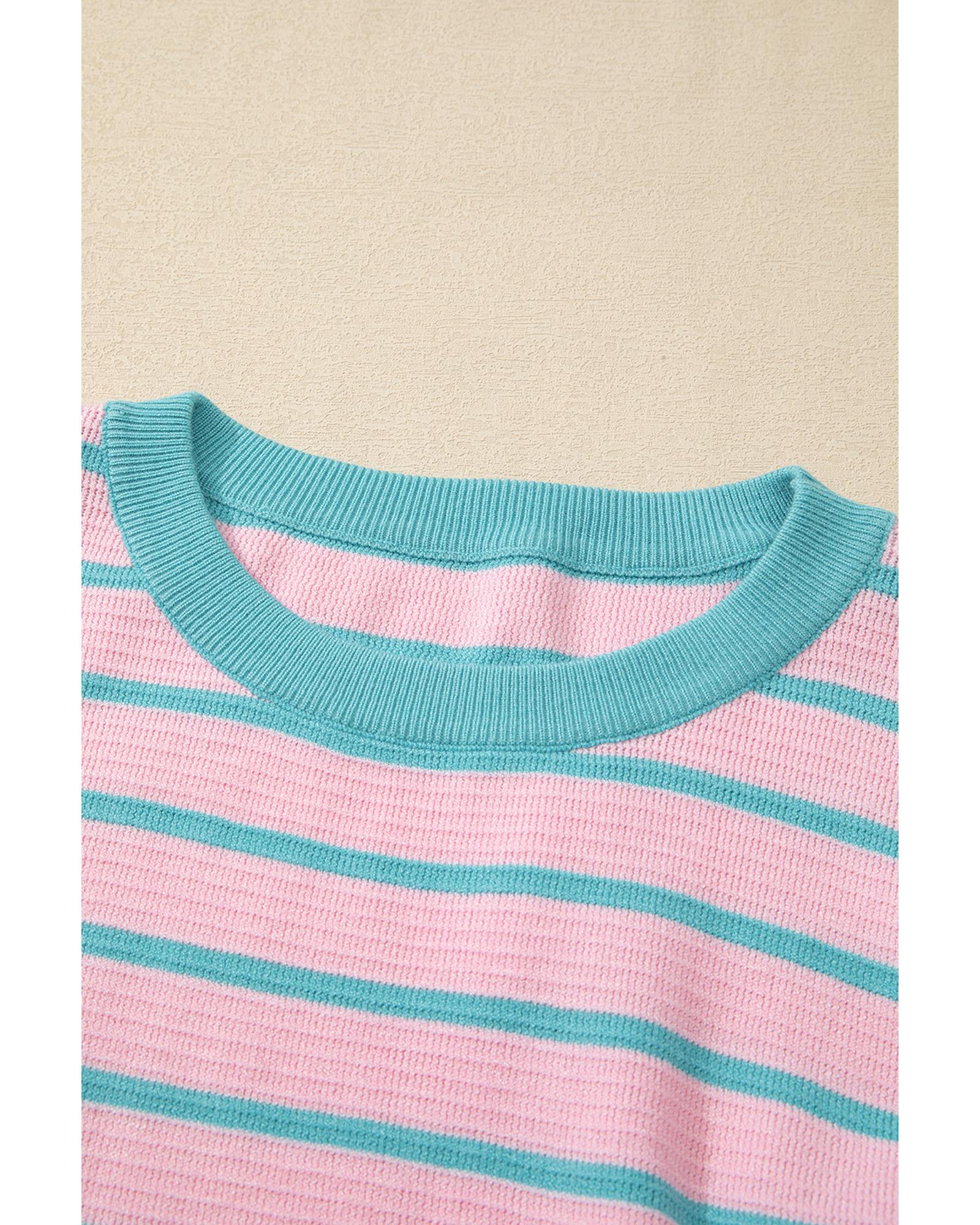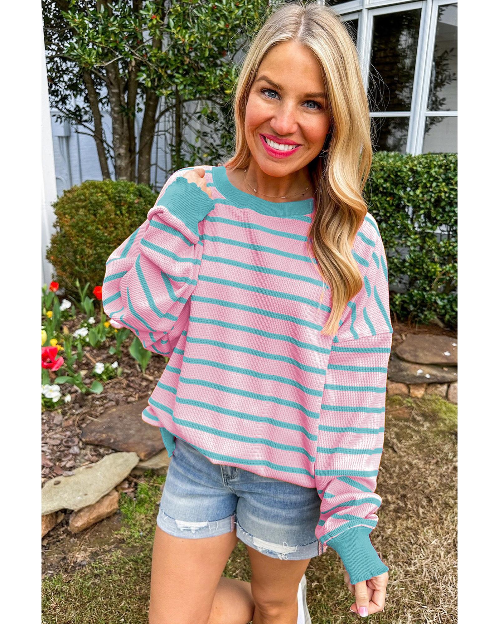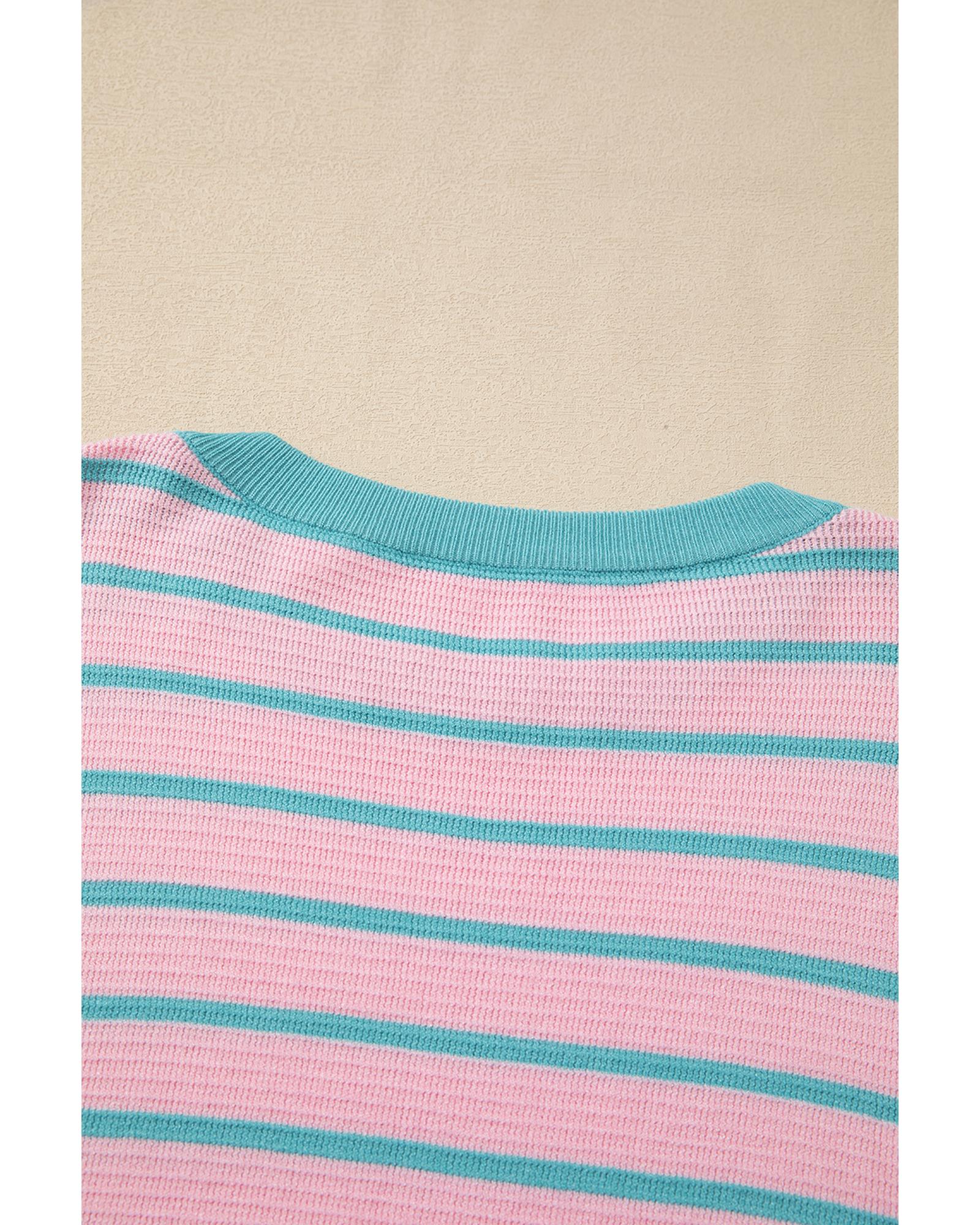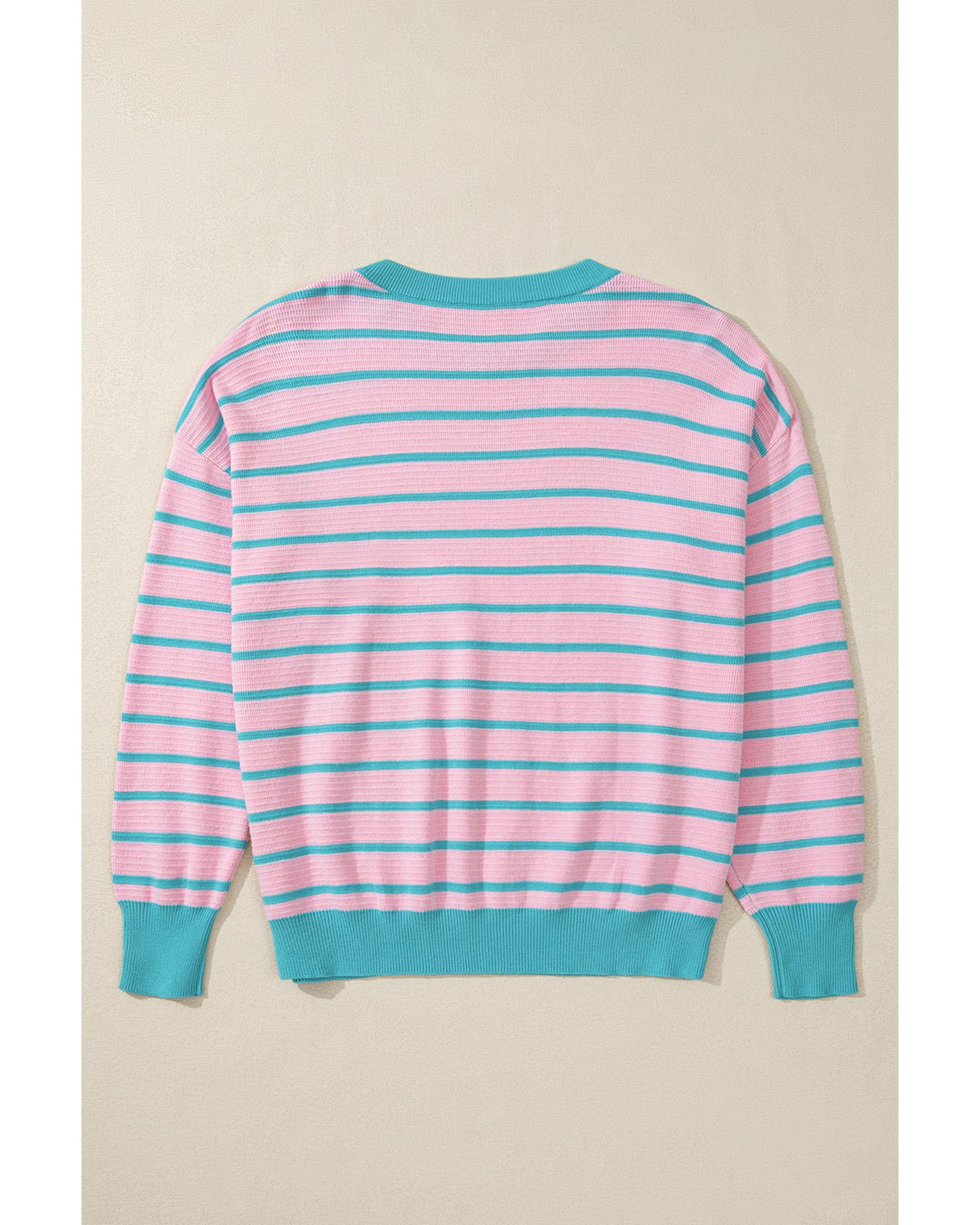 Pink Stripe Trimmed Round Neck Drop Shoulder Loose Sweater – XL