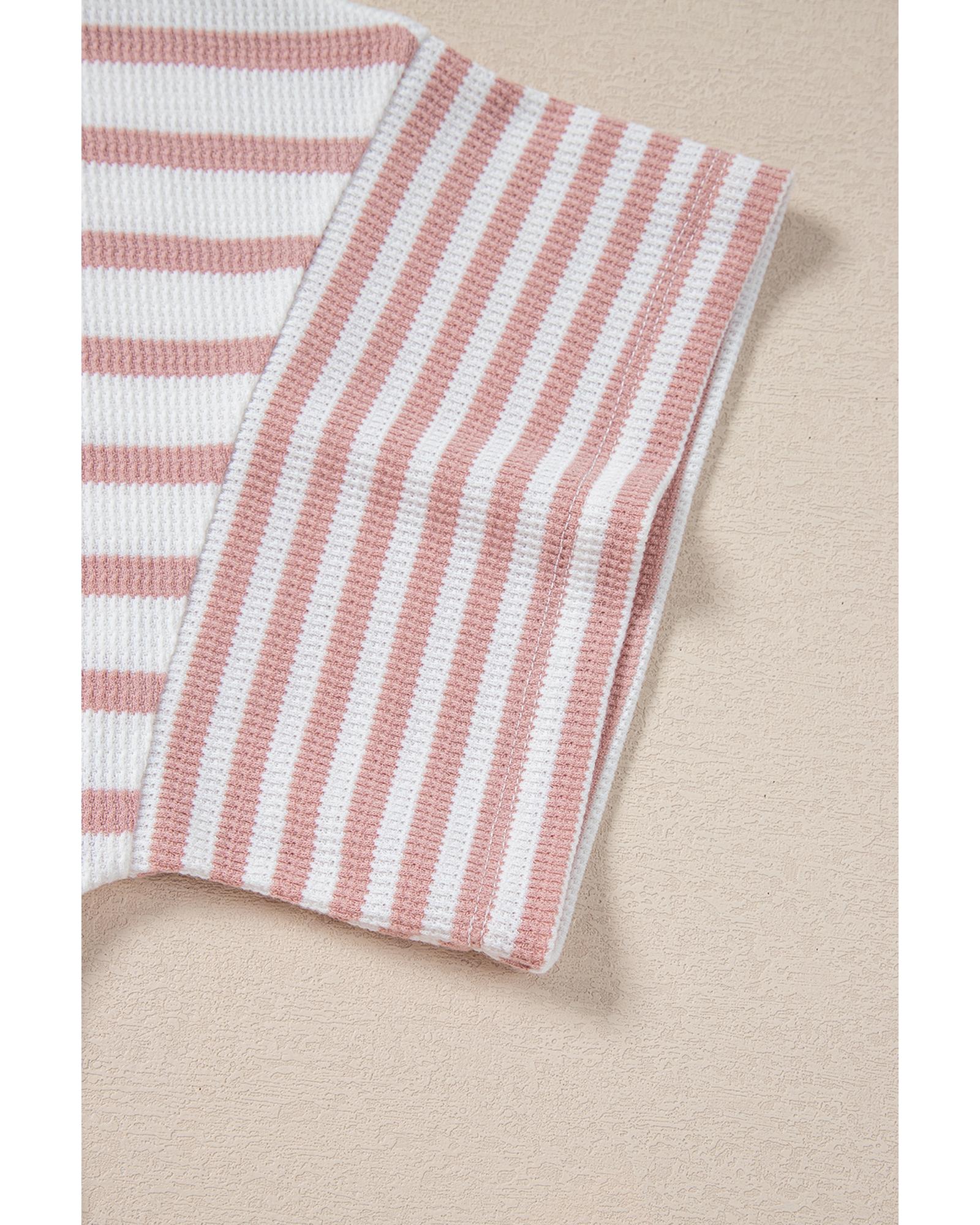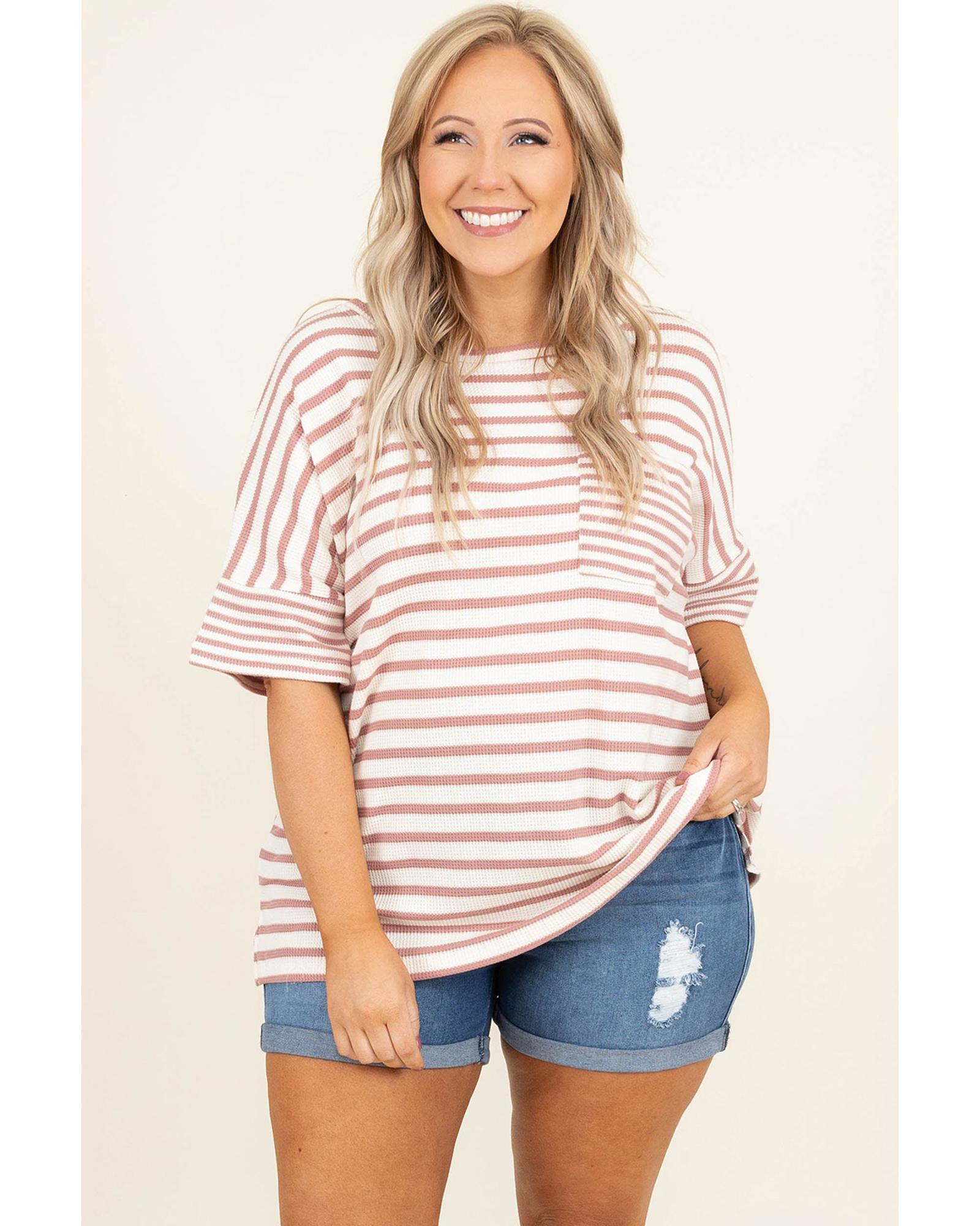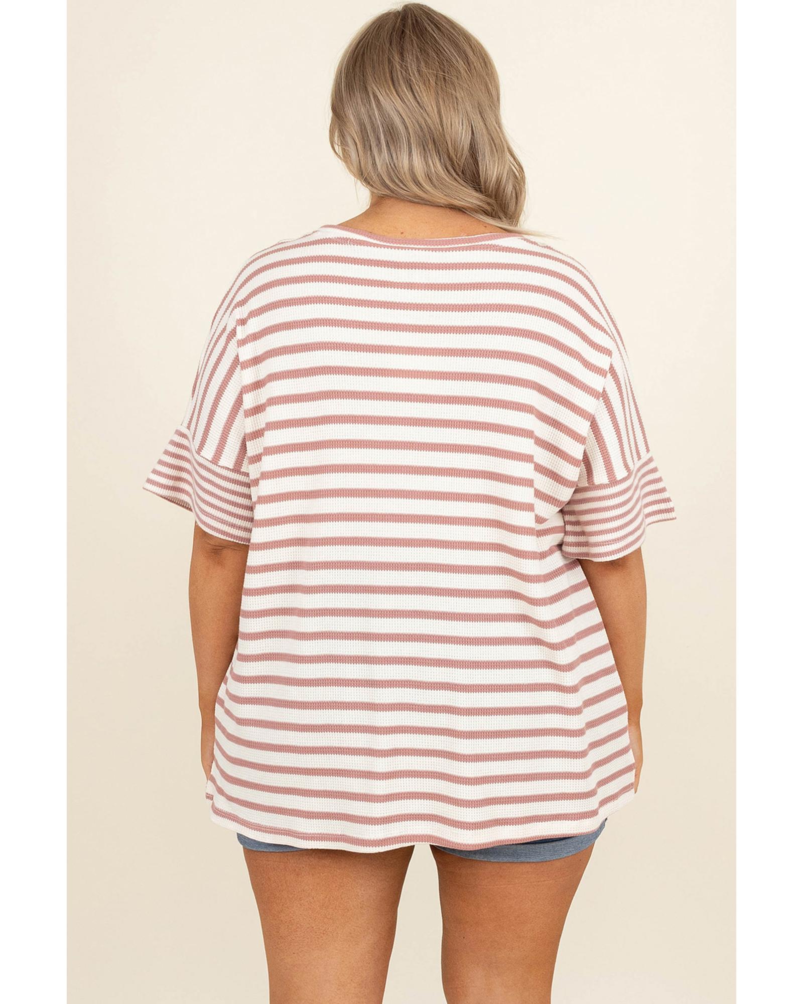 Pink Stripe Waffle Knit Pocketed Half Sleeve Plus Size T Shirt – 3X