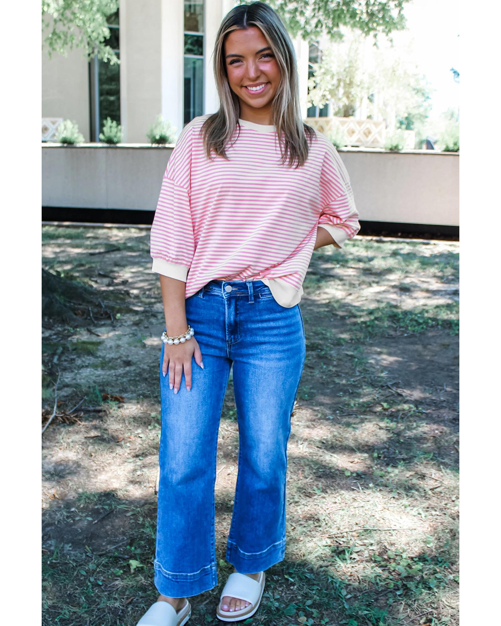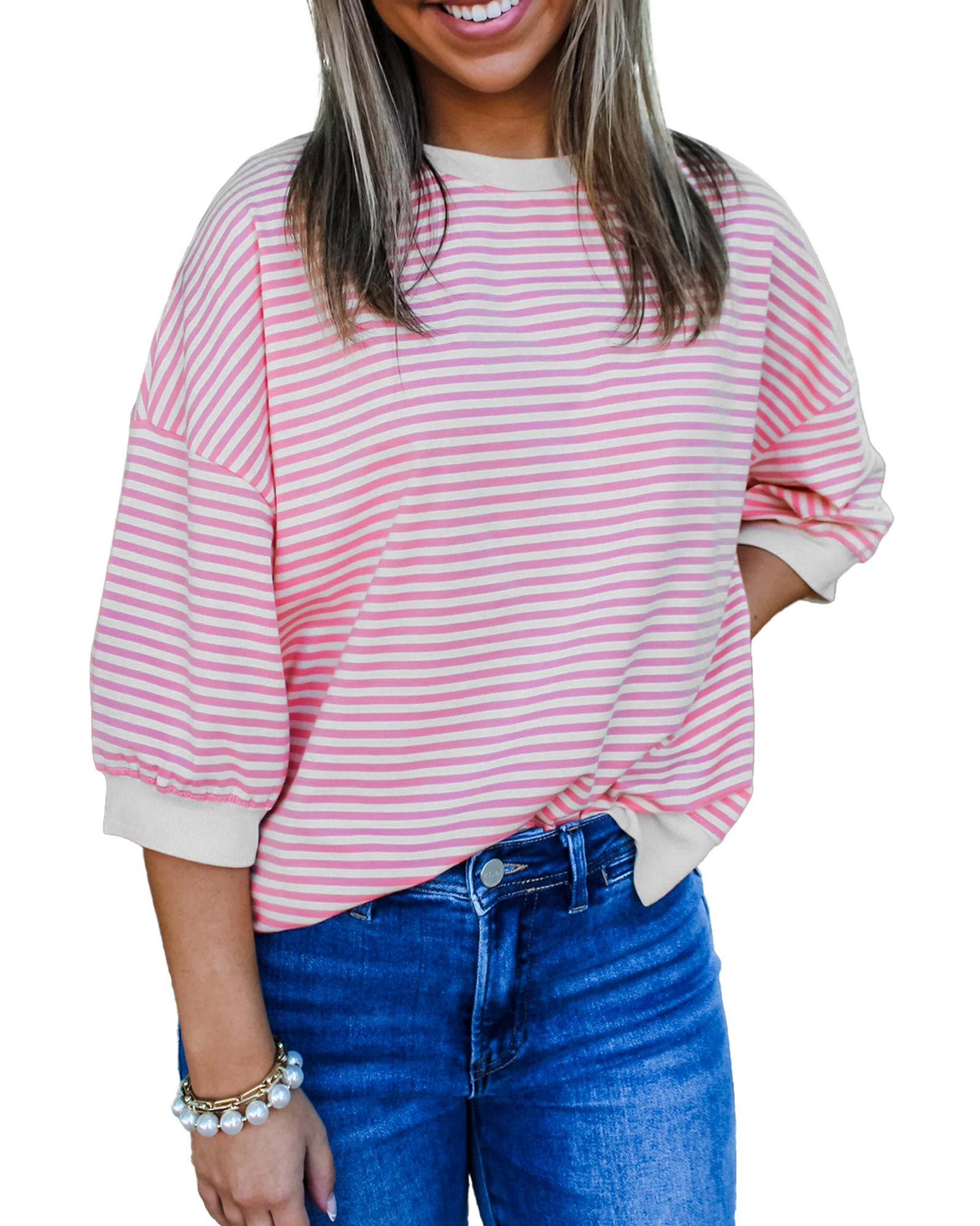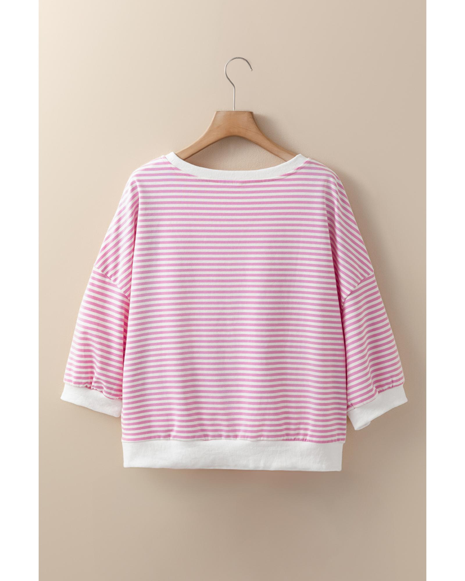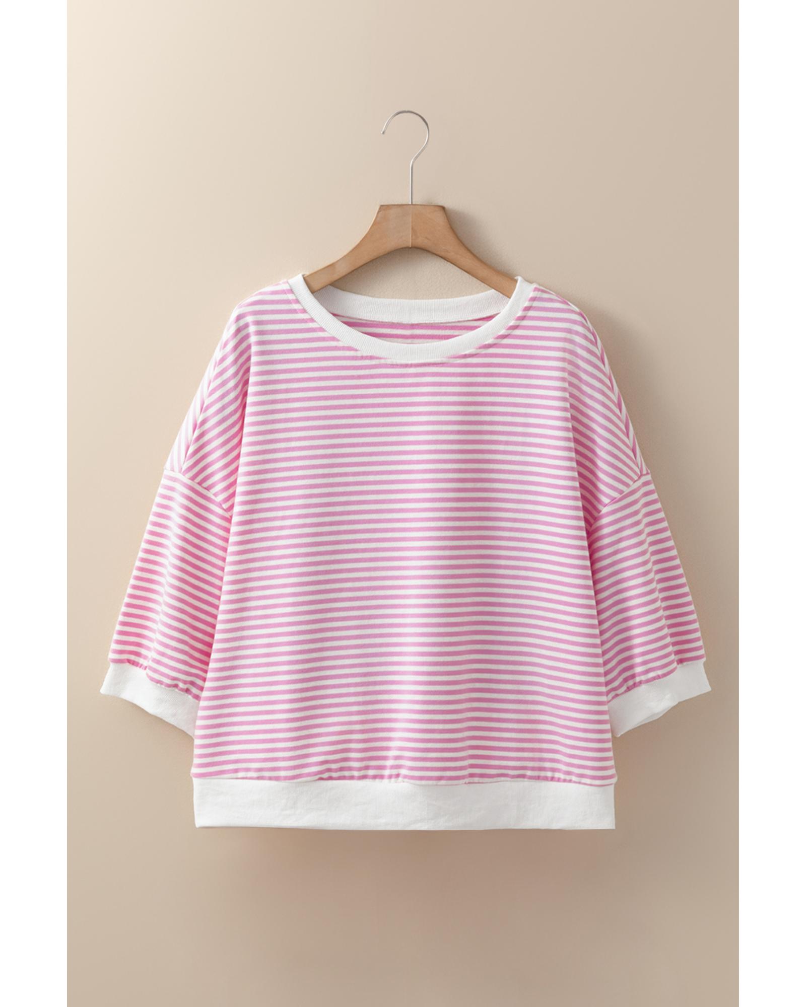 Pink Striped 3/4 Sleeve Drop Shoulder Top – XL