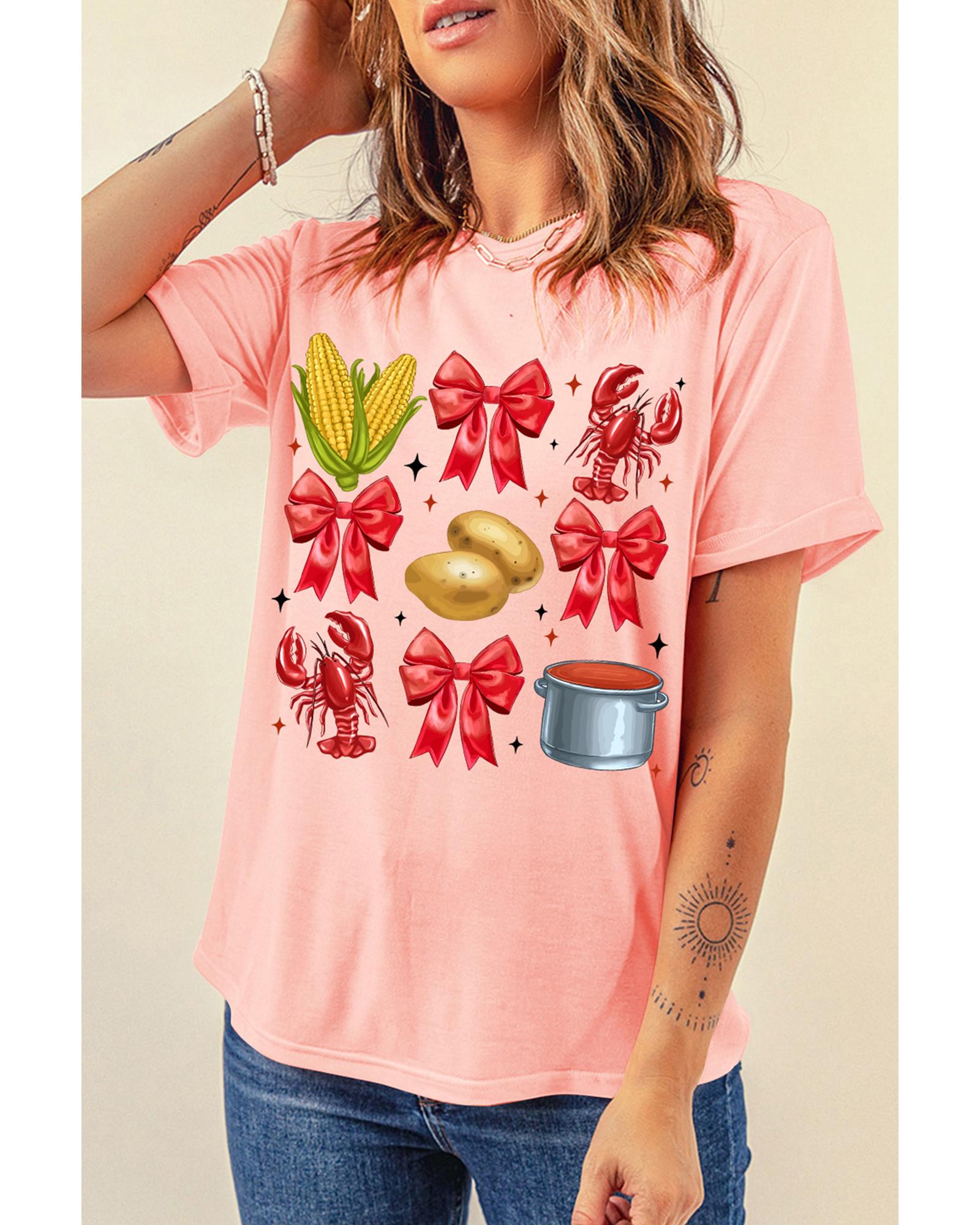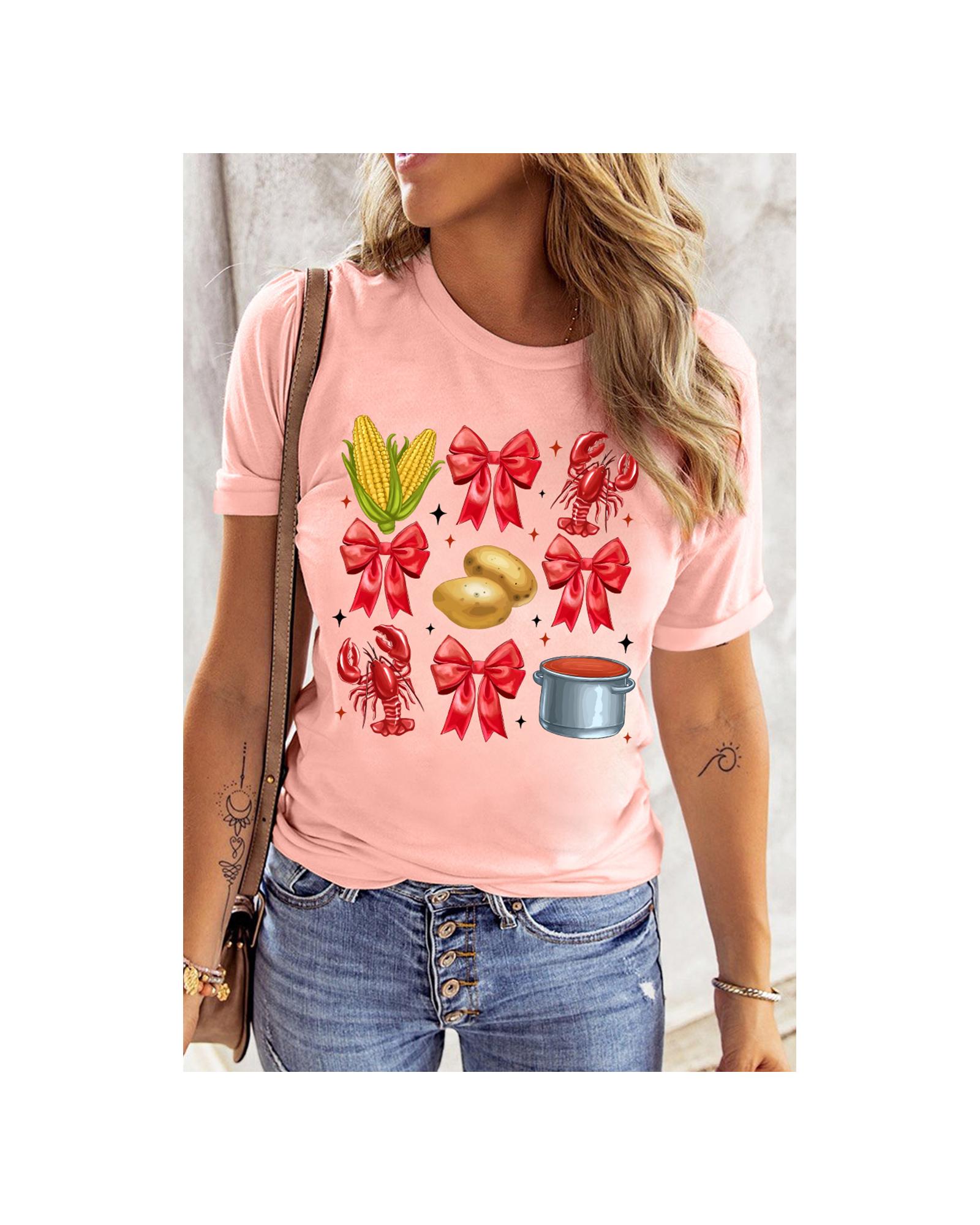 Pink Summer Food Bow Crawfish Printed T Shirt – L