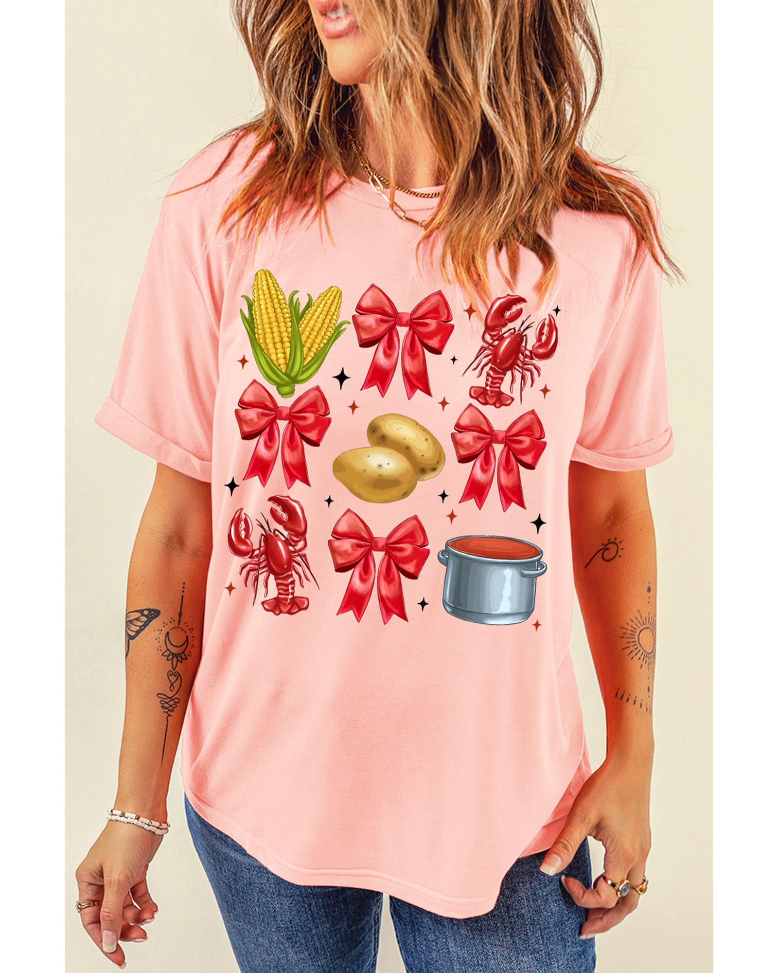 - Pink Summer Food Bow Crawfish Printed T Shirt