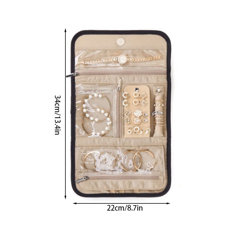 - Multiple Compartments: Includes zippered pockets, earring holders, ring rolls, and bracelet straps to keep your jewelry neatly organized.