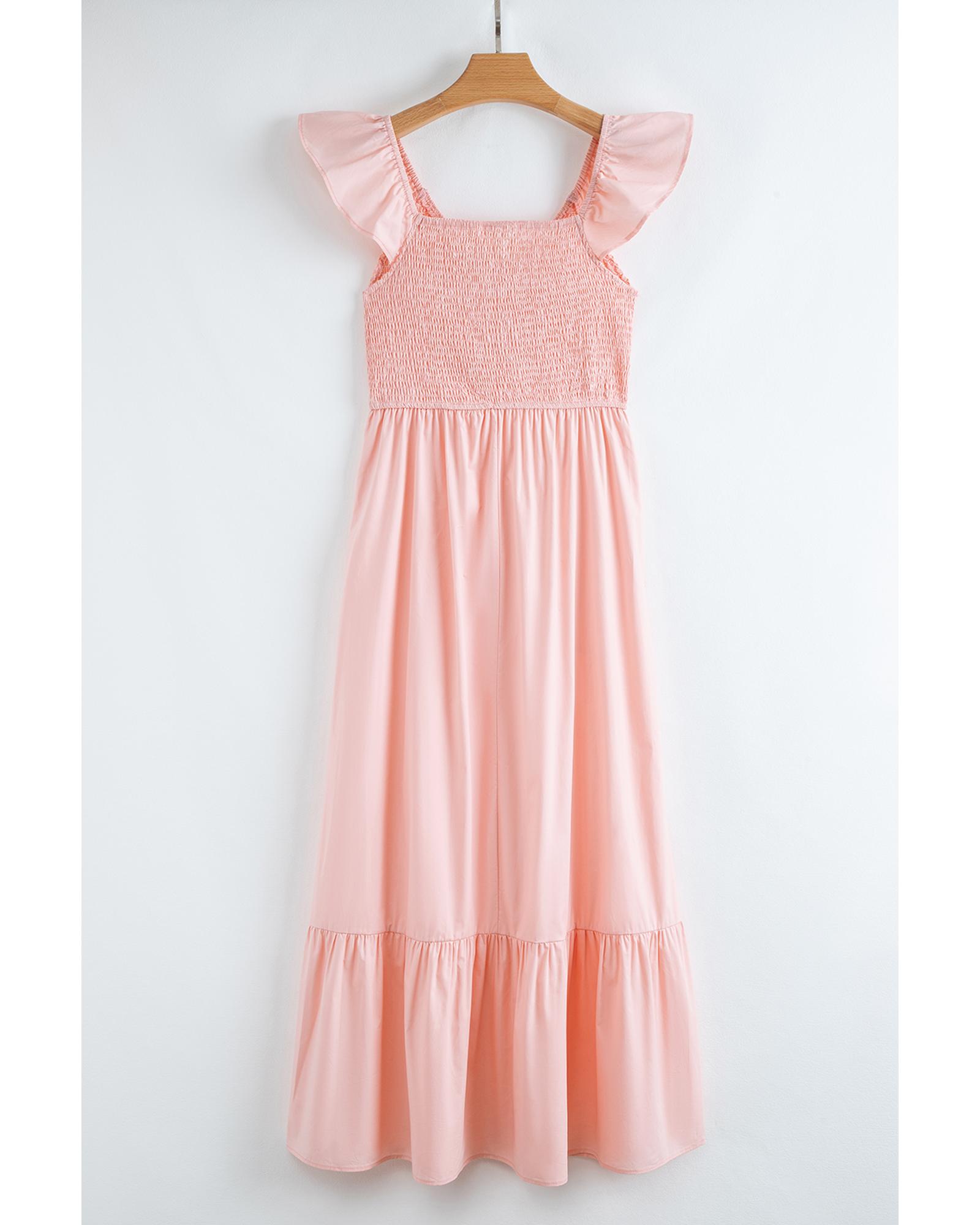 Pink V Neck Flutter Sleeve Smocked Bodice High Waist Ruffle Maxi Dress – M