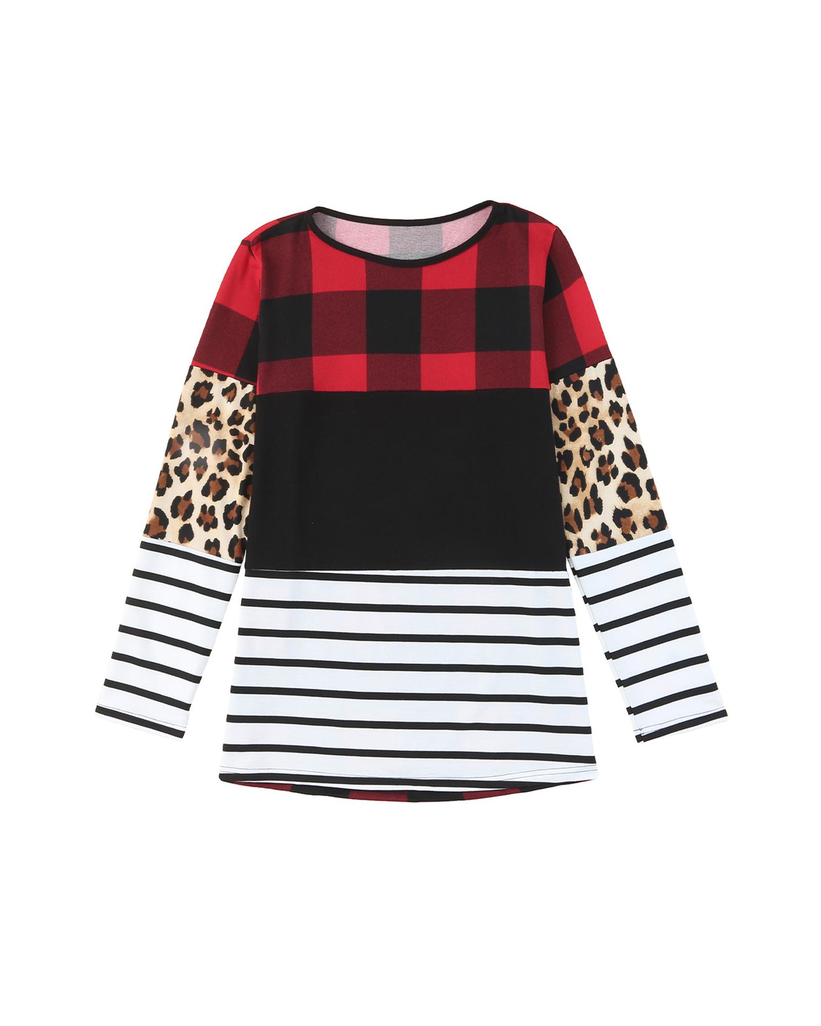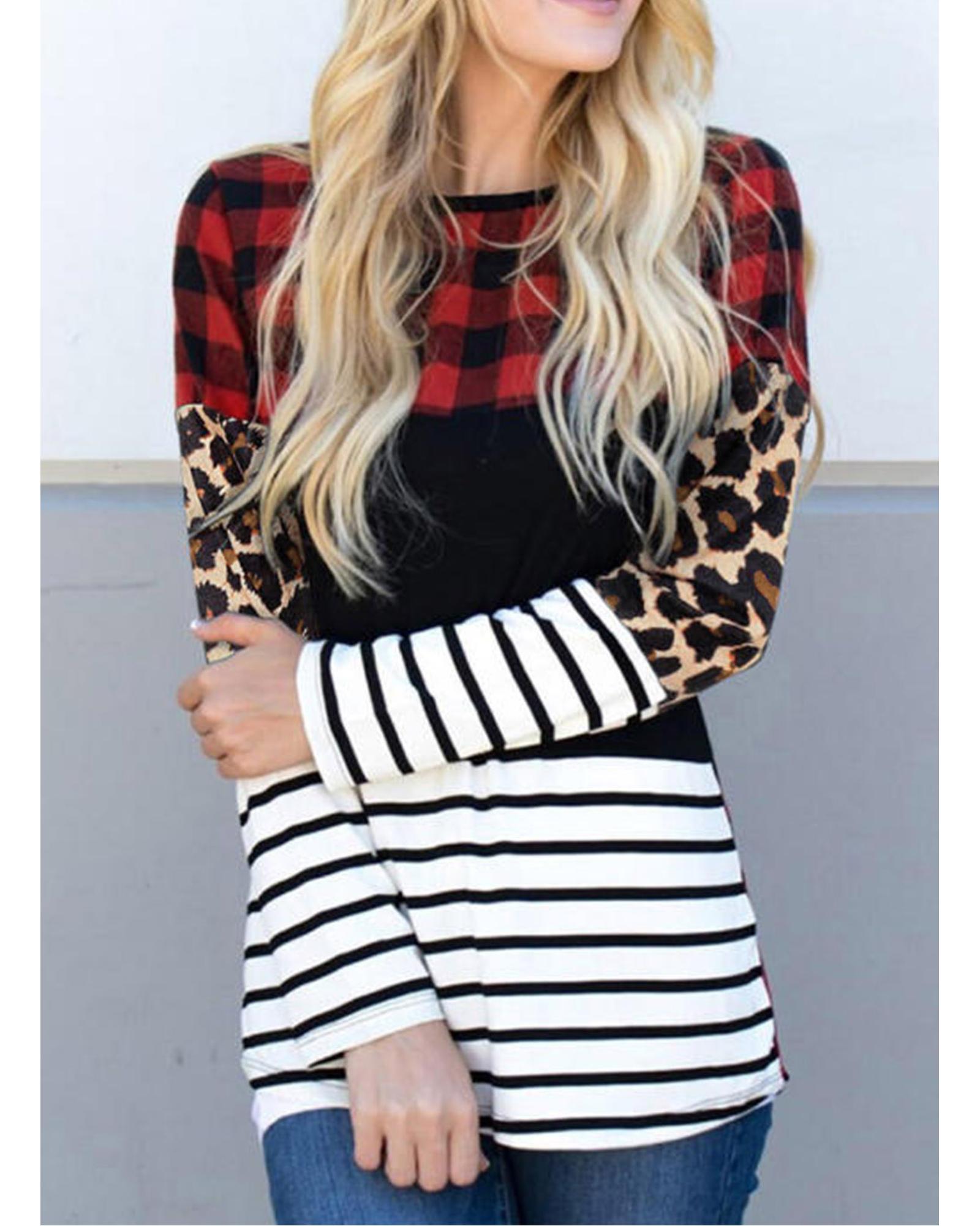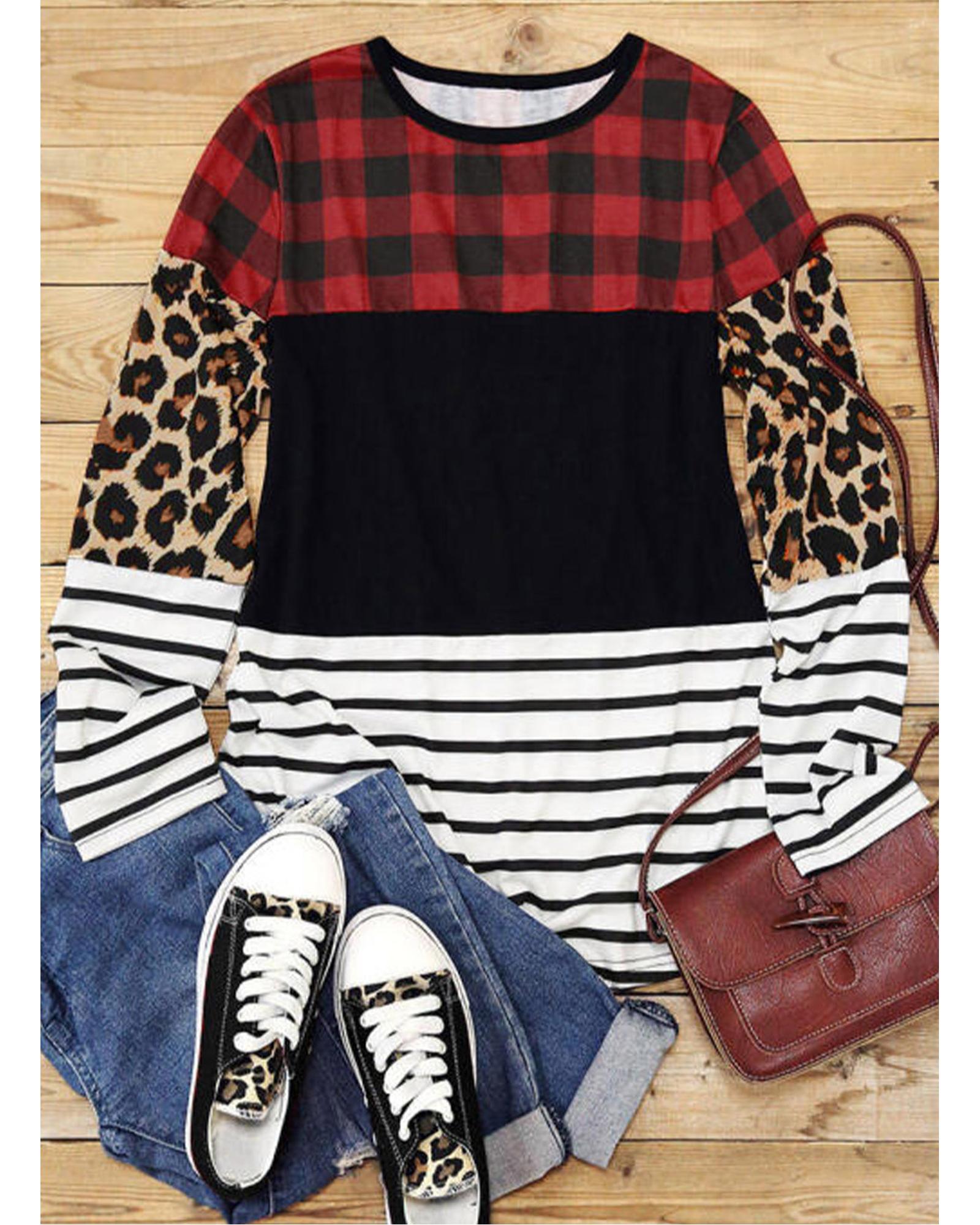Plaid Print Leopard Splicing Striped Color Block Long Sleeve Top – L