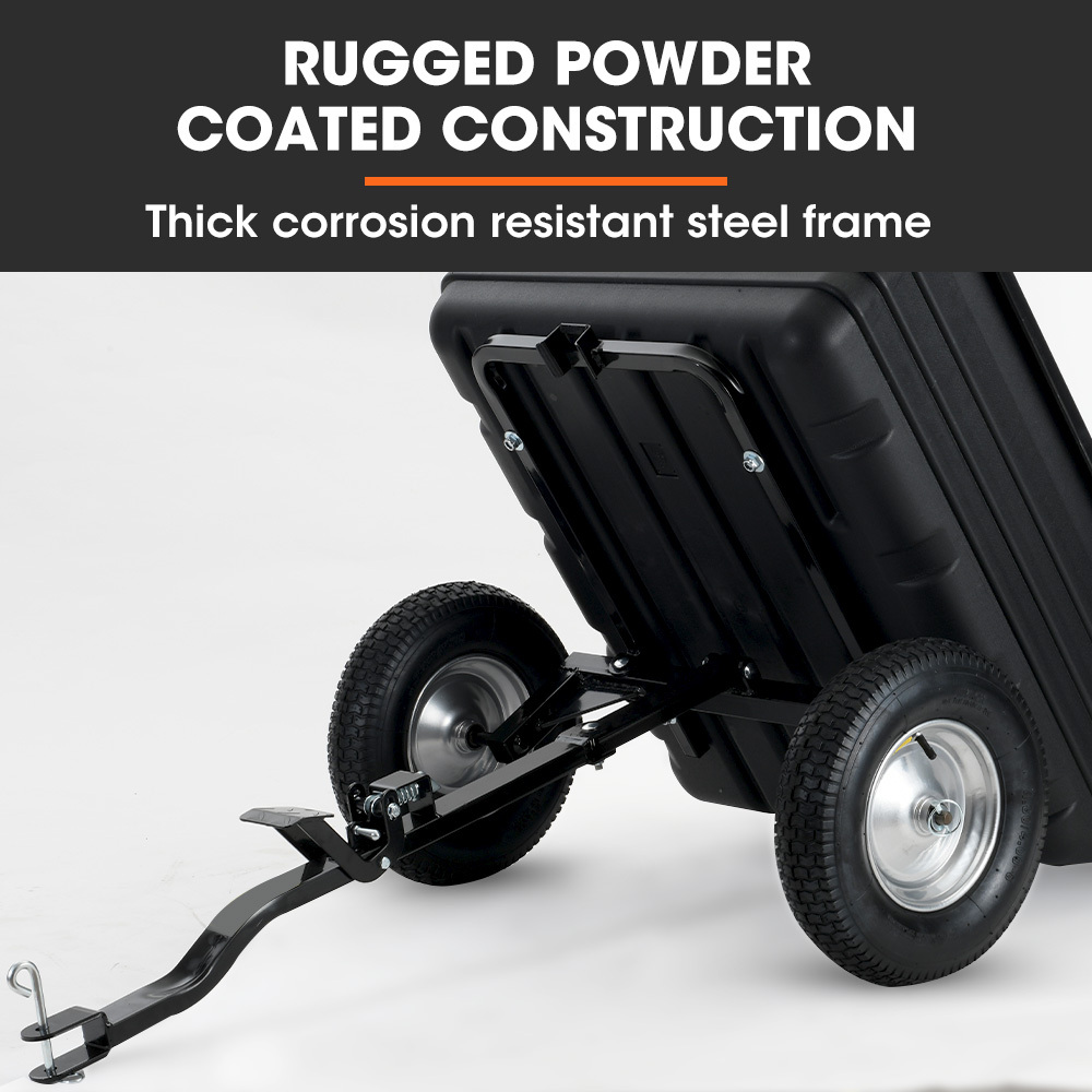 The steel chassis of this dump cart trailer is built to handle the hard knocks and bumps from daily use. The poly bed will of course never rust, and the galvanised fitting and powder-coated frame contribute to many years of use.
