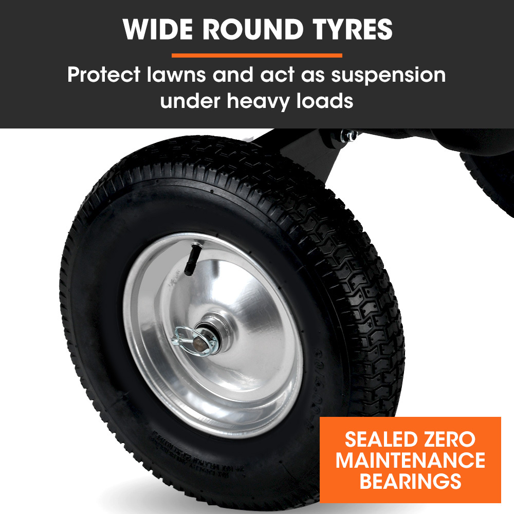 The large 16′ pneumatic tyres are mounted on 8-inch steel rims. They are attached to independent axles for higher ground clearance and have maintenance-free sealed bearings. They are ideal for carting loads through soil, mud and rough terrain without sinking or getting hung up on logs and boulders. And, with a 4-inch tread width they are kind to turf based surfaces.