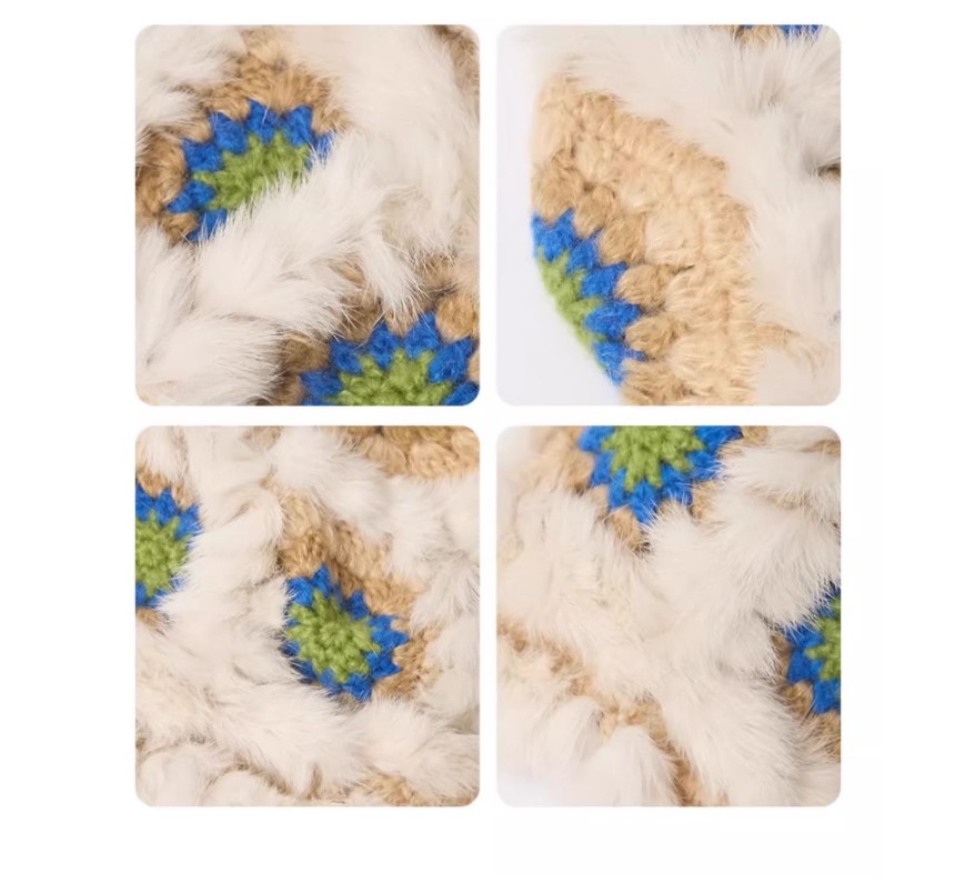 Plush Floral Bucket Hat,Warm Crocheted Winter Hat in Beige-Hat circumference: 56-60cm