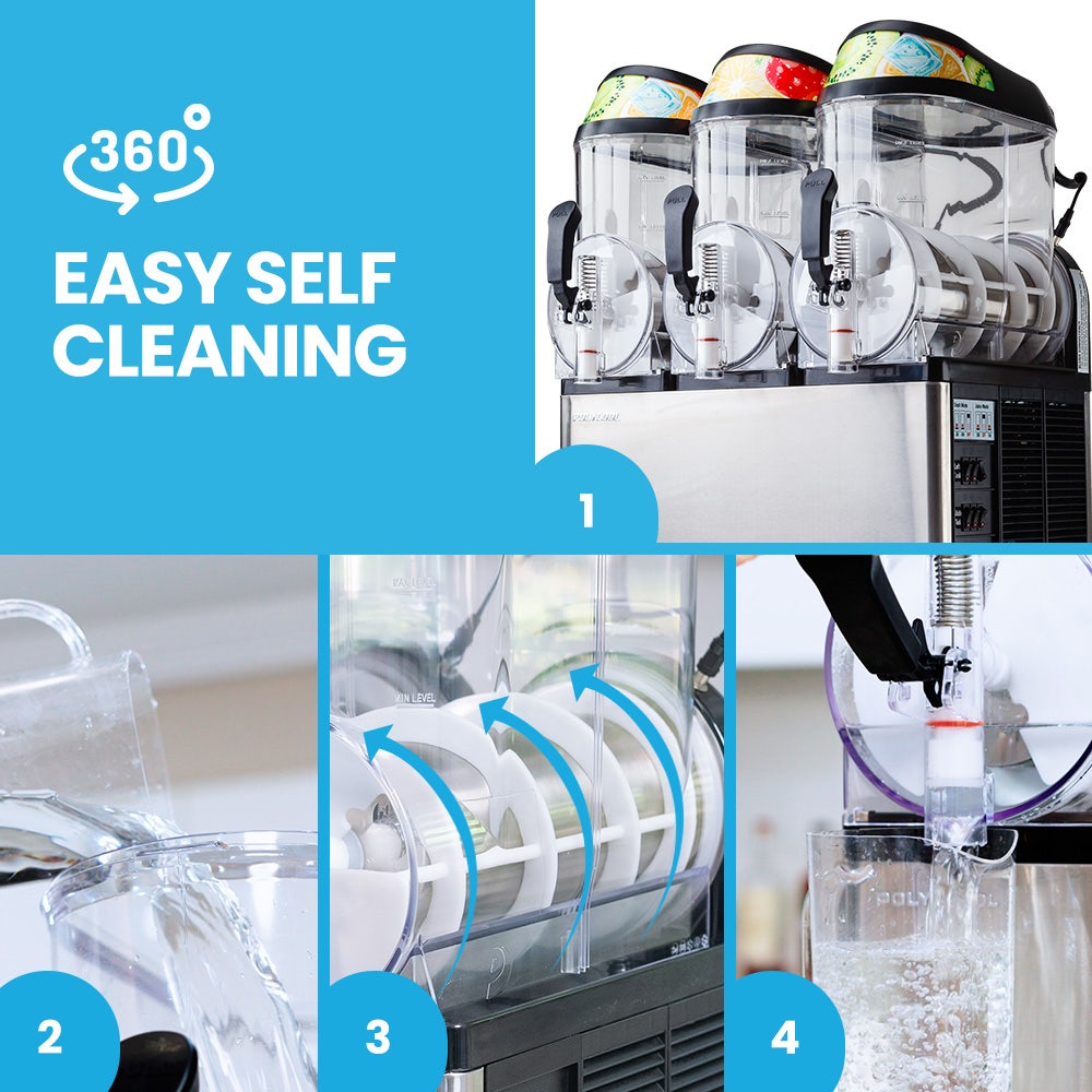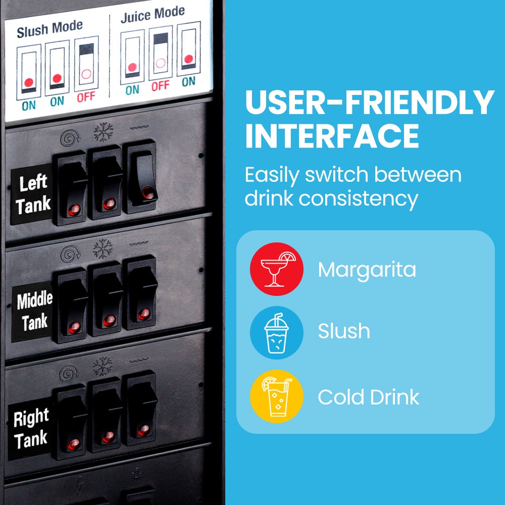The PolyCool Commercial 36L Slushie Machine provides a user-friendly experience, allowing your staff to effortlessly switch between slush and juice while also adjusting the consistency with ease.