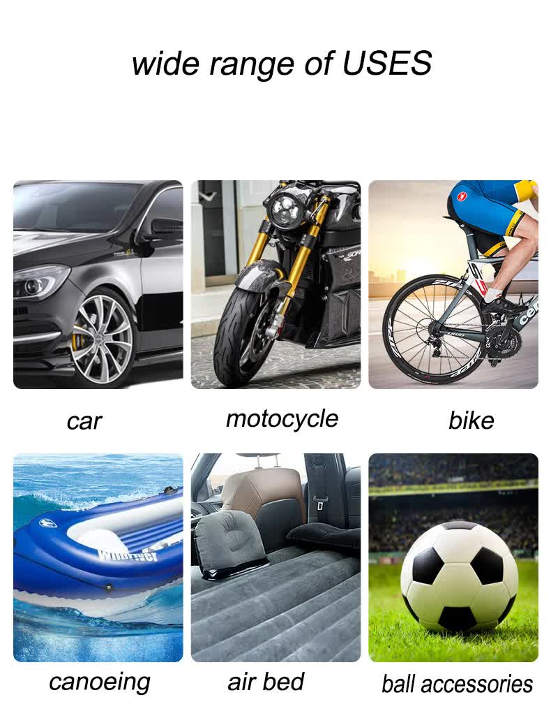 - Multi-Purpose Use: Includes a set of nozzles suitable for inflating car tires, motorcycles, bicycles, sports balls, inflatable boats, and more.