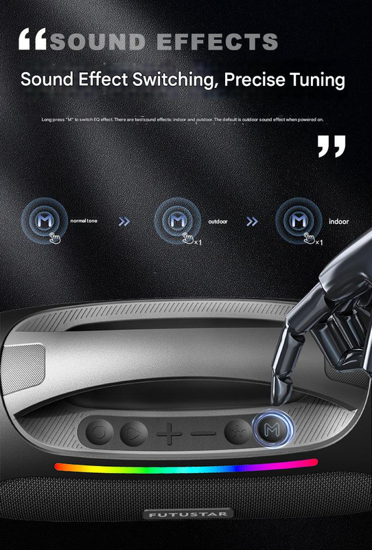 • Switchable EQ Sound Effects: Long press “M” button to toggle between indoor and outdoor sound profiles (defaults to outdoor on power-on).