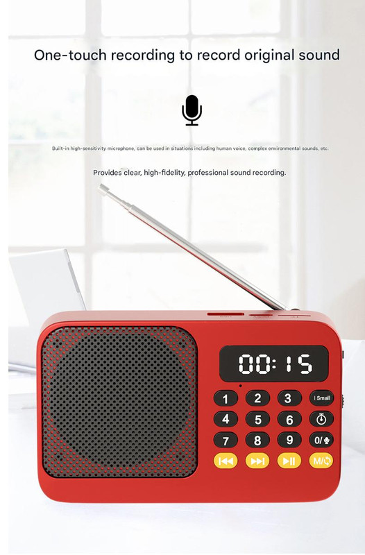 Enjoy versatile audio entertainment on the go with our Portable Digital Music Player and FM Radio. This compact and feature-rich device offers four playback modes: Bluetooth connection, TF card playback, U disk (USB drive) playback, and FM radio. Its user-friendly interface includes a clear digital display, numeric keypad for easy navigation, and dedicated buttons for various functions. Beyond music and radio, this player also features a built-in LED flashlight for convenience during night walks, camping, or power outages, a one-key voice recording function with a high-sensitivity microphone for clear audio capture, and a sleep timer for automatic shutdown. With a powerful 3600mAh battery, it’s designed for extended use. The device includes USB and Type-C ports for charging and connectivity, a TF card slot, an extendable antenna for better radio reception, volume control, and an earphone jack for private listening.