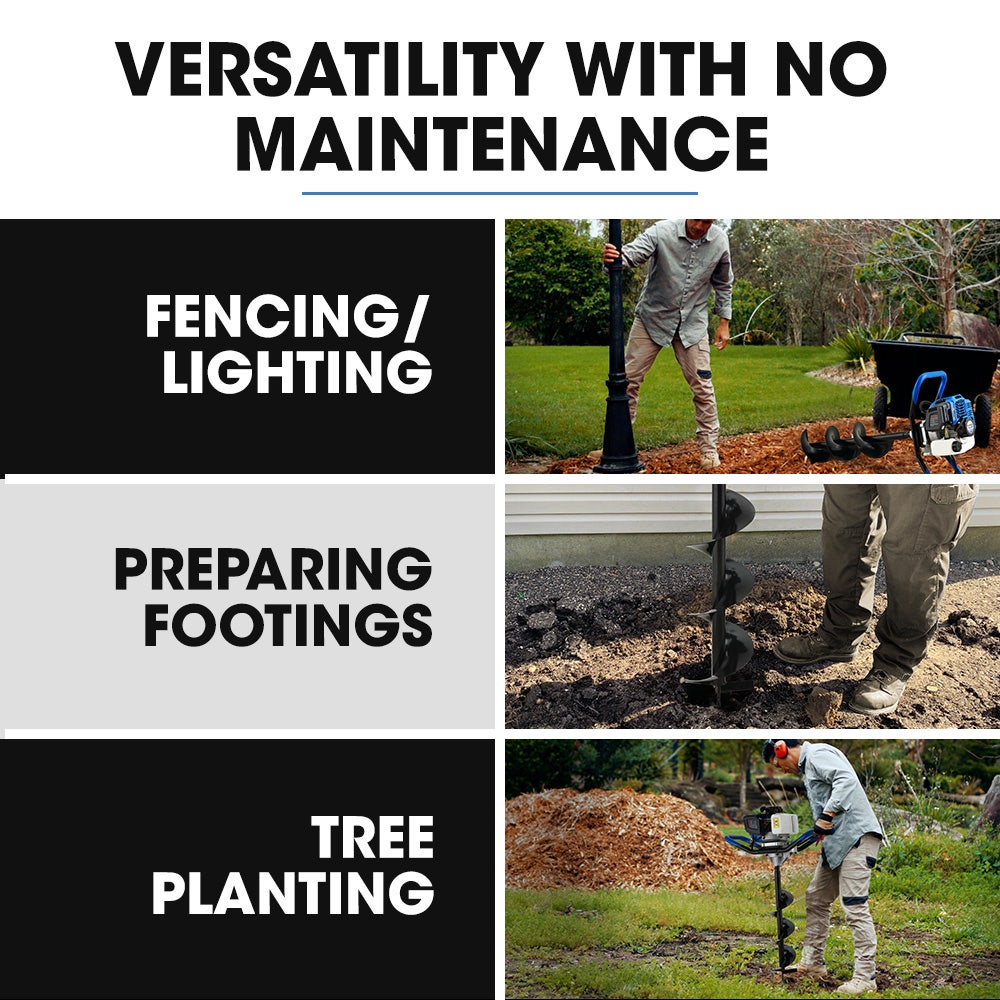 Introducing the PowerBlade PD750 2 Stroke 52cc Petrol Post Hole Digger – built to handle even the toughest digging tasks. With its high torque and easy-start 52cc engine, the PD750 delivers maximum power and efficiency. The anti-vibration vertical alignment ensures comfort and precision during operation, making it a breeze to use.