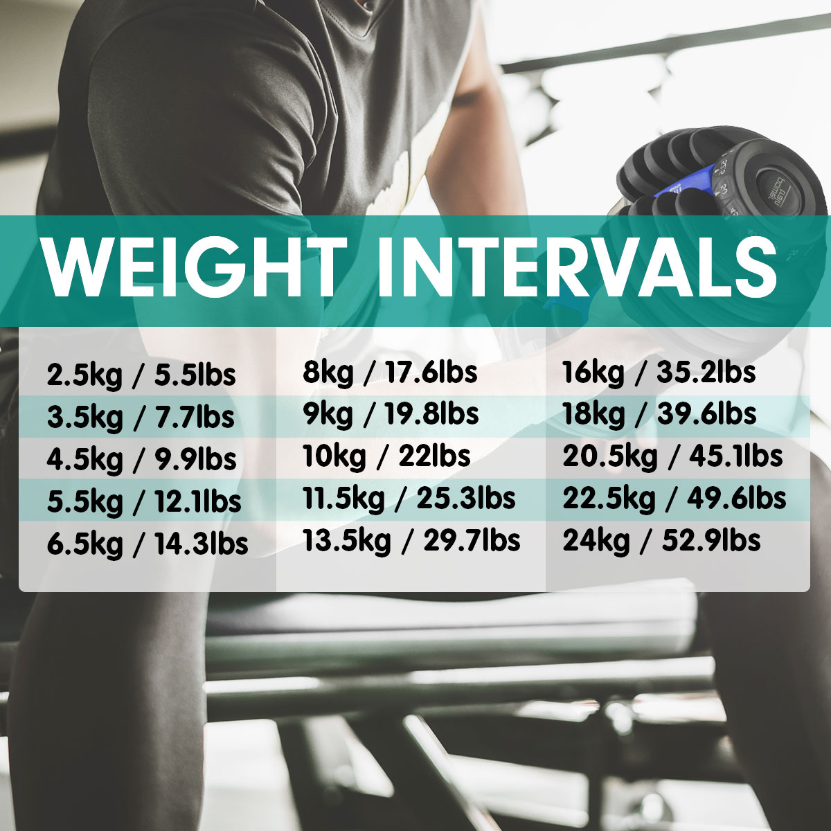 The innovative locking mechanism secures only the weights that you want, a few seconds is all it takes to change the weight of each dumbbell.