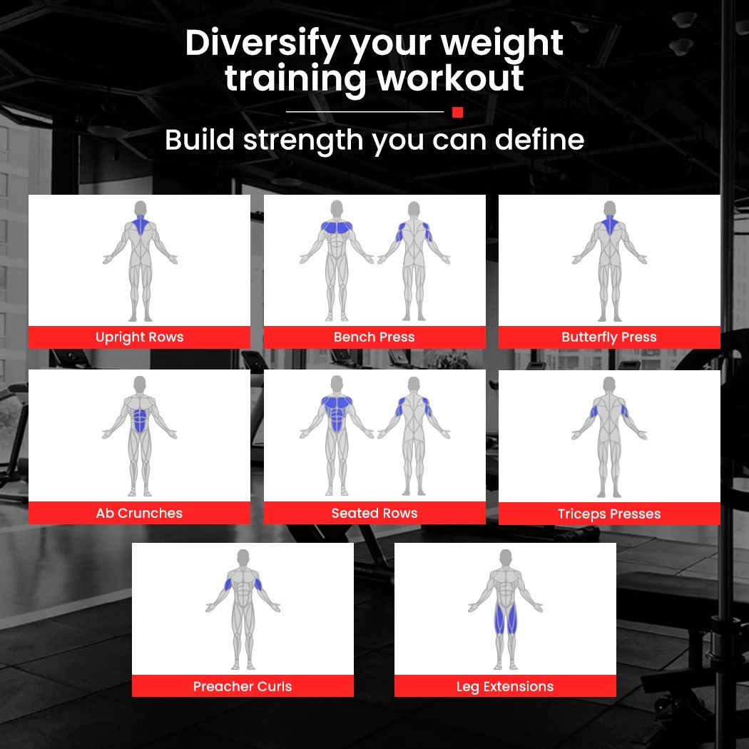 The Proflex M8000 offers a complete home workout solution, allowing you to train every major muscle group with ease. With multiple stations – including chest press, leg extension and curl, butterfly, preacher curl, lat pulldown, and seated row – you can enjoy a varied and balanced strength routine from the comfort of your own home.