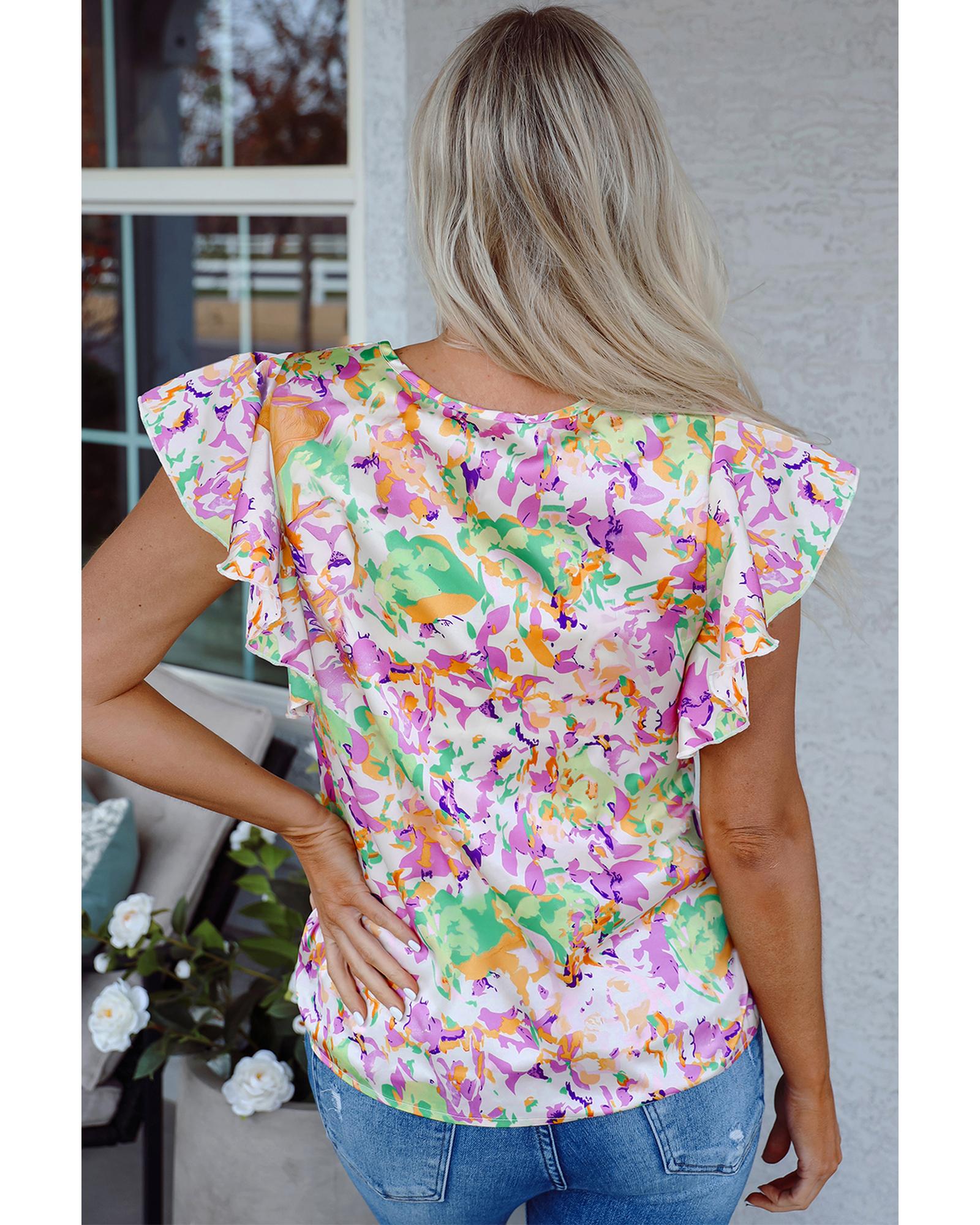 Purple Abstract Printed Ruffled Short Sleeve Notched Neck Blouse – L