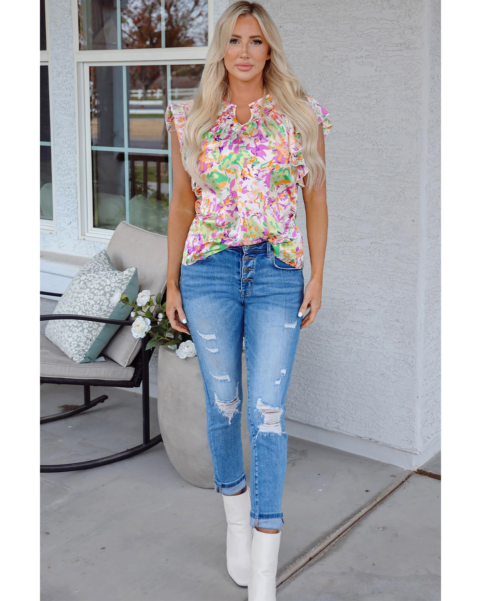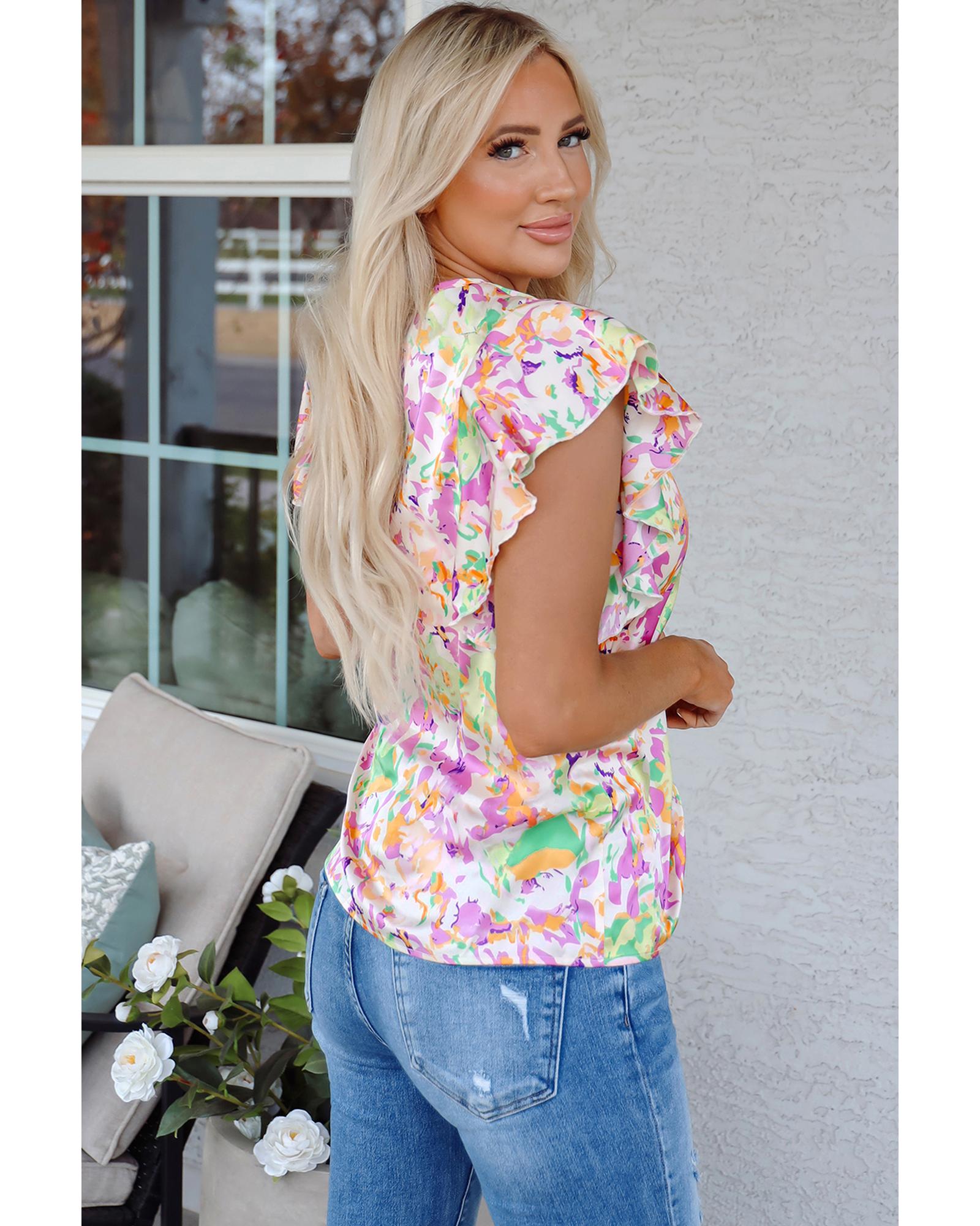 Purple Abstract Printed Ruffled Short Sleeve Notched Neck Blouse – XL