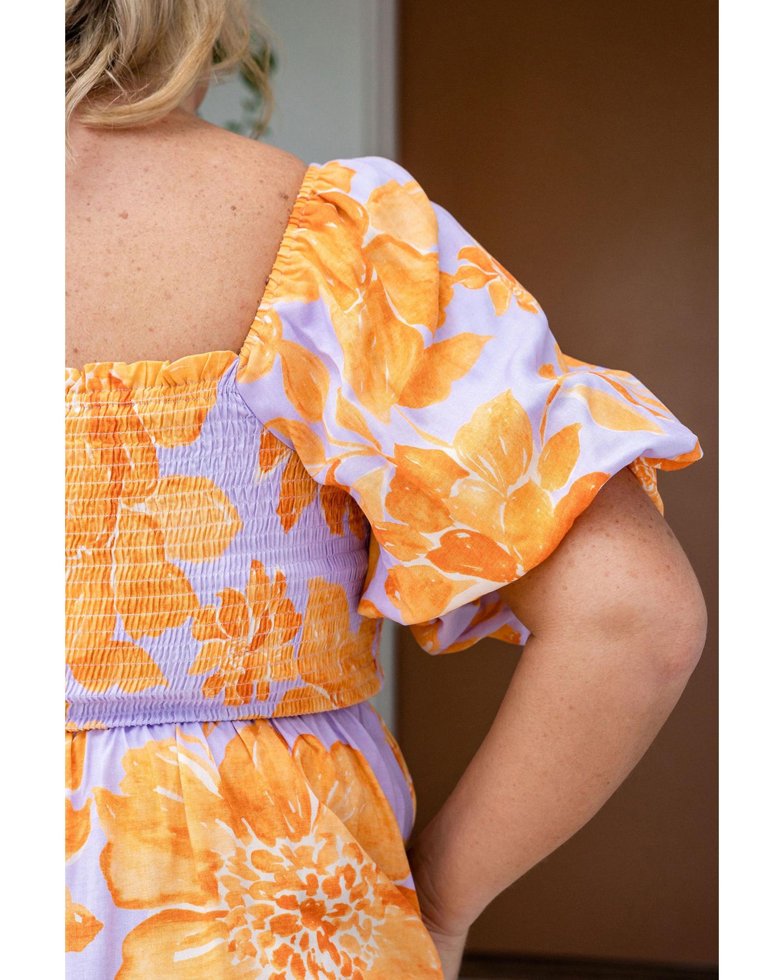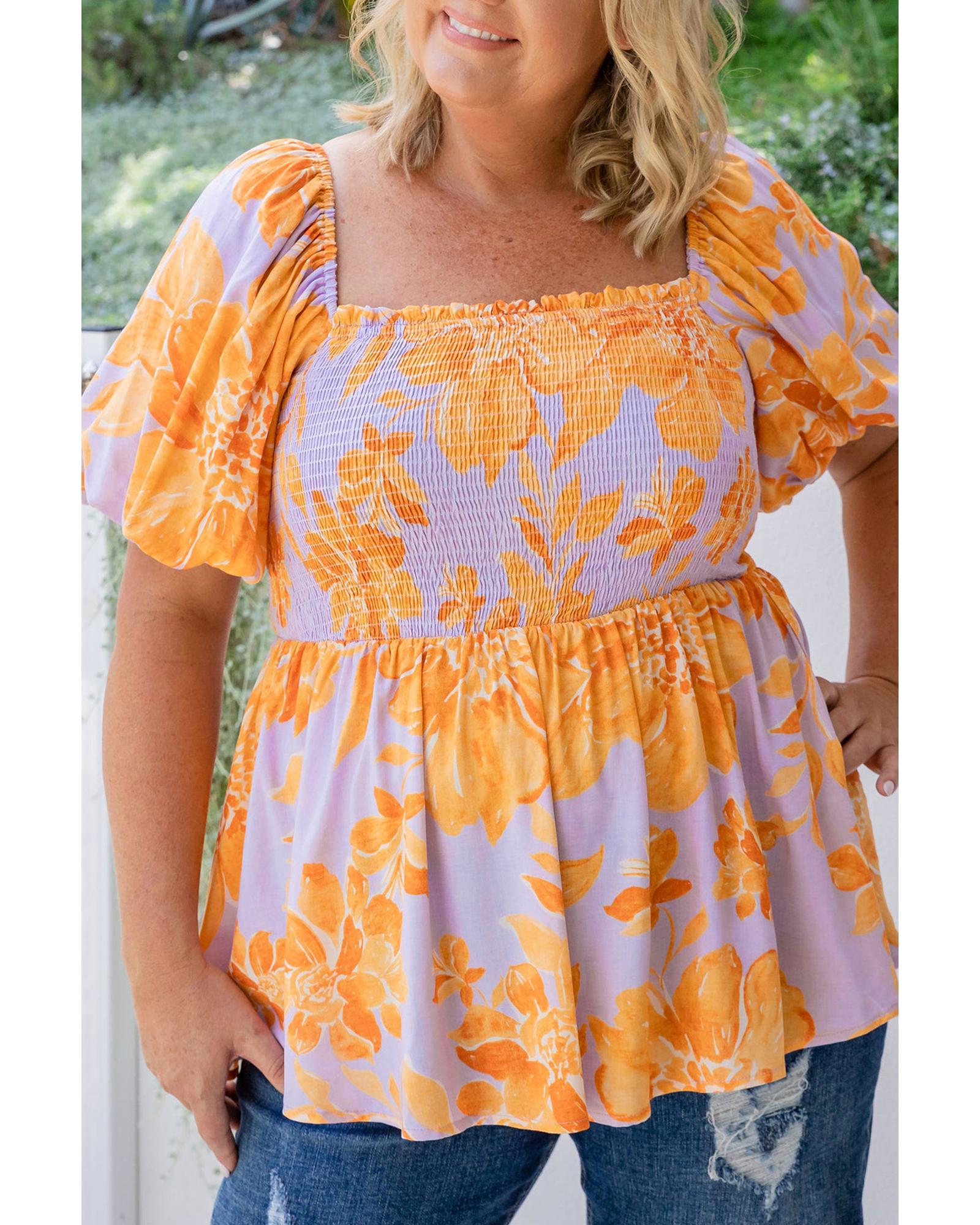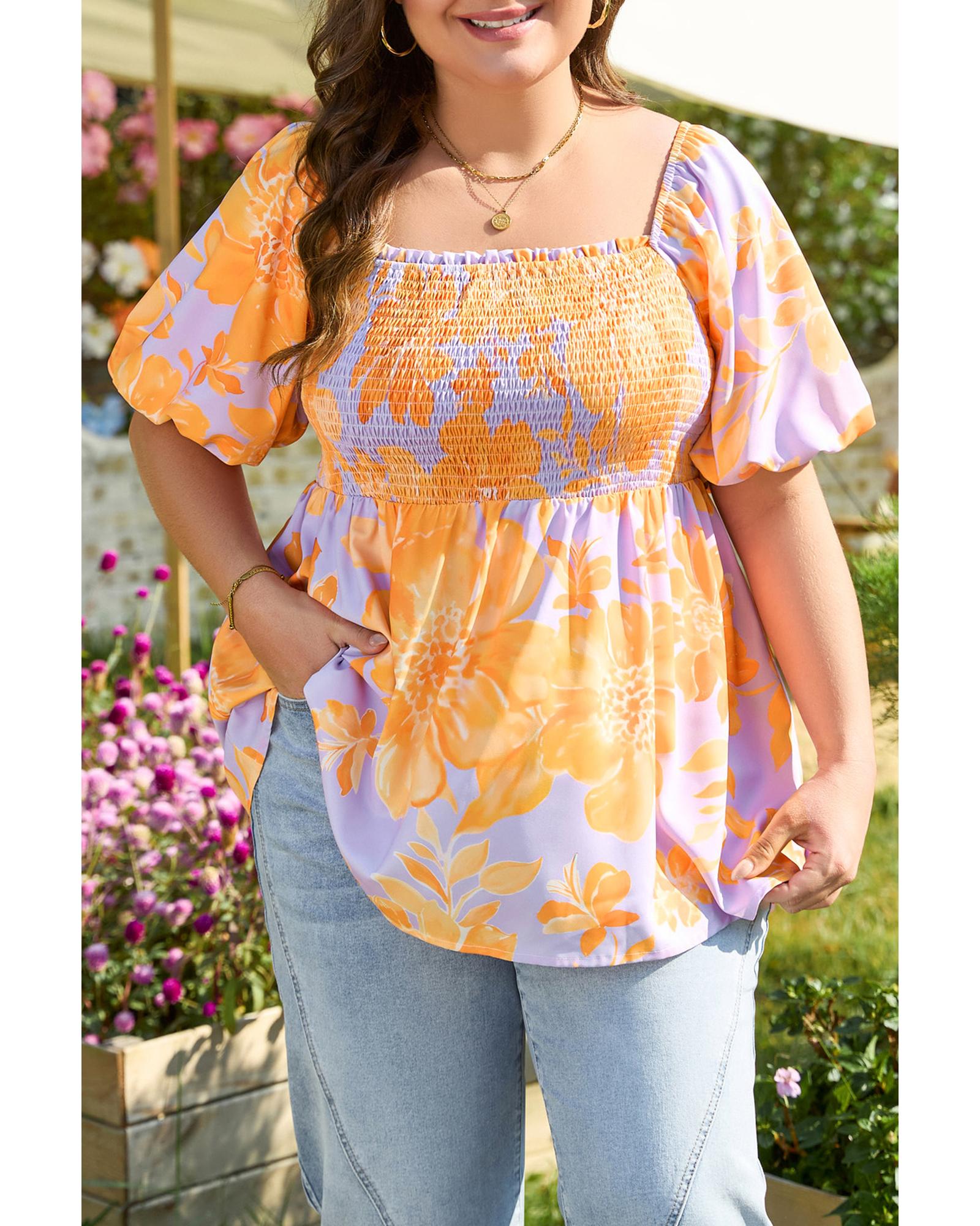 • Purple Floral Puff Sleeve Square Neck Smocked Plus Size Babydoll Blouse